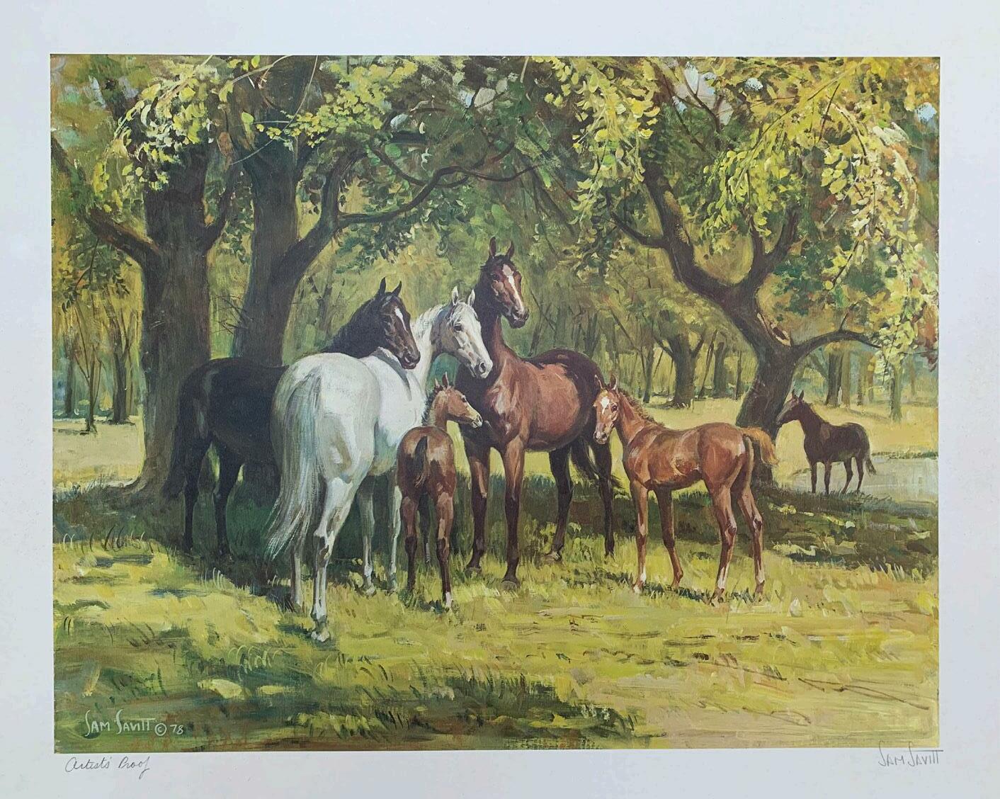 This high-quality reproduction on heavy paper stock of a painting by famed equestrian artist Sam Savitt depicts a small group of horses standing under a grove of trees. These limited edition prints were signed by the artist 44 years ago, yet they remain in perfect condition. While only 950 numbered copies were produced, the ones offered today are the much-rarer Artist’s Proofs/Publisher’s Proofs. 23”x19”. $189 including shipping.