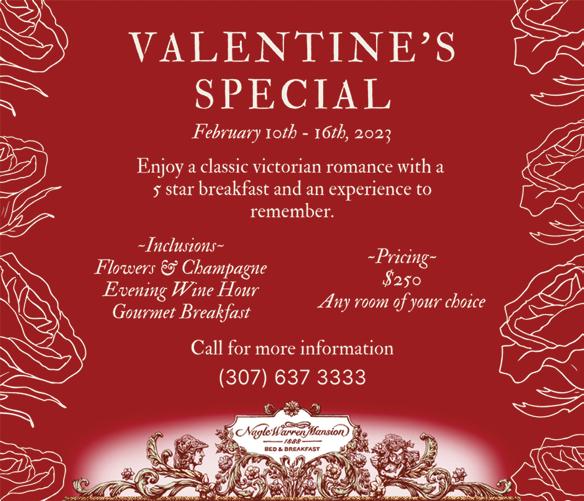 VALENTINE'S SPECIAL, FEB 10-16, 2023 ENJOY a classic Victorian romance with a 5 star breakfast and an experience to remember, includes: Flowers and champagne evening wine hour, gourmet breakfast, $250 for any room of your choice Call for more information 307-637-3333 Warren Nagle Mansion