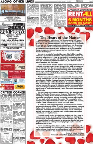 One of these legends describes the third century fertility festival known as Lupercalia, occurring in mid-February. Roman priests would sacriďŹ ce a goat, tear the hide into strips dipped in blood, and head to the streets, spanking women with them, in hopes of making them more fertile. Later the young women in the city placed their names in an urn. The young men drew out names and were then paired with their selection for one year. Many of those pairings resulted in marriage. Another tale mentions two different priests named St. Valentinus, both of whom were martyred. One was said to be a priest in third century Rome where Emperor Claudius II outlawed marriage for young men, thinking that they would make better soldiers than husbands. St. Valentinus felt that was unjust, so he continued to perform marriages in secret until he was discovered and executed. The second St. Valentinus is said to have penned a letter to his jailer’s daughter, who had visited him during his incarceration. He allegedly signed it, “From your Valentine,â€? hence the origin of the expression still used today. The next connection to romance appears about 1,000 years later when English Poet Geoffrey Chaucer penned the poem, “Parliament of Foules,â€? describing the mating ritual of birds that occurred each February. The English adopted the correlation, and over the next few centuries used February 14th as a day to write love notes to their mates. This eventually led to the mass production of paper Valentines, and the idea spread to other countries, including France, Australia, and of course, the United States. In addition to cards and paper greetings, we now shower our romantic partners with all manner of gifts. Of course, owers and candy are traditional staples, but our creativity has expanded to include a diverse assortment of unique gifts. Internet searches yield innovative items such as heart-shaped tea bags, hot chocolate on a stick that melts in milk or water, personalized bobble heads, or 3-D photo lamps. Hopefully you will avoid a gift catastrophe similar to one that a friend of mine encountered. She loves wine, but lamented about how drinking wine counteracts her weight loss attempts. On a recent Valentine’s Day, her wellintentioned husband proudly presented her with a wine glass that said something like. “Inside me is a skinny woman trying to get out, but I keep her quiet with a glass of wine.â€? Here’s some friendly advice: before you head down the disastrous path that my friend’s husband took, you’d be much better off to run to the supermarket and snag those owers, or that heart-shaped candy box. You certainly don’t want a Valentine’s Day reminiscent of ancient times! Written by Loretta McCollum Comments and Feedback: darthmom91@gmail.com