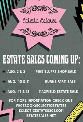 ESTATE SALES COMING UP: AUG 2-3 Pine Bluffs Shop Sale, Aug 10-11 Burns Farm Sale Aug 17-18 Maxfield Estate Sale For more information check us out on Facebook or eclec ticestates307 com, estate sales net Brought to you by Eclectic Estates