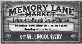 MEMORY LANE MARKET, ANTIQUES, NOSTALGIC, c a n d i e s , g i ft s , c o l l e c t ab l e s I g n o re ro a d c o nstruction we're still open! 617 W Lincolnway, TuesSat 10am-5pm, Sun 12pm4pm