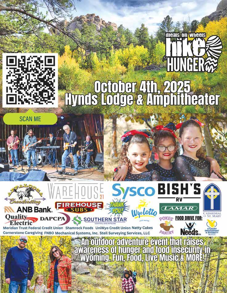 Meals on Wheels will host Hike Hunger WY on October 4 from 11:00am until 5:00pm at the Hynds Lodge and Amphitheater. This will be an outdoor adventure event that raises awareness of hunger and food insecurity in Wyoming. This event will include two guided hikes through the beautiful trails of the Medicine Bow National Forest on a half mile loop trail called the Beaver Creek Trail and fall family photos near the aspen grove. Register at www.meals onwheelsofcheyenne.com/hike-hunger-wy-2025