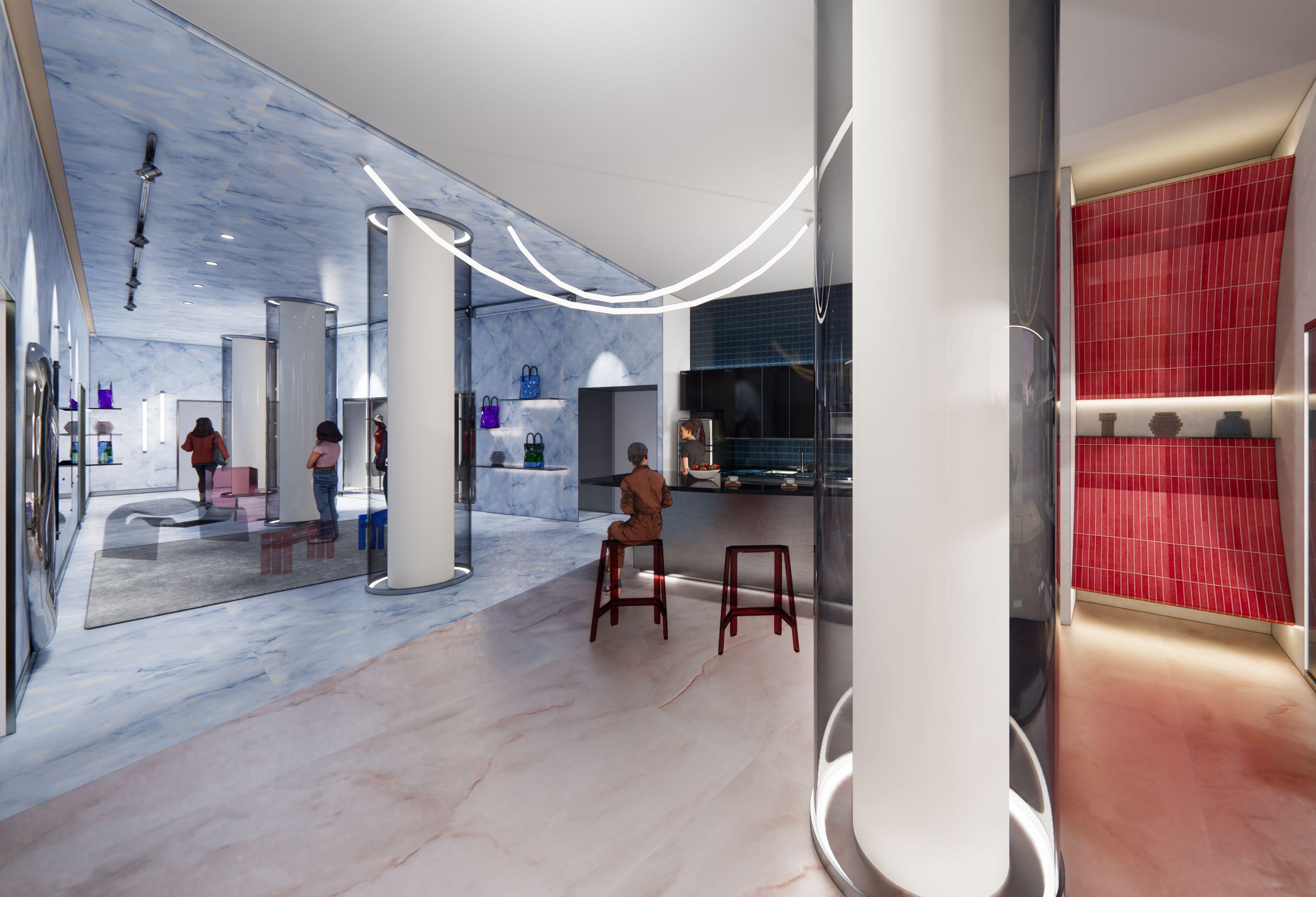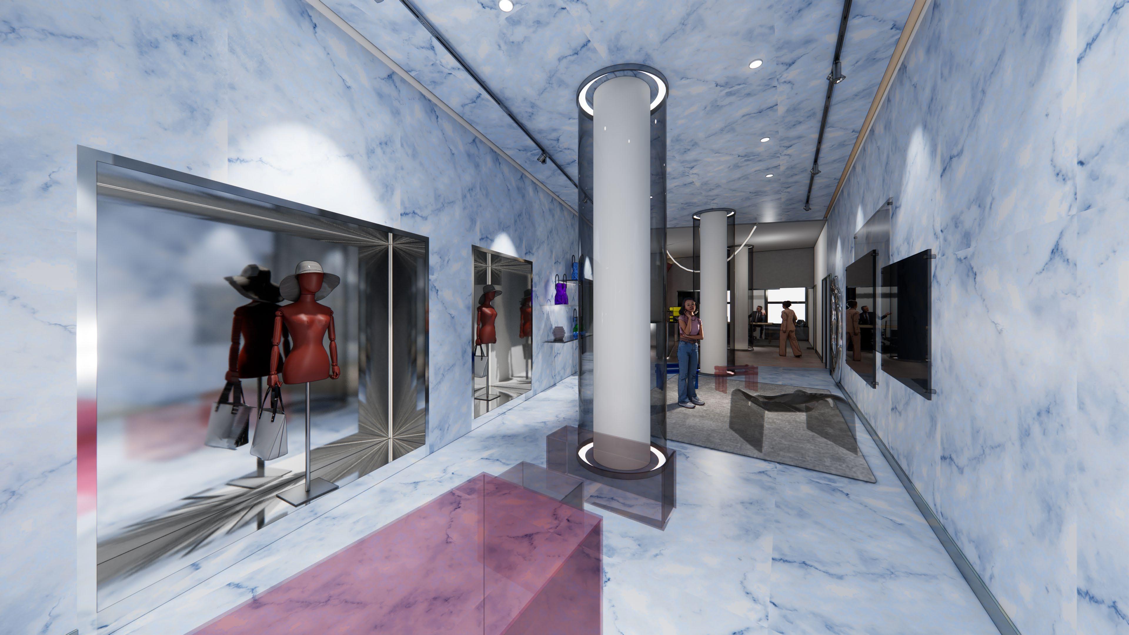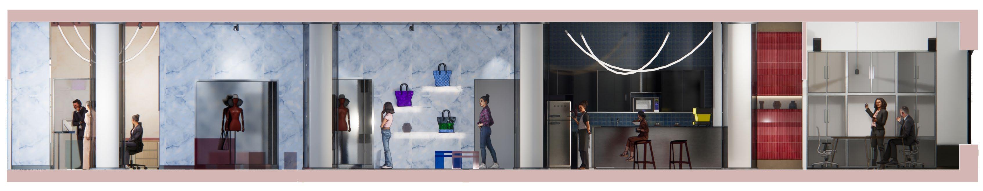 The design of the store will followed the philosophy of the brand that " Carrying on the spirit of making things unbound by convention" to " introduces new ways of thinking into traditional techniques, realizes ideas that reflect moden times, and passes this on to the future." Display areas for clothing, bags, and customer lounges are needed.