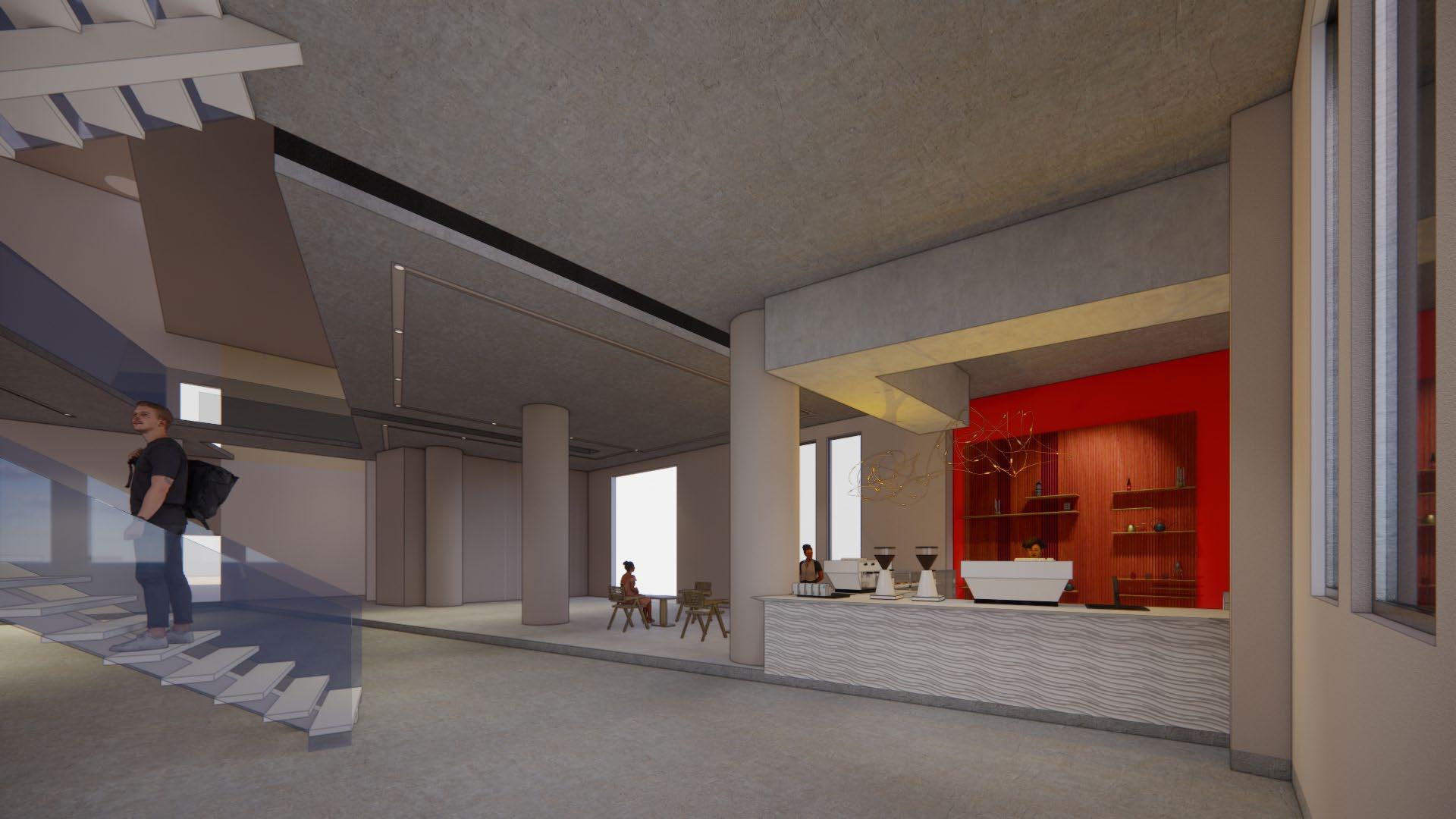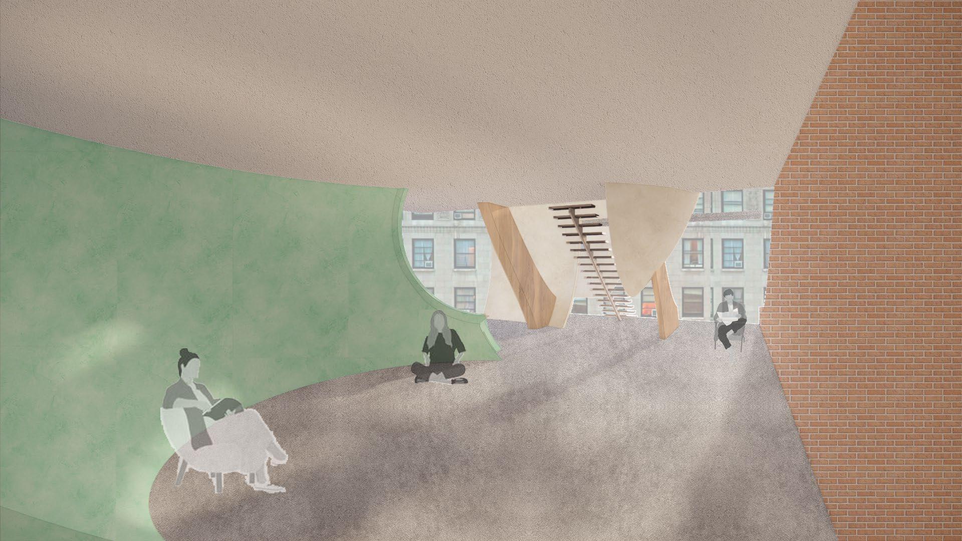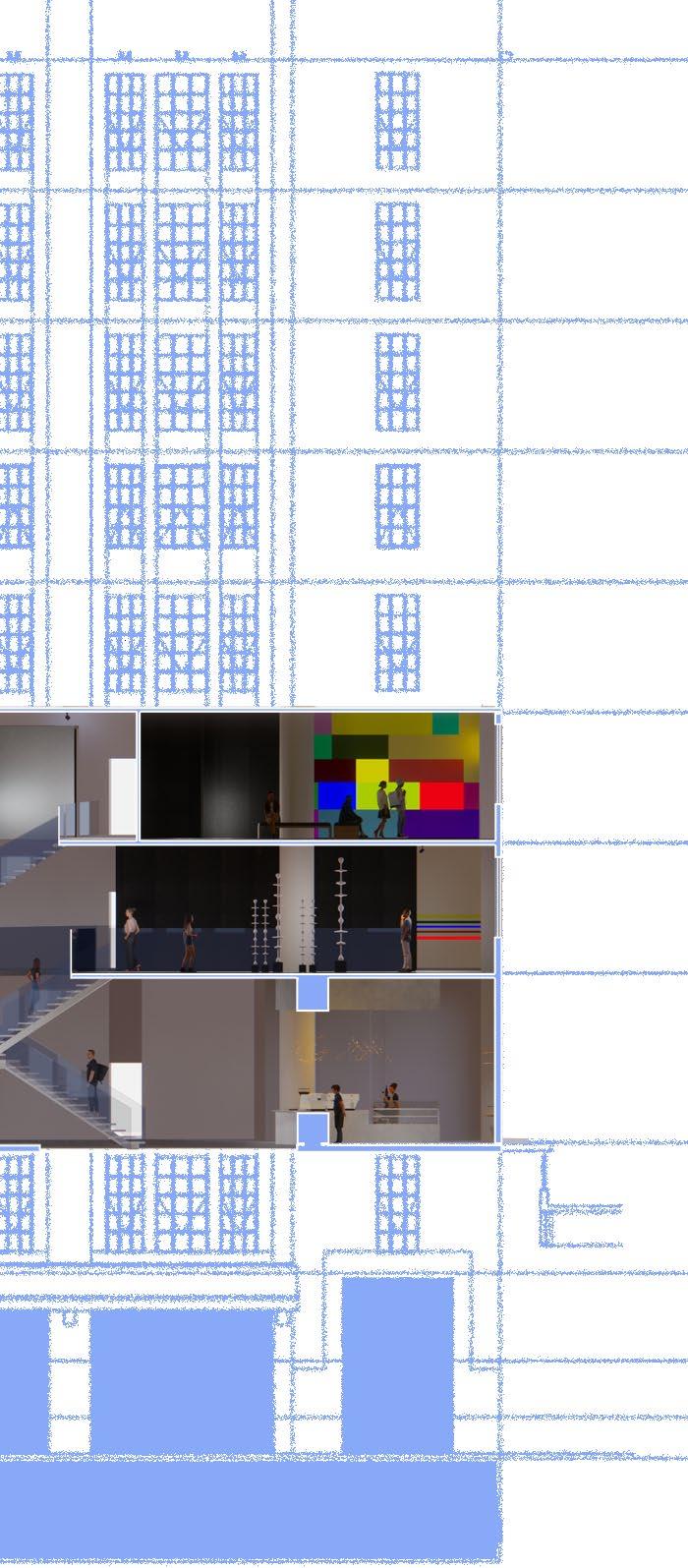 Flexible booths are set upon the fouth floor staircase to provide temporary exhibitions for different artists, and the cafe on the third floor is located at High Line entrance to make it more convenient for people to reach the cafe.