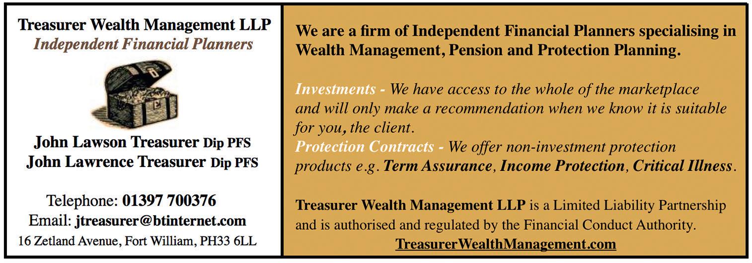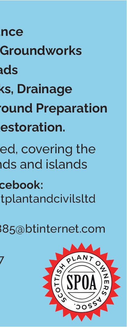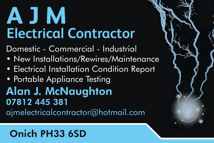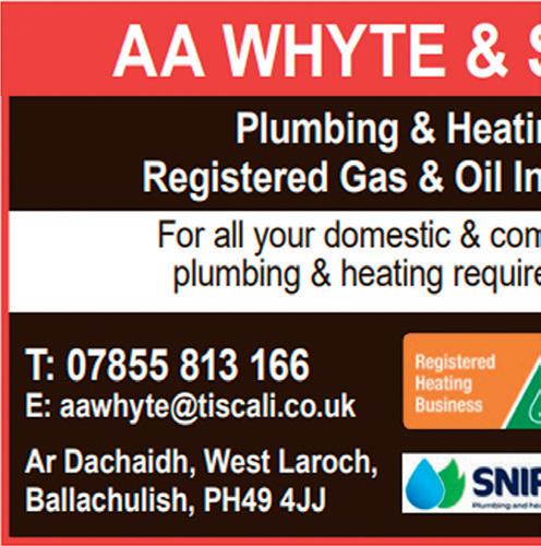 LOCHABER LIFE | 5 With over 35 years experience, the G&A Barnie Group is committed to premiere quality workmanship. No job too big or too small. • Mechanical, Electrical and Plumbing • Gas & Oil Servicing and Maintenance • Gas Suppression, Sprinklers, Mist Systems • Fire, Security & CCTV • Industrial Auto Doors • Automated Gates & Barriers • Renewable Energy Systems • Water Treatment Services • Motors Gearboxes Generators • Industrial Automation P.L.C Mechanical & Electrical Services www.gabarnie.co.uk Fort William 01397 933 111 Branch Manager - Craig Macpherson
