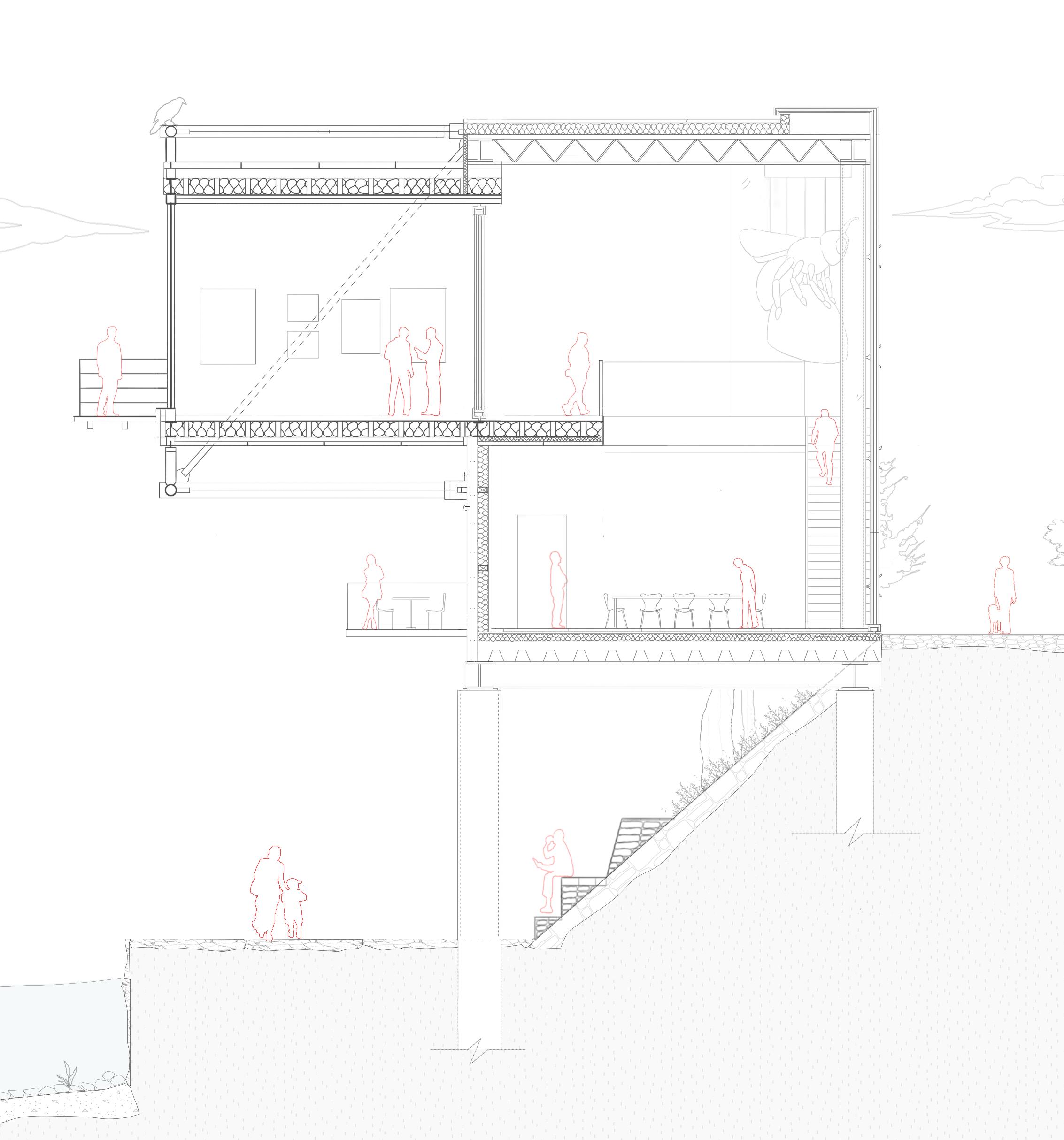 Envisioning a powerful response to this complex tapestry, our proposal introduces the “Black Axis,” a monumental structure standing fifty meters tall—an architectural ode commemorating the extinct species of the Anthropocene. Nestled on the museum’s forecourt, this exotic monument beckons contemplation on the intricate dance between humans and the non-human realm. As you ascend the axis, adorned with the heads of the extinct, you engage in a mental reversal—a recalibration of the traditional human-centric gaze. At its zenith, Paris and the iconic Eiffel Tower come into view, symbolic of the Anthropocene’s inception. Welcome to the Anthropic Epoch Remembrance—a manifesto manifested in structure, beckoning reflection and metamorphosis.