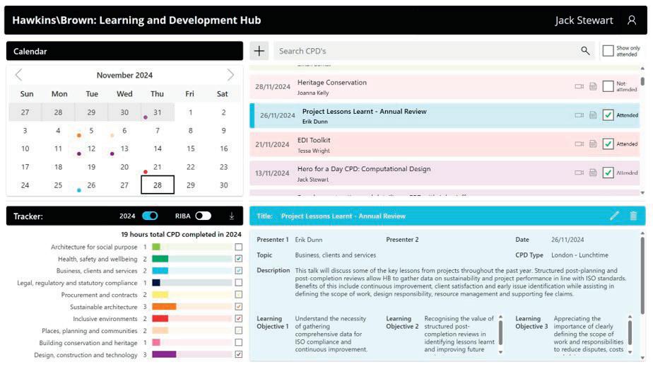 The third hero, in response to ARB and RIBA requirements to document CPD activities, developed an app to list, calendarise and track activities and attendance. This team’s app allowed users to easily download attendance records and access linked recordings and presentations.