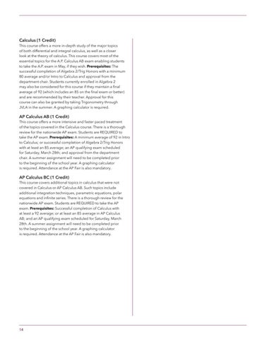 Calculus (1 Credit) This course offers a more in-depth study of the major topics of both differential and integral calculus, as well as a closer look at the theory of calculus. This course covers most of the essential topics for the A.P. Calculus AB exam enabling students to take the A.P. exam in May, if they wish. Prerequisites: The successful completion of Algebra 2/Trig Honors with a minimum 80 average and/or Intro to Calculus and approval from the department chair. Students currently enrolled in Algebra 2 may also be considered for this course if they maintain a final average of 92 (which includes an 85 on the final exam or better) and are recommended by their teacher. Approval for this course can also be granted by taking Trigonometry through JVLA in the summer. A graphing calculator is required.