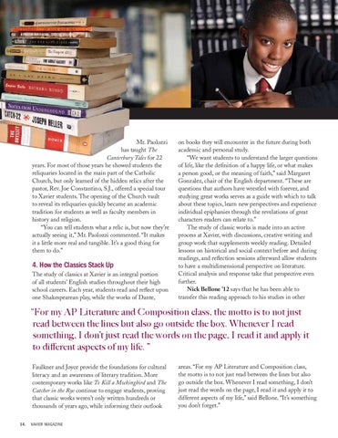 on books they will encounter in the future during both academic and personal study. “We want students to understand the larger questions of life, like the definition of a happy life, or what makes a person good, or the meaning of faith,” said Margaret Gonzalez, chair of the English department. “These are questions that authors have wrestled with forever, and studying great works serves as a guide with which to talk about these topics, learn new perspectives and experience individual epiphanies through the revelations of great characters readers can relate to.” The study of classic works is made into an active process at Xavier, with discussions, creative writing and group work that supplements weekly reading. Detailed lessons on historical and social context before and during readings, and reflection sessions afterward allow students to have a multidimensional perspective on literature. Critical analysis and response take that perspective even further. Nick Bellone ’12 says that he has been able to transfer this reading approach to his studies in other