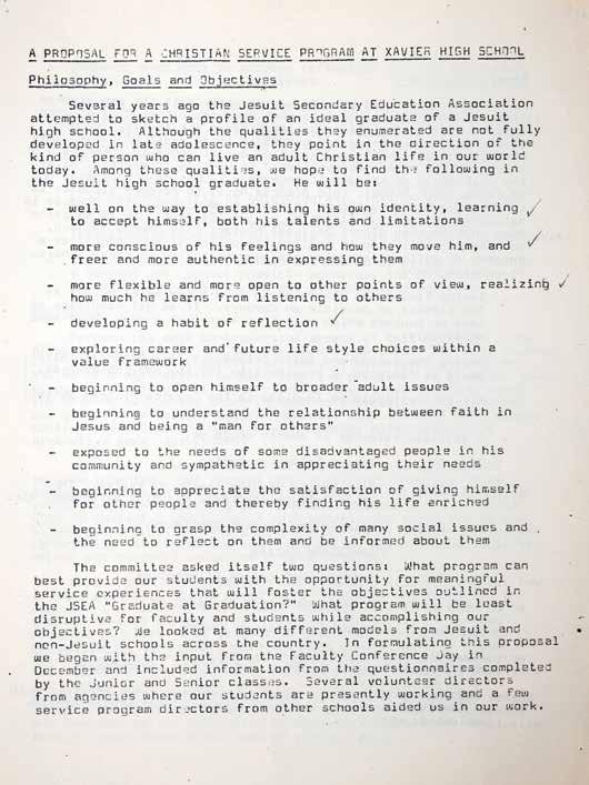 “It is Xavier’s hope that through direct personal contact with people in need, each senior will come to realize his potential and talents as a person as well as recognize his responsibility to serve others,” the committee’s proposal, pictured here, noted. “We agree with educators at the University of Vermont who feel that in a culture that is growing excessively obsessed with the self, young people today need to transcend themselves in achieving their identities, to commit themselves to causes and persons greater than their individual egos.”
