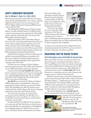 HAP’s GREATEST BELIEVER Rev. D. Michael J. Flynn, S.J. 1941–2012 More than 30 years after he left 16th Street, the legacy of the late Rev. D. Michael Flynn, S.J., endures at Xavier High School. The Jesuit who was synonymous with Xavier’s Higher Achievement Program (HAP) passed away on July 27, 2012. “He embodied the HAP program. It had no greater believer,” said Rev. Donald Gannon, S.J. HAP provides academic and extracurricular enrichment for 7th and 8th graders regardless of financial status. Its mission fit Fr. Flynn’s gifts and talents perfectly. HAP was founded in 1964 at Saint Peter’s Prep in Jersey City, N.J.; its spread would dramatically reshape the socioeconomic makeup of Jesuit secondary schools. At Xavier and many other schools, HAP is a life changing experience. Last summer, more than 200 young men took part and were introduced to Xavier teachers, students and fellow participants throughout New York City. A gifted and loving pastor, Fr. Flynn headed numerous parishes serving primarily Hispanic communities. He spent many summers in Santiago, Chile immersed in the culture and Spanish language, which supported his outreach work in New York. Fr. Flynn was also a member of Xavier’s religious education department from 1972–1980, and he witnessed the way HAP opened Jesuit schools up to diversity. Countless alumni like Joe Nardiello ’80 recalled the Jesuit’s compassion, humor and concern for young people from underprivileged backgrounds. “He was incredibly personable,” Mr. Nardiello said. “He had the perfect balance of goodness and humility.” Ken Ng ’80 was recruited by Fr. Flynn into Xavier’s HAP program prior to attending Xavier. Years after graduation, he and his wife, Lucy, reconnected with Fr. Flynn. The friendship led to Mr. Ng’s baptism in the Catholic Church, with Fr. Flynn as his sponsor. A familial relationship continued until Fr. Flynn’s passing. “Lucy and I discovered that he made everyone feel special and loved,” Mr. Ng said. “Fr. Flynn was a wonderfully concerned and loving man with enormous capacity to care for others.” Fr. Flynn left Xavier in 1980 and served as director of vocations for the New York Province of the Society of Jesus until 1986. He was named director of the Hispanic Lay Leadership Program in 1997. He also served as pastor of Nativity Church on Manhattan’s Lower East