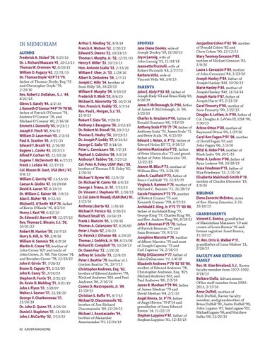 SPOUSES Jane Diane Dooley, wife of Joseph Dooley ’59, 11/30/15 Joyce Lannig, wife of John Lannig ’51, 11/14/14 Jeannette Piccirelli, wife of Robert Piccirelli ’48, 2/27/15 Barbara Vella, wife of Vincent Vella ’48, 5/6/15 PARENTS John E. Kiely P’63 ’65, father of Joseph Kiely ’63 and Brian Kiely ’65, 8/24/15 James P. McDonough, Sr. P’66, father of James P. McDonough, Jr. ’66, 3/23/15 Charles A. Graziano P’66, father of Ronald Graziano ’66, 7/19/15 Anthony Scala P’70 ’71 ’74, father of Anthony Scala ’70, James Scala ’71, and Peter Scala ’74, 4/22/09 Edward J. Nolan, Jr. P’72, father of Edward Nolan III ’72, 9/16/15 Carmine Maniscalco P’72, father of Peter Maniscalco ’72 and grandfather of Peter Maniscalco ’00, 12/22/15 Jeanne M. Bliss P’73, mother of William Bliss ’73, 1/24/16 John A. Caulfield P’73, father of Bruce Caulfield ’73, 12/15/15 Virginia A. Bannon P’74, mother of Michael C. Bannon ’71, 11/26/14 Carole Finamore P’75 ’79, mother of Robert Cramer ’75 and Kenneth Cramer ’79†, 6/27/15 Archibald E. King, Jr. P’75 ’77 ’80 ’86, father of Archibald King ’75, George King ’77, Charles King ’80, and Rev. Andrew King ’86, 8/19/15 John T. Brennan P’75 ’79, father of Patrick Brennan ’75 and Sean Brennan ’79, 9/1/15 Josephine Marotta P’76, mother of Albert Marotta ’76 and aunt of Joseph Capezza ’73 and Carl Capezza ’74, 2/16/15 Philip DiGiacomo P’77, father of John DiGiacomo ’77, 1/4/16 Elizabeth Andrews P’78 ’82 ’85 ’86, mother of Edward Andrews ’78, Christopher Andrews, Esq. ’82†, Michael Andrews ’85†, and Paul Andrews ’86, 2/3/16 James B. Meehan P’79 ’84, father of James Meehan ’79 and David Meehan ’84, 2/1/15 Angel Rivera, Sr. P’79, father of Angel Rivera ’79 P’14 and grandfather of Sean Edward Rivera ’14, 11/22/15 Stephen Luppino P’81, father of Stephen Luppino ’81, 12/10/15