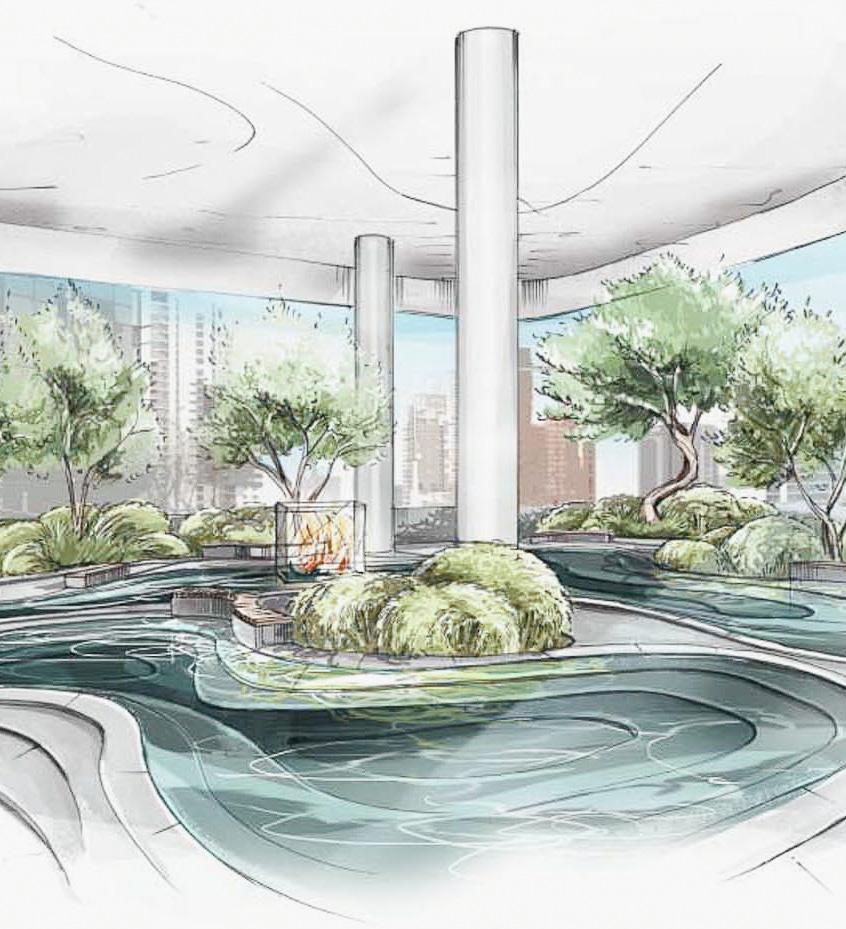 Development of an idea around curves: visiting this urban mall will be a whole experience, in this space people will be able to relax, rediscover the nature, the sound of the water, the freshness of a waterfall or a pond. From curves inspired by rice paddies we have developed this garden suspended over two floors in the middle of a mall.