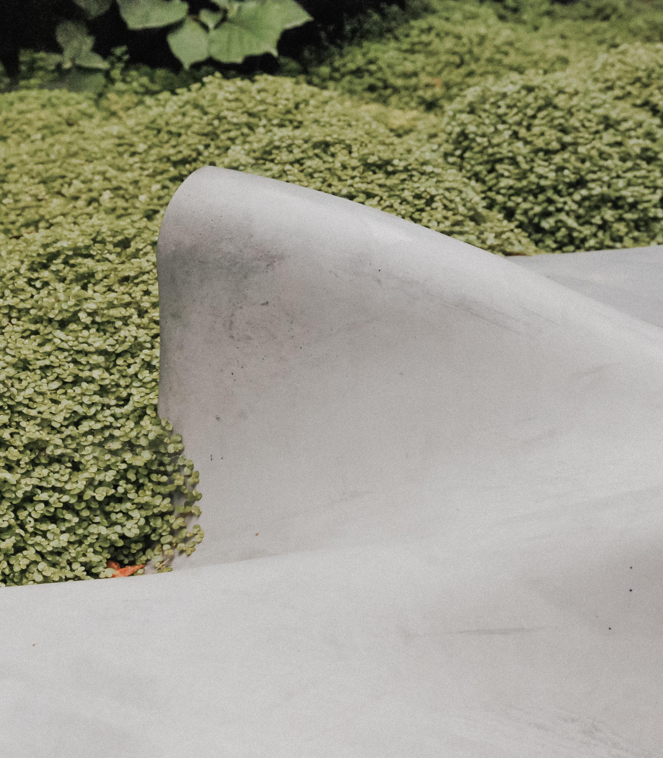 Modern treatment of a curved bassin nestled in vegetation. Organic, biological shapes concept.