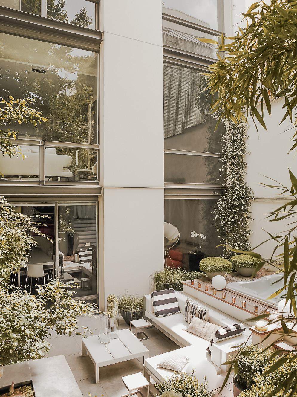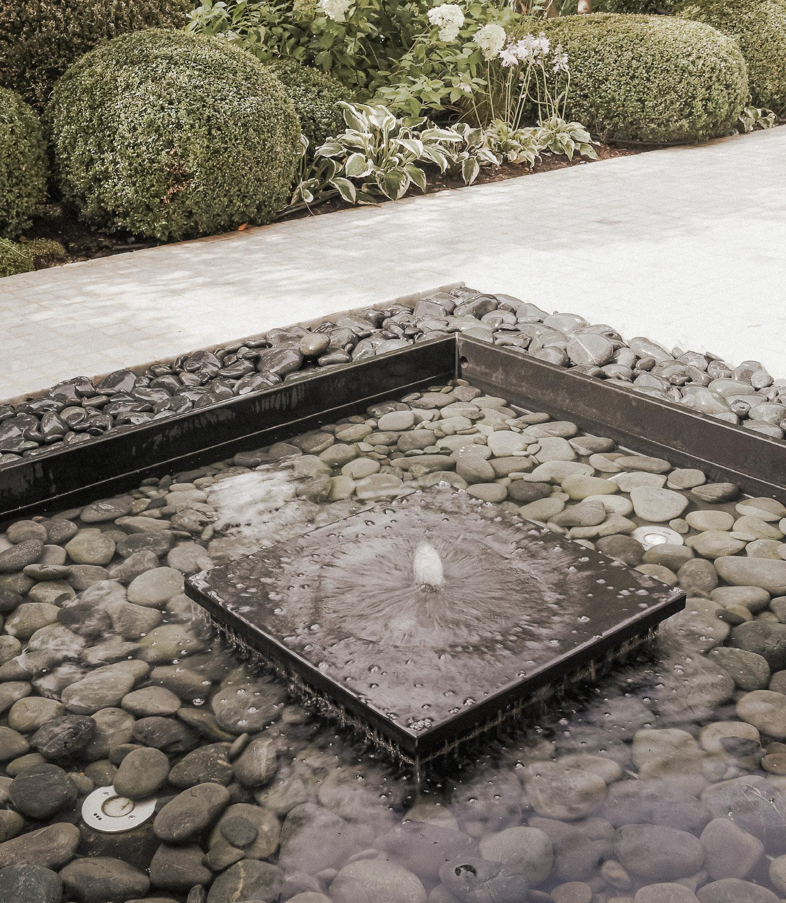 An alternance of shapes and curves given by a spectacular boxwood structure and this very graphic black fountain settled on a white floor, are turning the patio into a welcoming retreat.