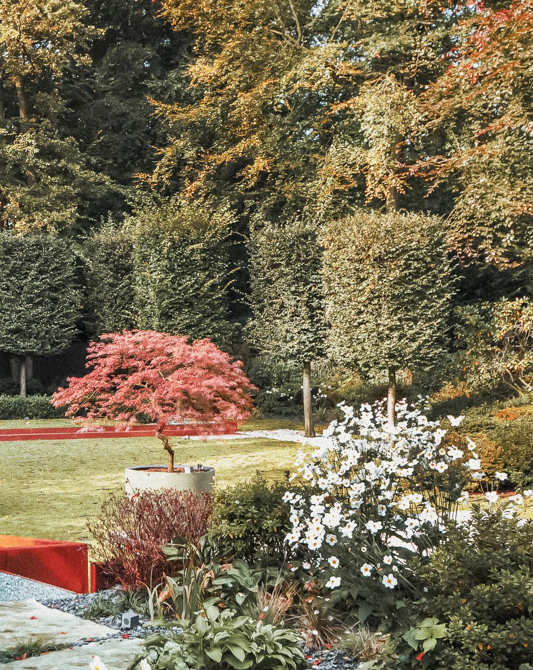 We used some specific features that we often work with, vegetal labyrinth, oversized pots, beautifully shaped and trimmed trees from around the world for the clients to discover and experience first-hand the impact that these elements can have on any landscape.