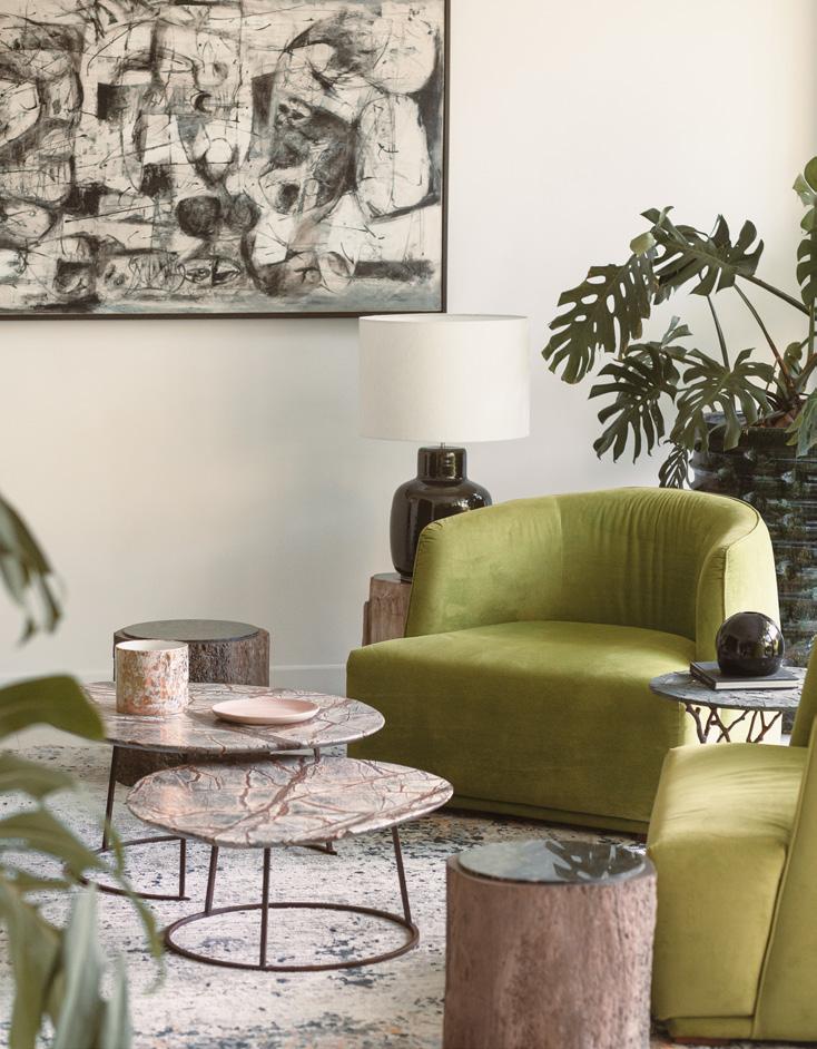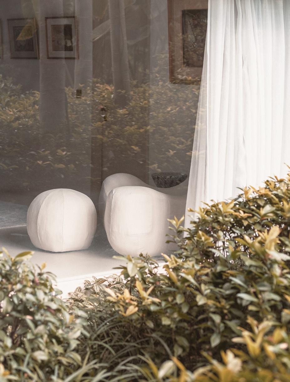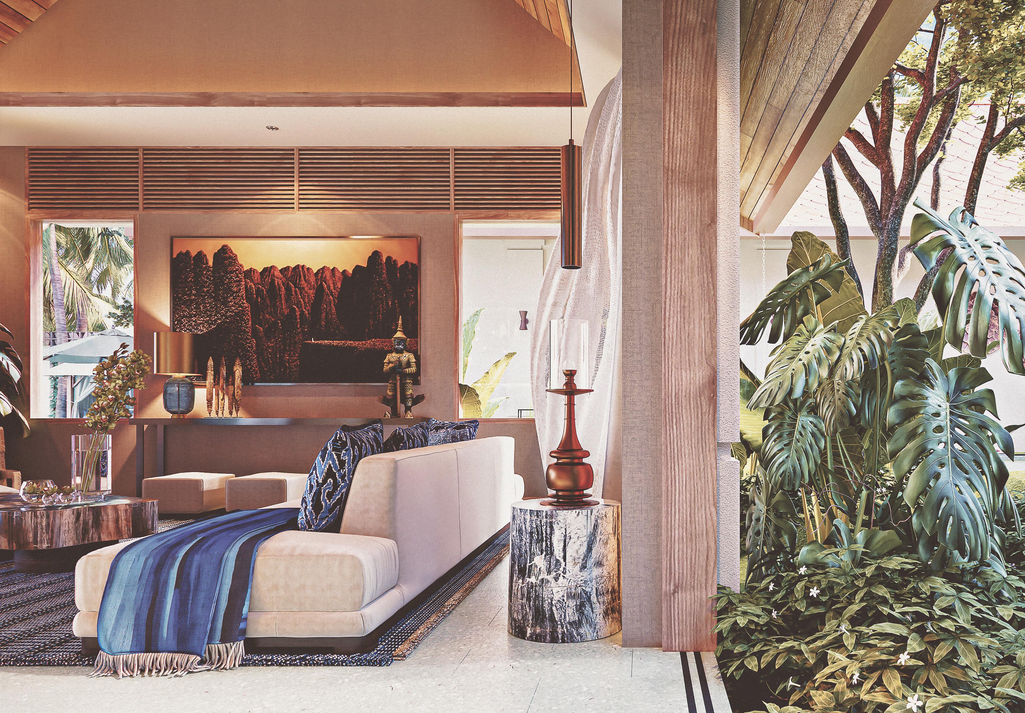 The ambiance is enriched by the well-chosen furniture composition: a mix of sober-lined, comfortable, deep sofas and individual seating suggesting organic tropical life.