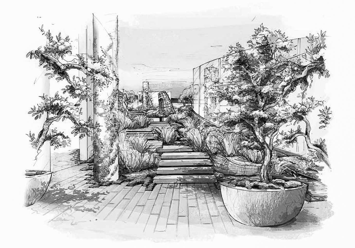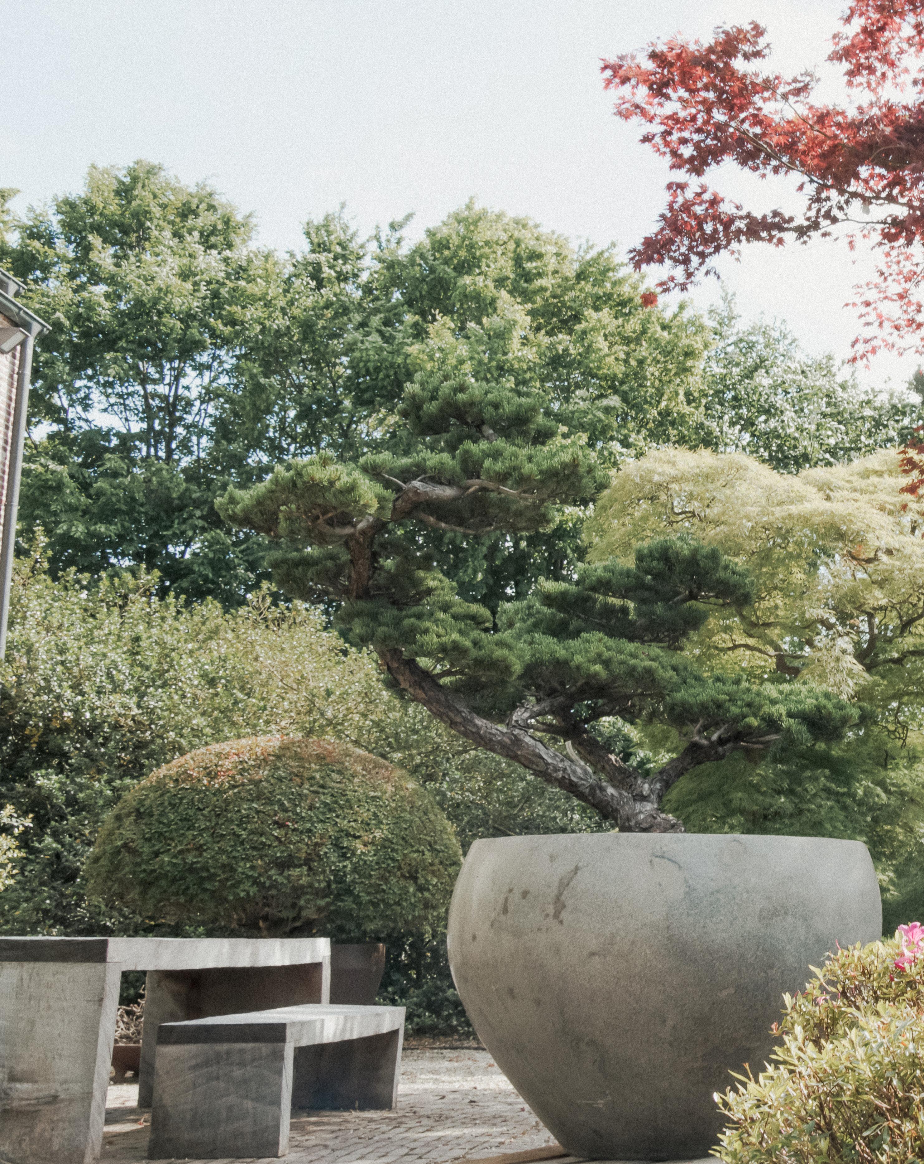Mix of organic form with trees & our collection of pots in waves.