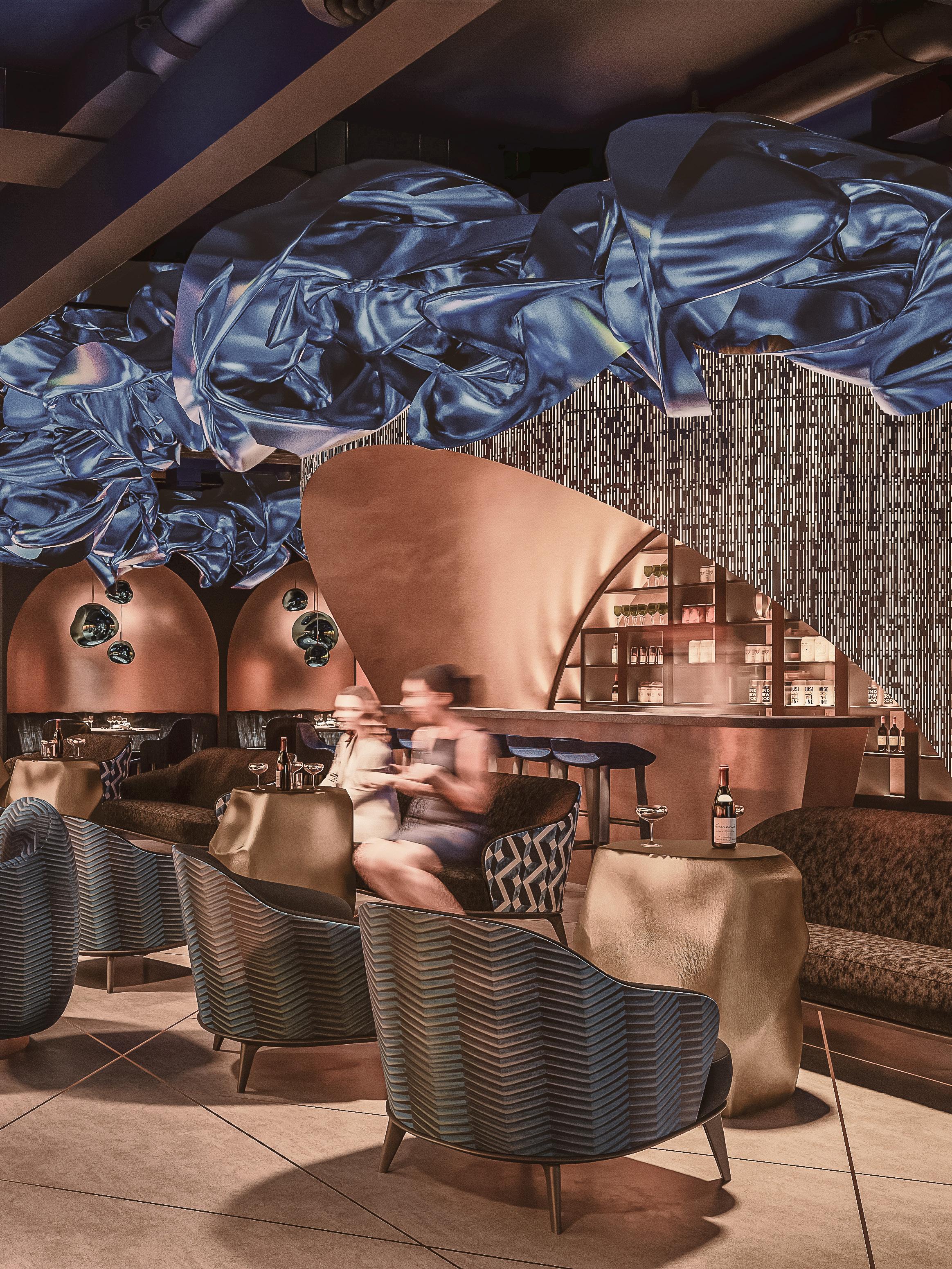 By contrast with the “masculine” esthetics of the bar and restaurant, the restrooms will provide a “feminine” boudoir ambiance (marble, fine fabrics and colors, scented candles, soft organic lighting etc.)