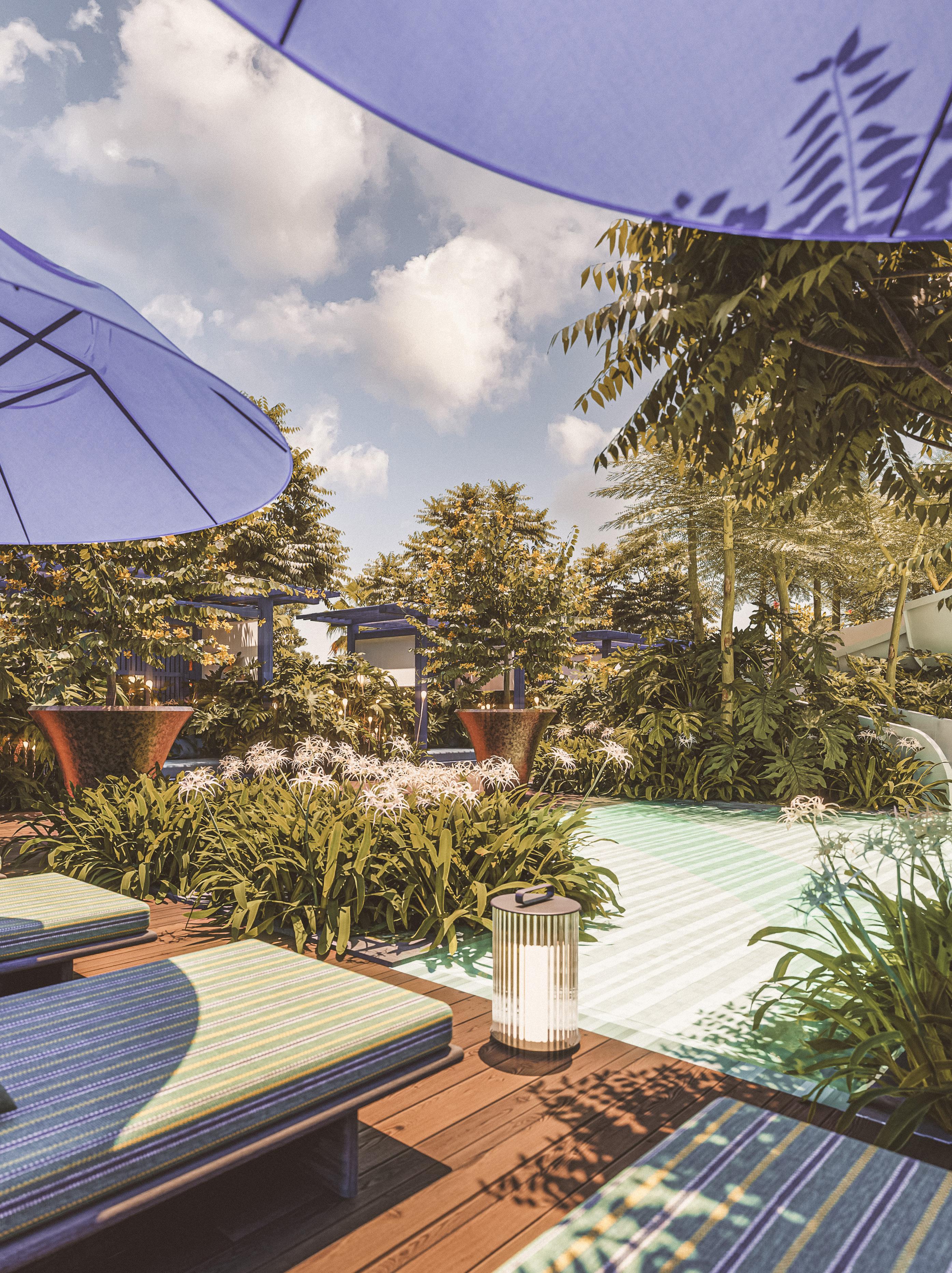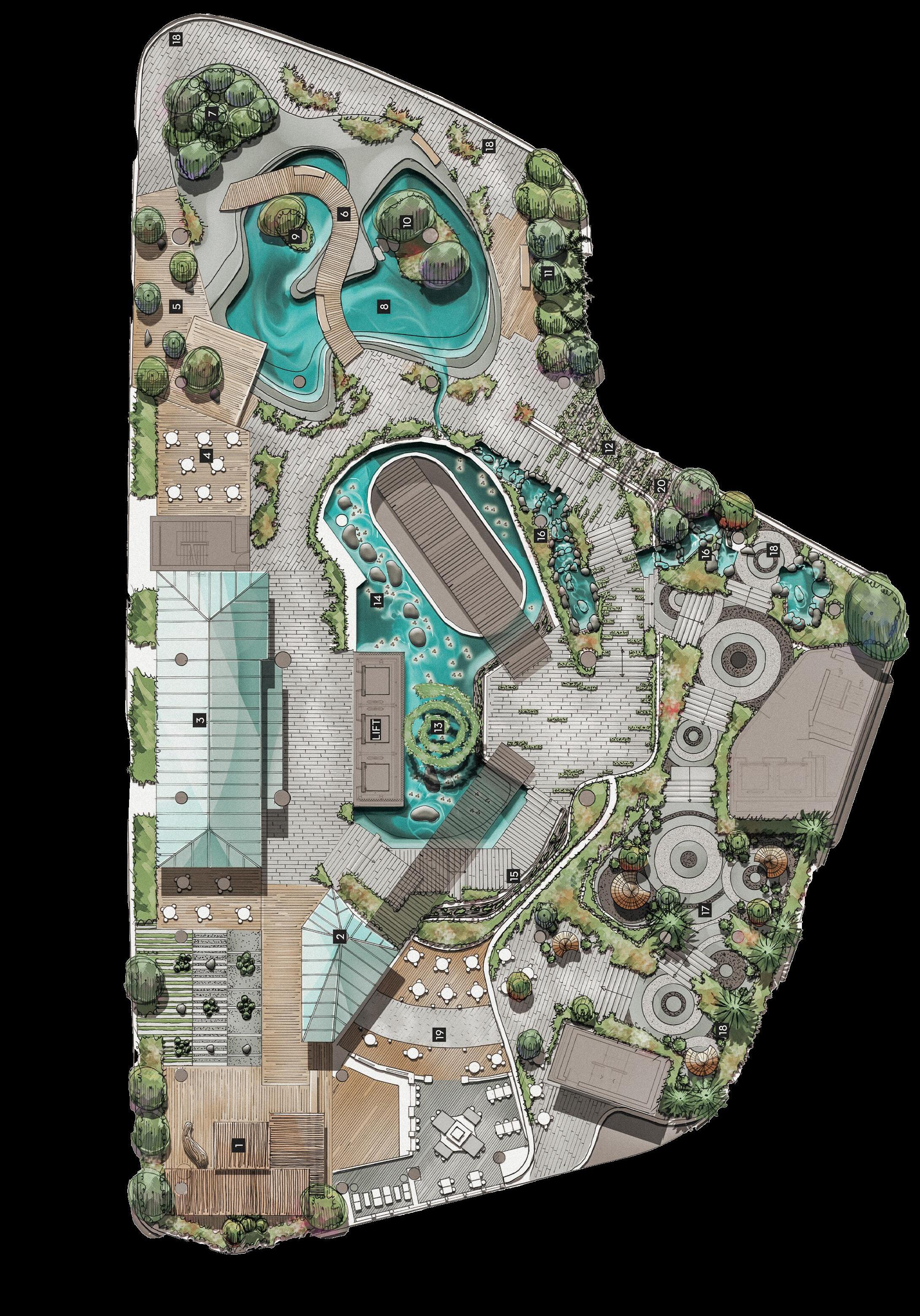 Palms and lush shrubs around the swimming pool will create a tropical scenery and guests will instantly feel the change of atmosphere. The green mosaic tiles will further transport the visitors inviting them to enjoy the pool with the impression of swimming in a lagoon.