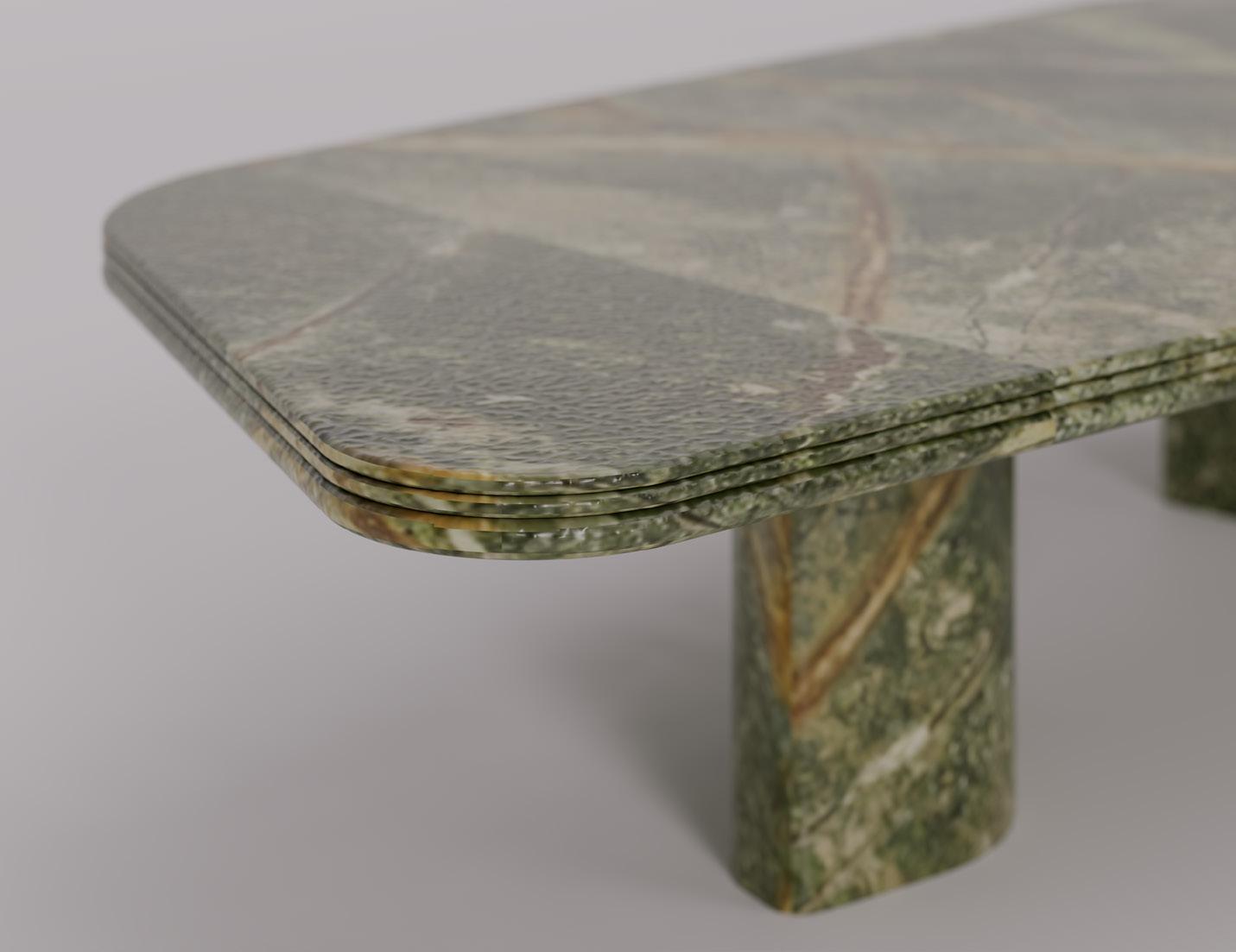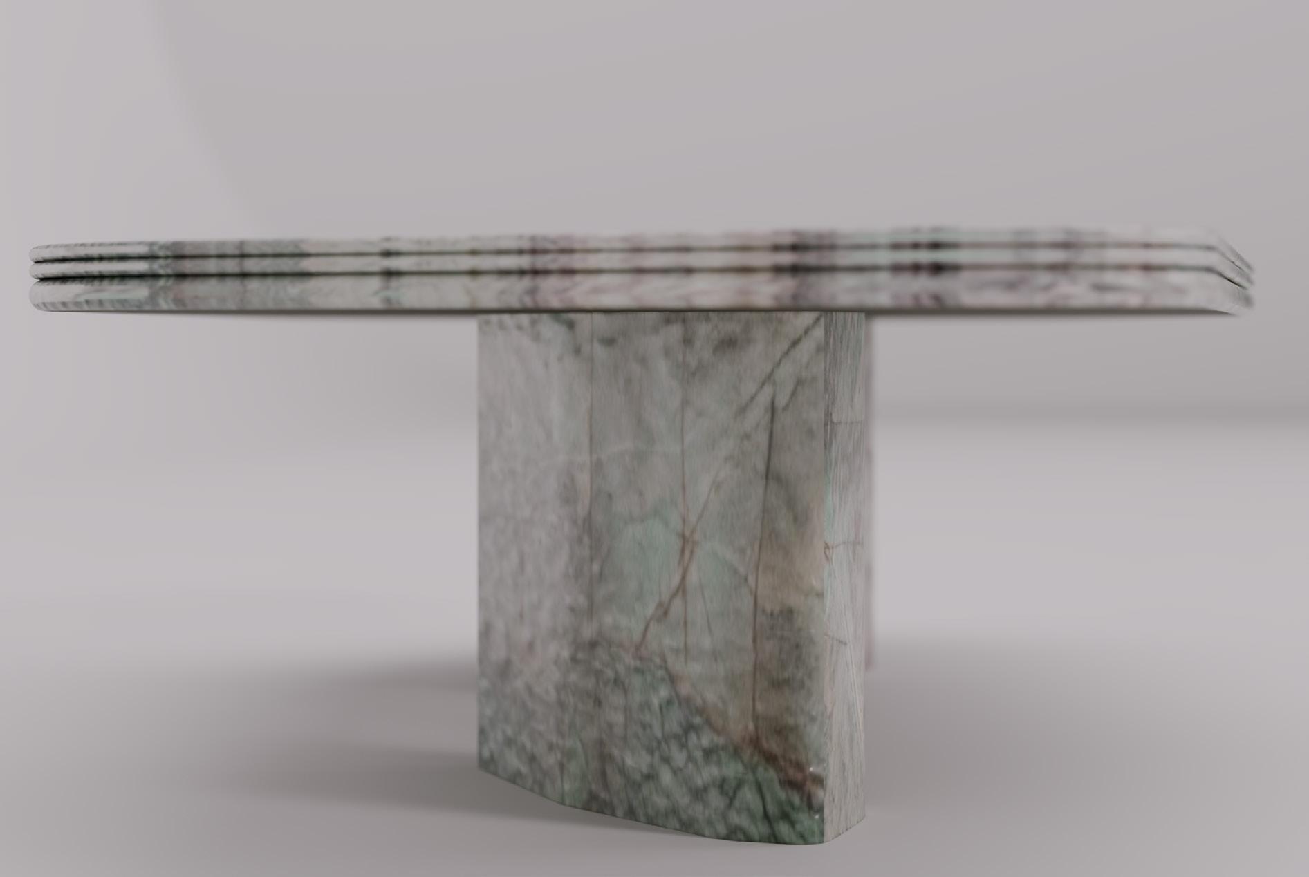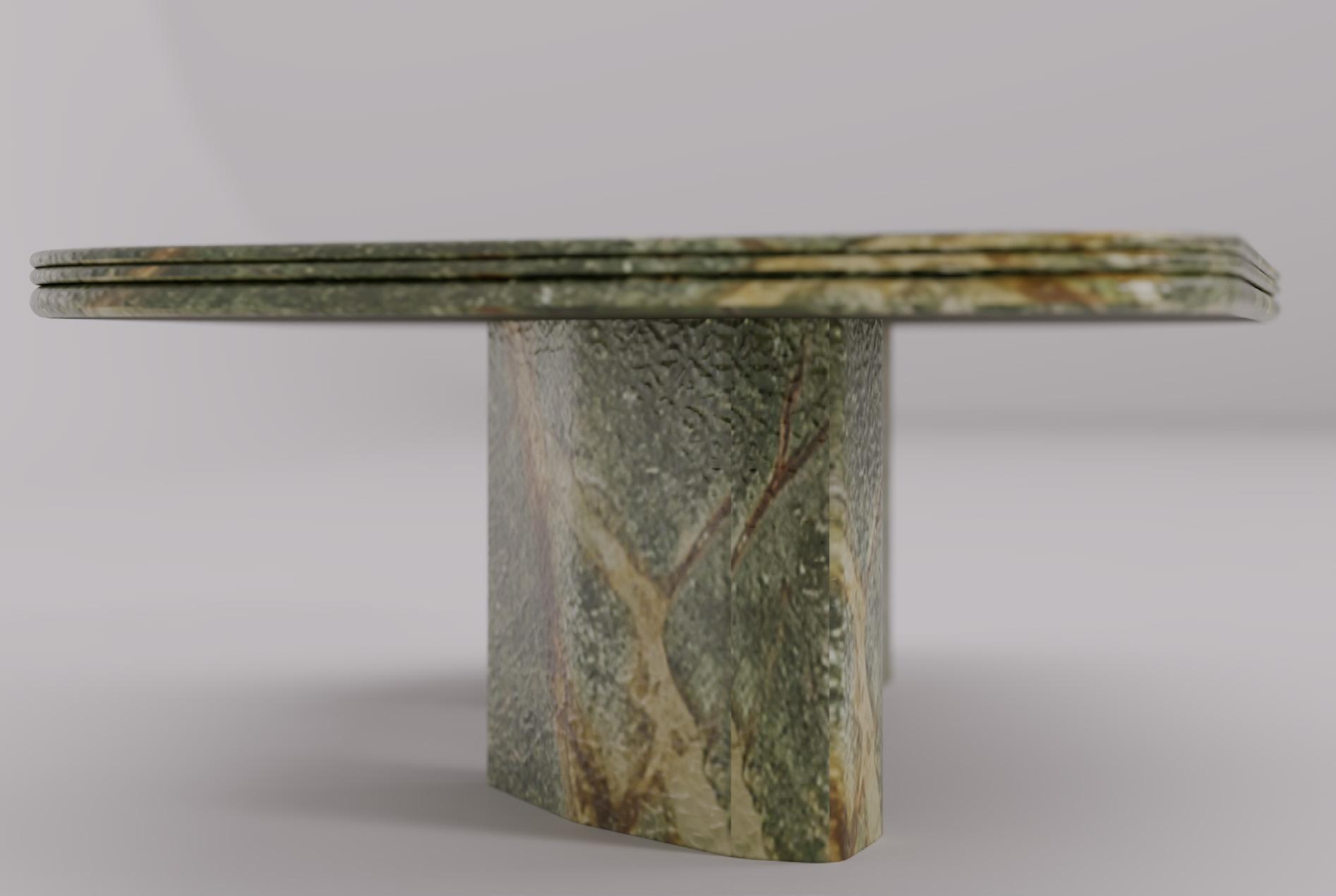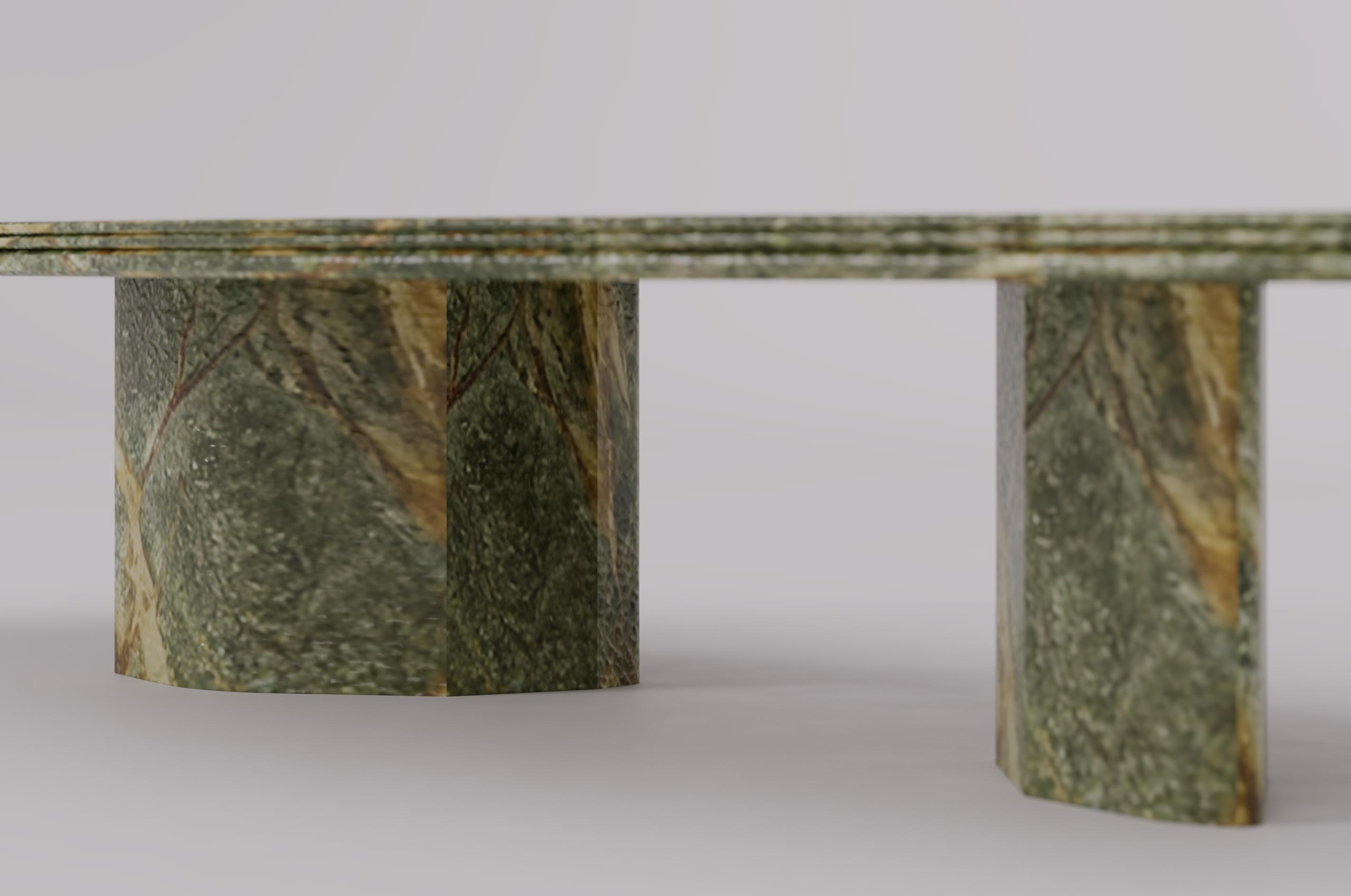 Crafted entirely from exquisite Botanical Green marble, this table is a statement of natural luxury. Its seamless monolithic form is achieved through precision stone cutting and expert assembly, with an internal reinforcement system ensuring exceptional strength and stability. The rich green tones and distinctive veining make each piece unique, while the refined finish, honed finish, nhances its tactile beauty.