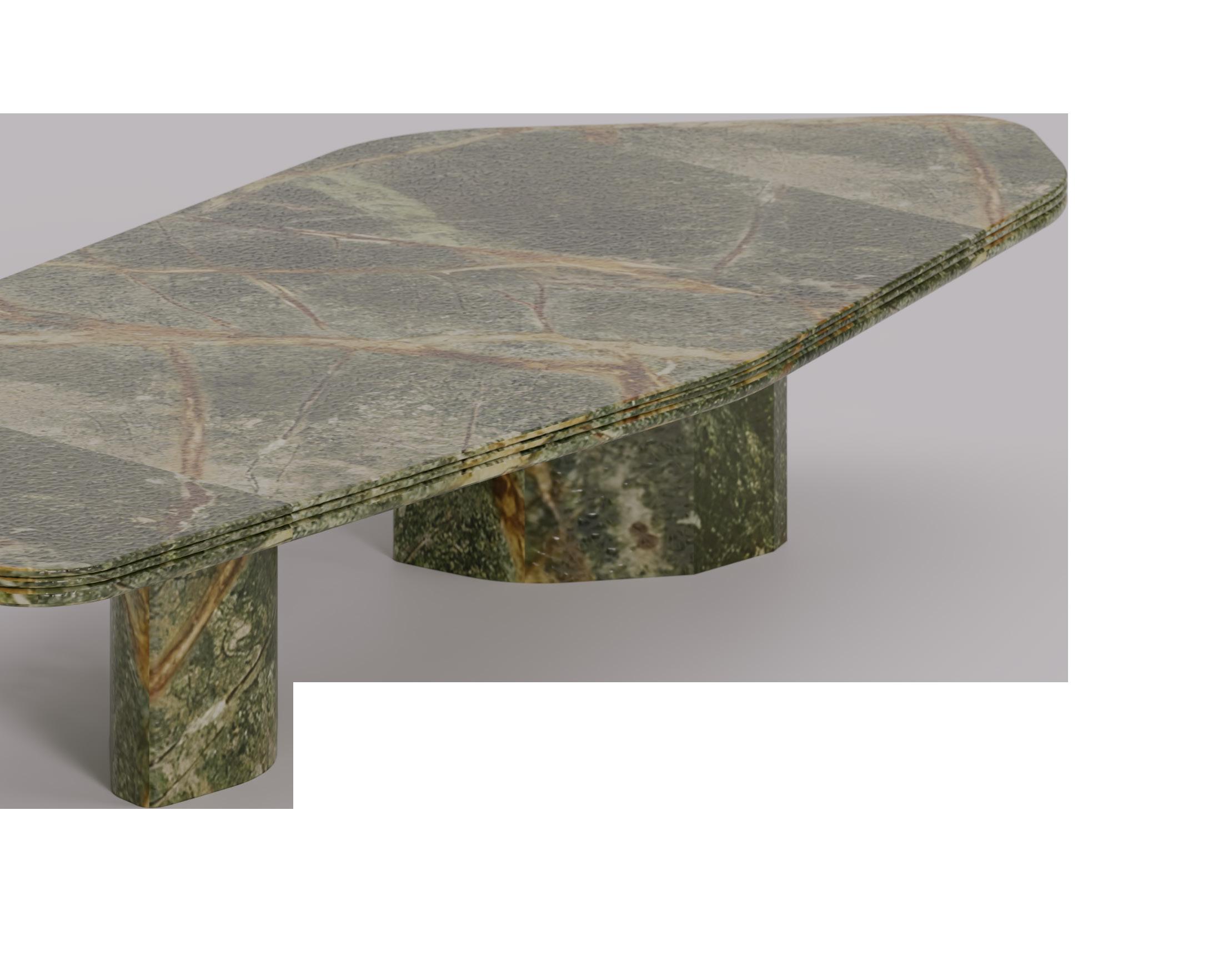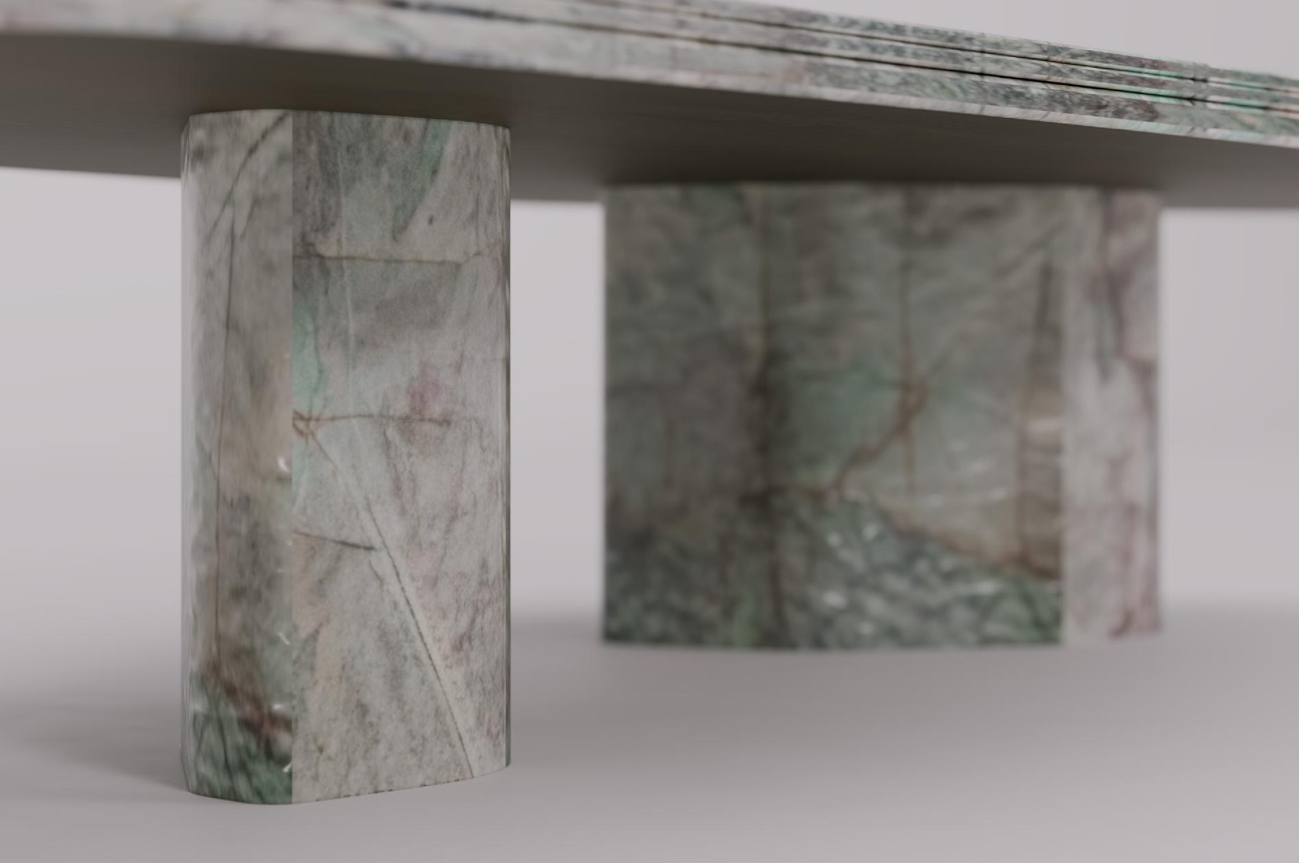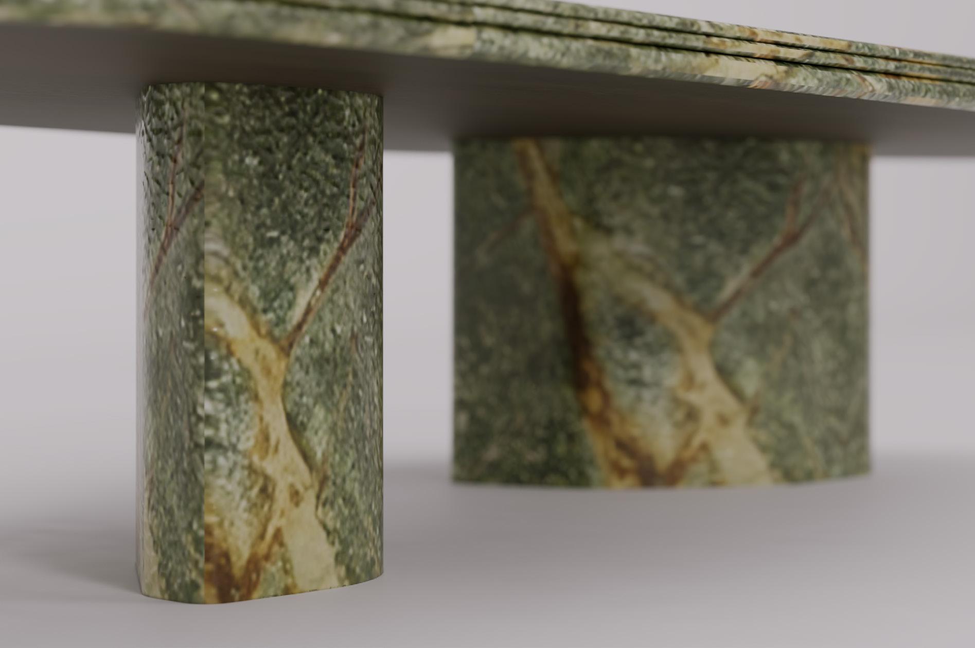Crafted entirely from exquisite Botanical Green marble, this table is a statement of natural luxury. Its seamless monolithic form is achieved through precision stone cutting and expert assembly, with an internal reinforcement system ensuring exceptional strength and stability. The rich green tones and distinctive veining make each piece unique, while the refined finish, honed finish, nhances its tactile beauty.
