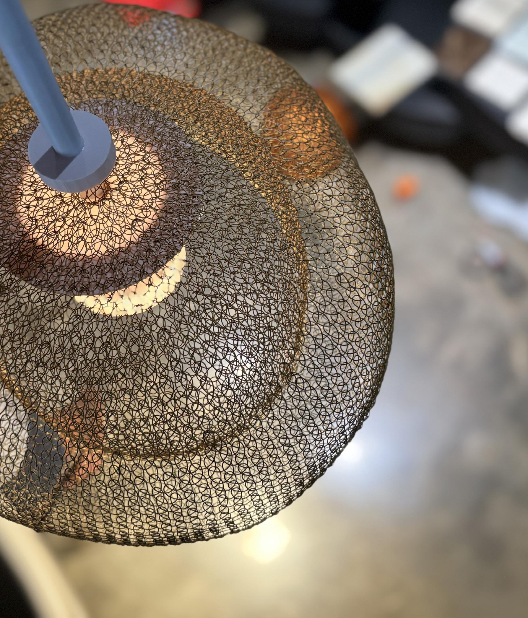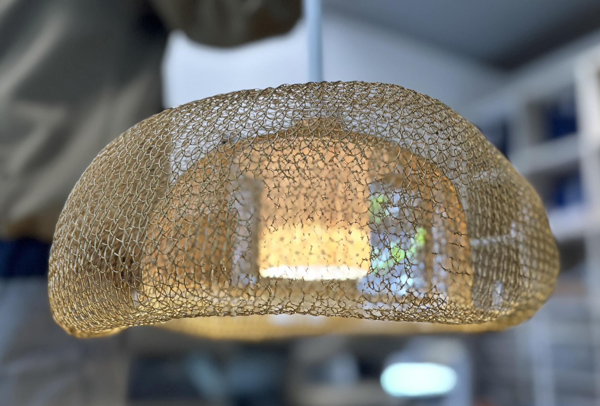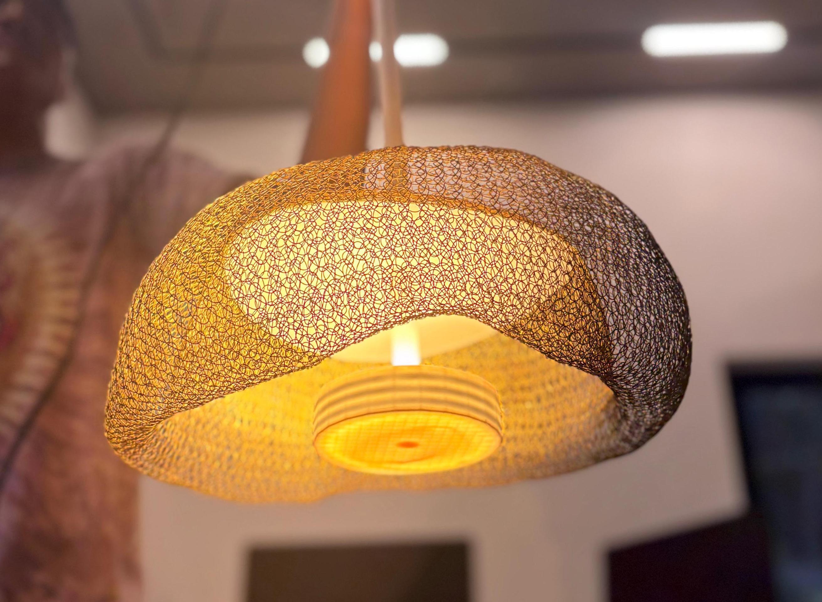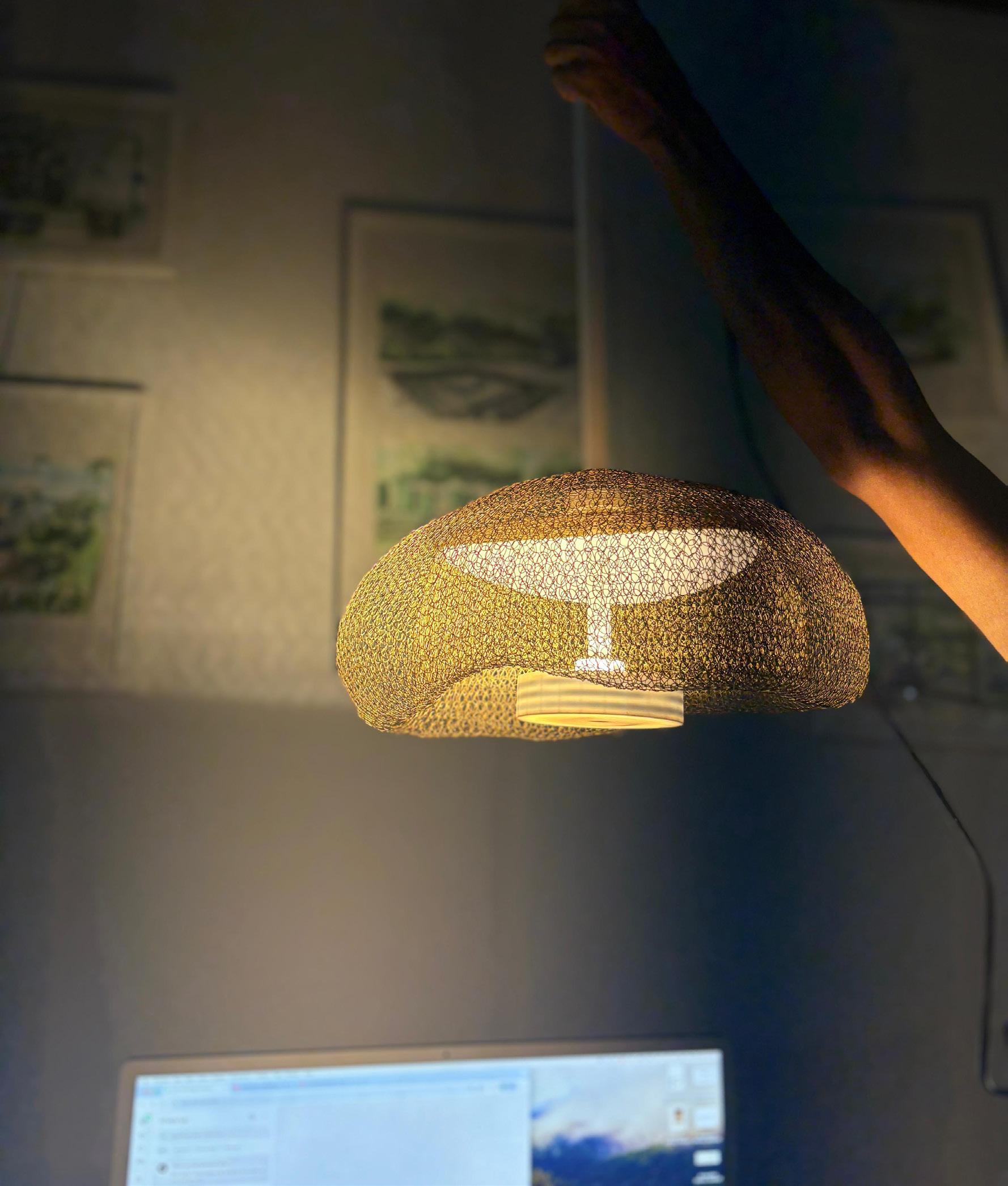 Crafted entirely by hand, the prototype involved experimenting with weaving density, tension, and structure to achieve both aesthetic fluidity and structural stability. The form itself is intentionally organic celebrating the natural variations that come from the artisan’s touch. Throughout the prototyping phase, attention was paid to how the wire interacts with light: the open weave allows for ambient diffusion, while the layering creates a delicate shadow play the