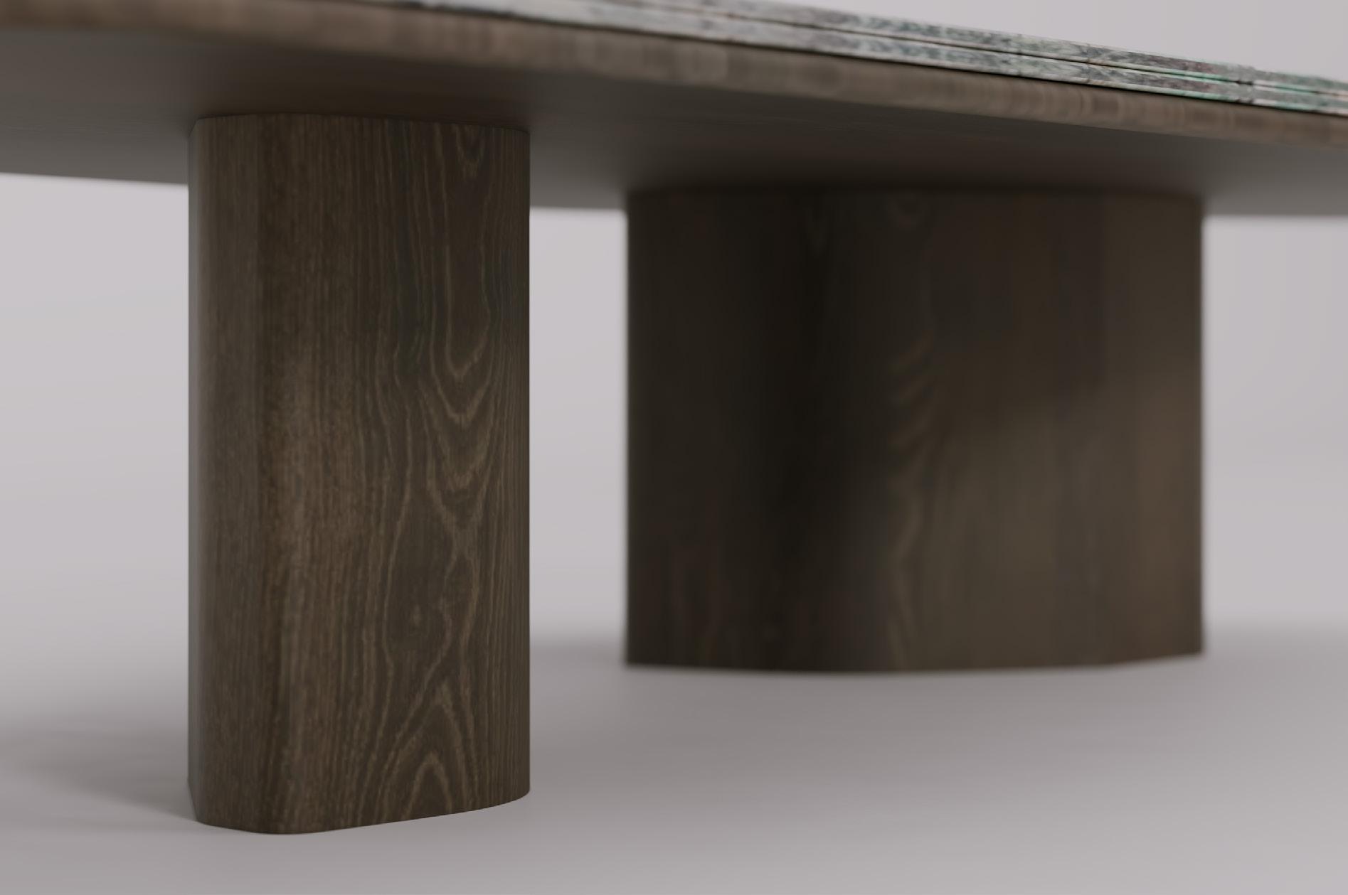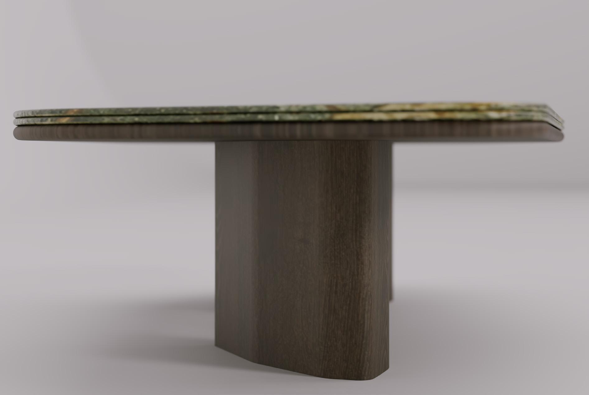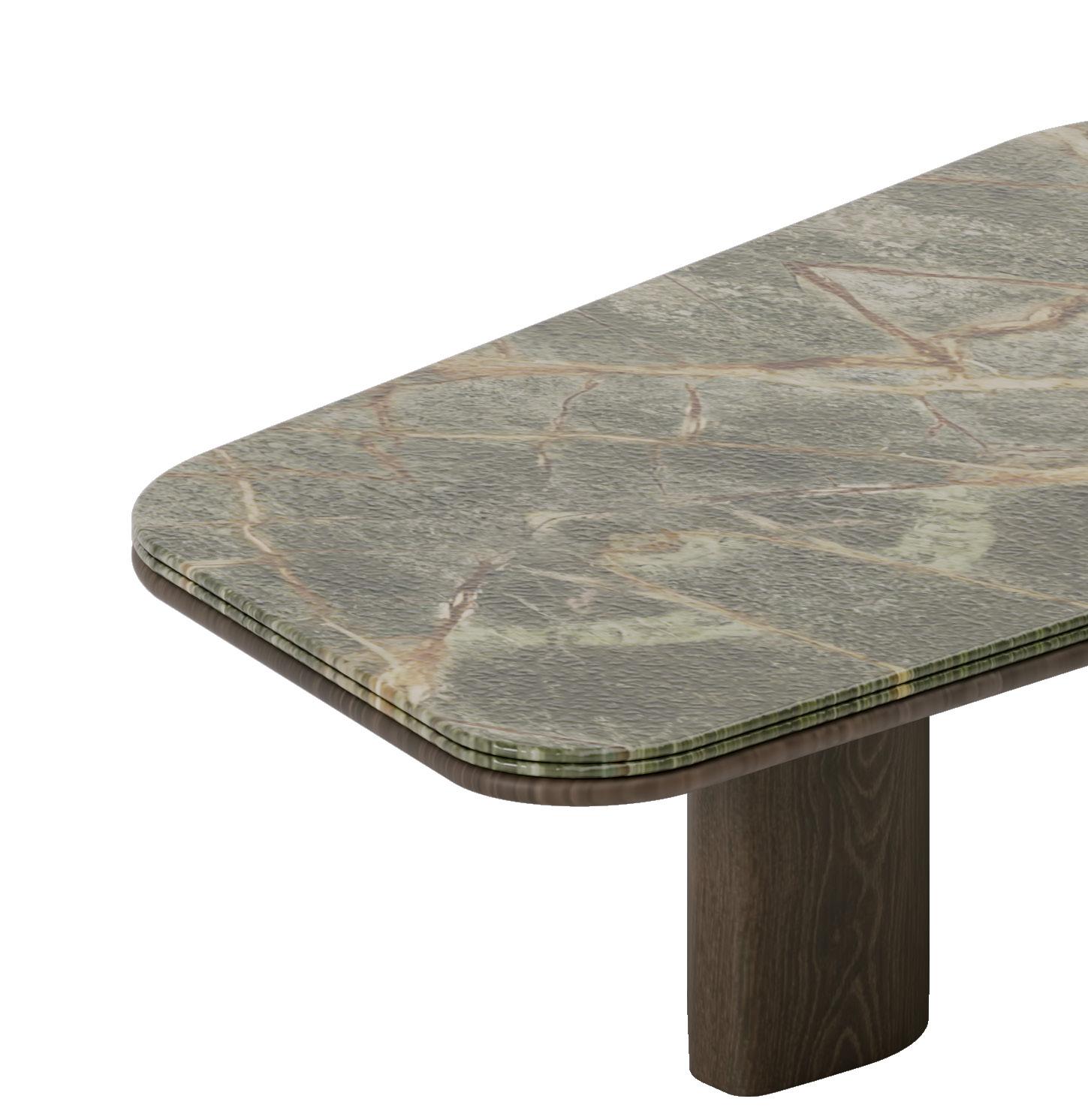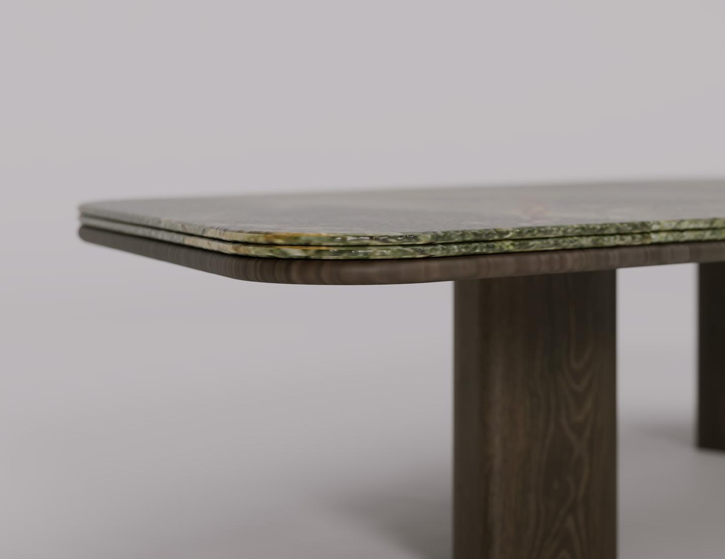 The cool, verdant palette wraps the design in an intimate and masculine aura, while its natural depth evokes the mystery of distant rainforests. Paired with finely crafted details and rich, contrasting materials, the table transforms into a centerpiece that is as much a work of art as it is a functional piece of furniture. the table