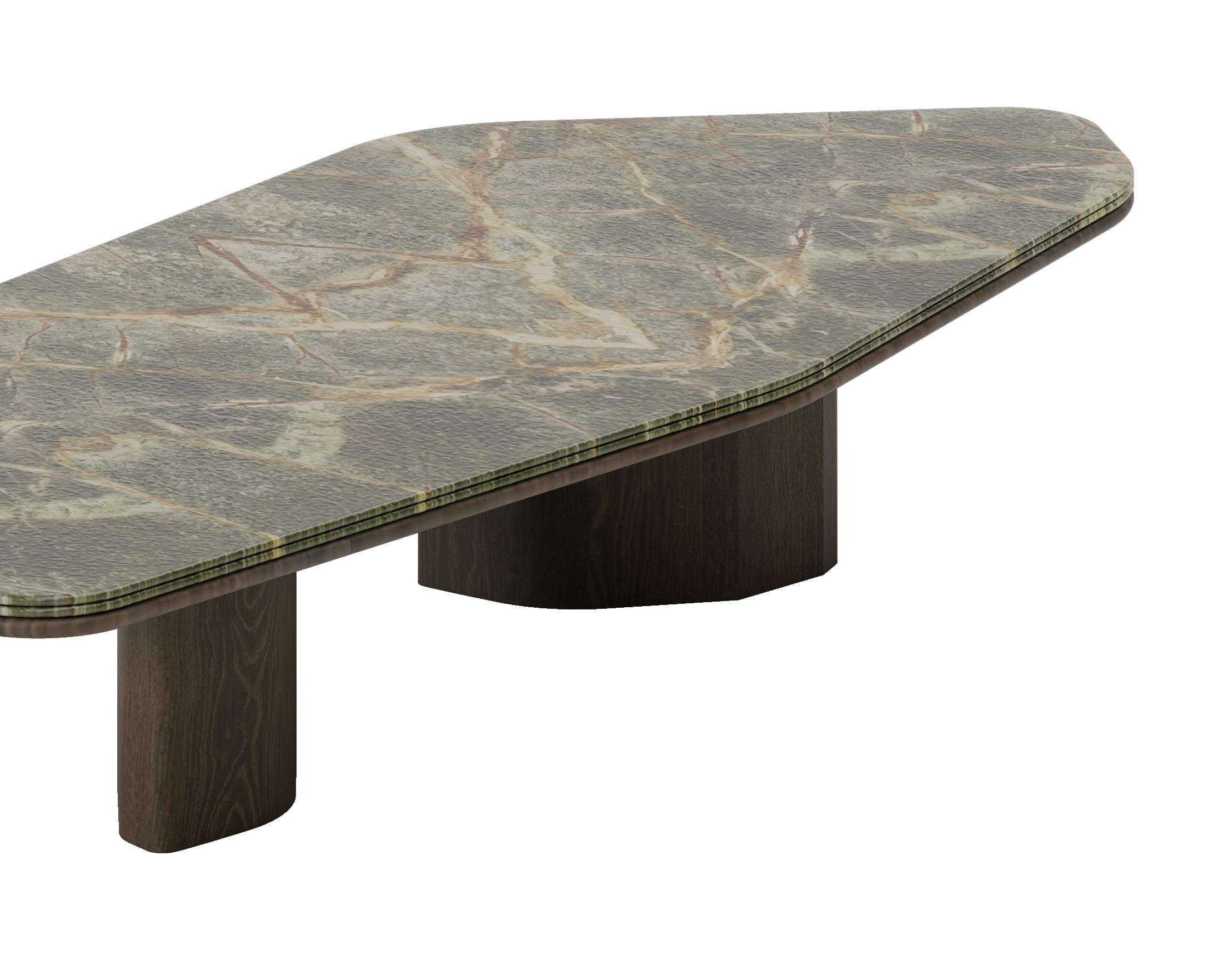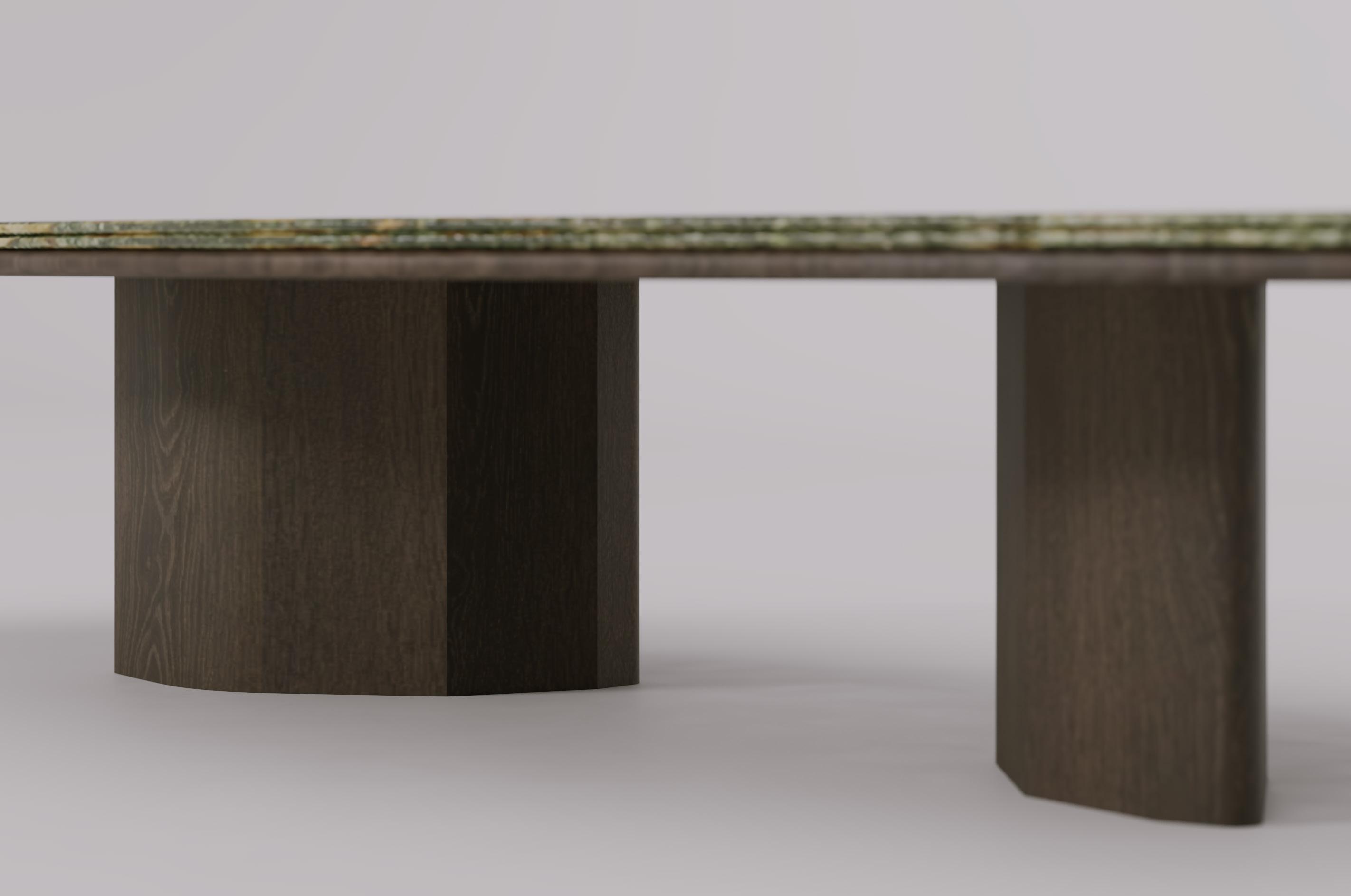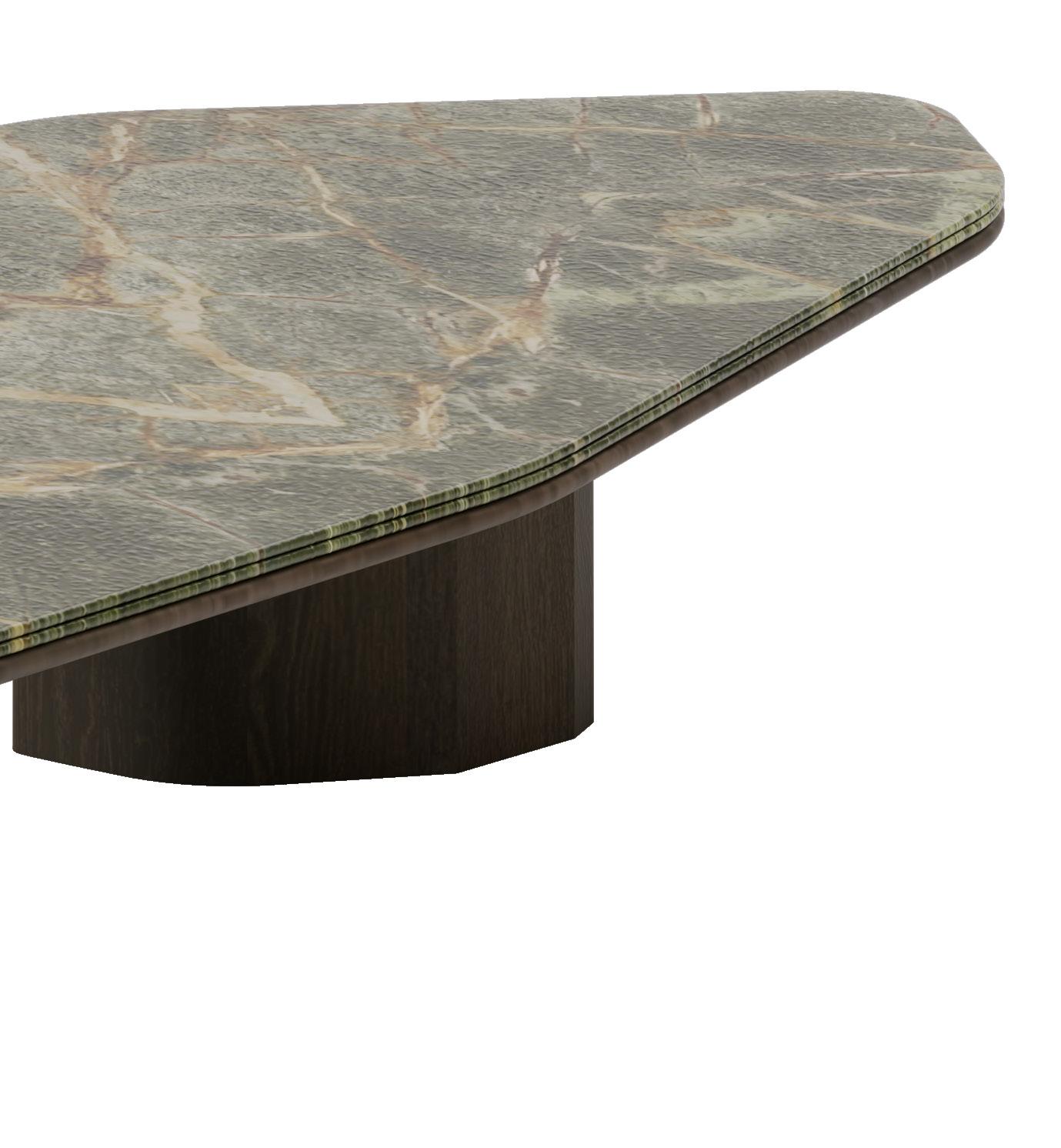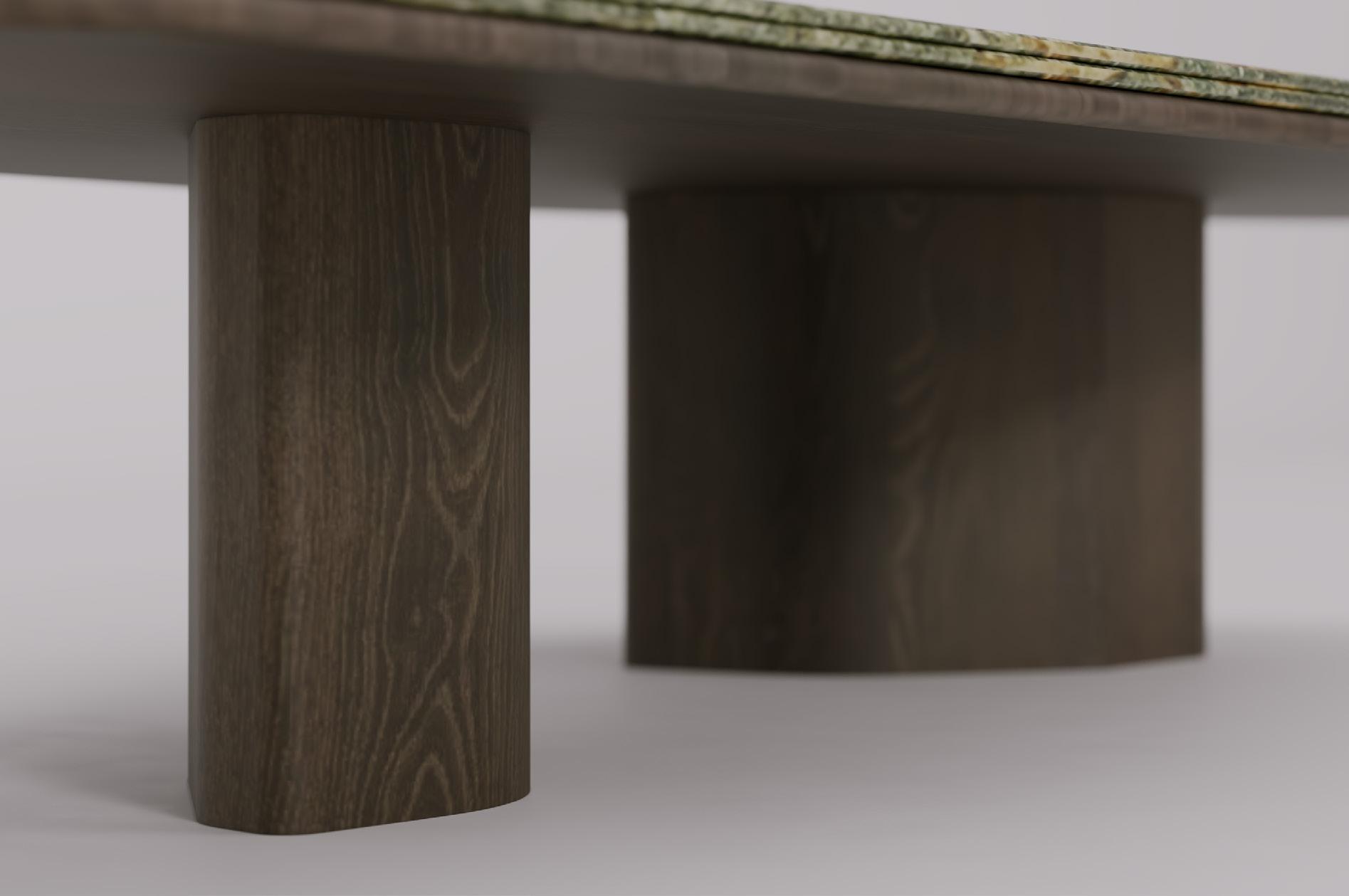 The cool, verdant palette wraps the design in an intimate and masculine aura, while its natural depth evokes the mystery of distant rainforests. Paired with finely crafted details and rich, contrasting materials, the table transforms into a centerpiece that is as much a work of art as it is a functional piece of furniture. the table