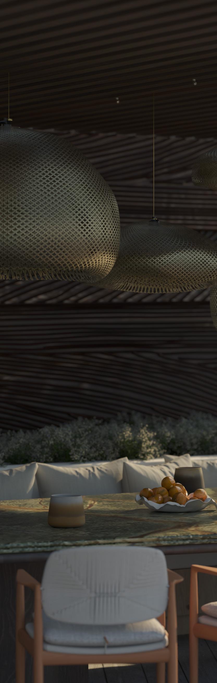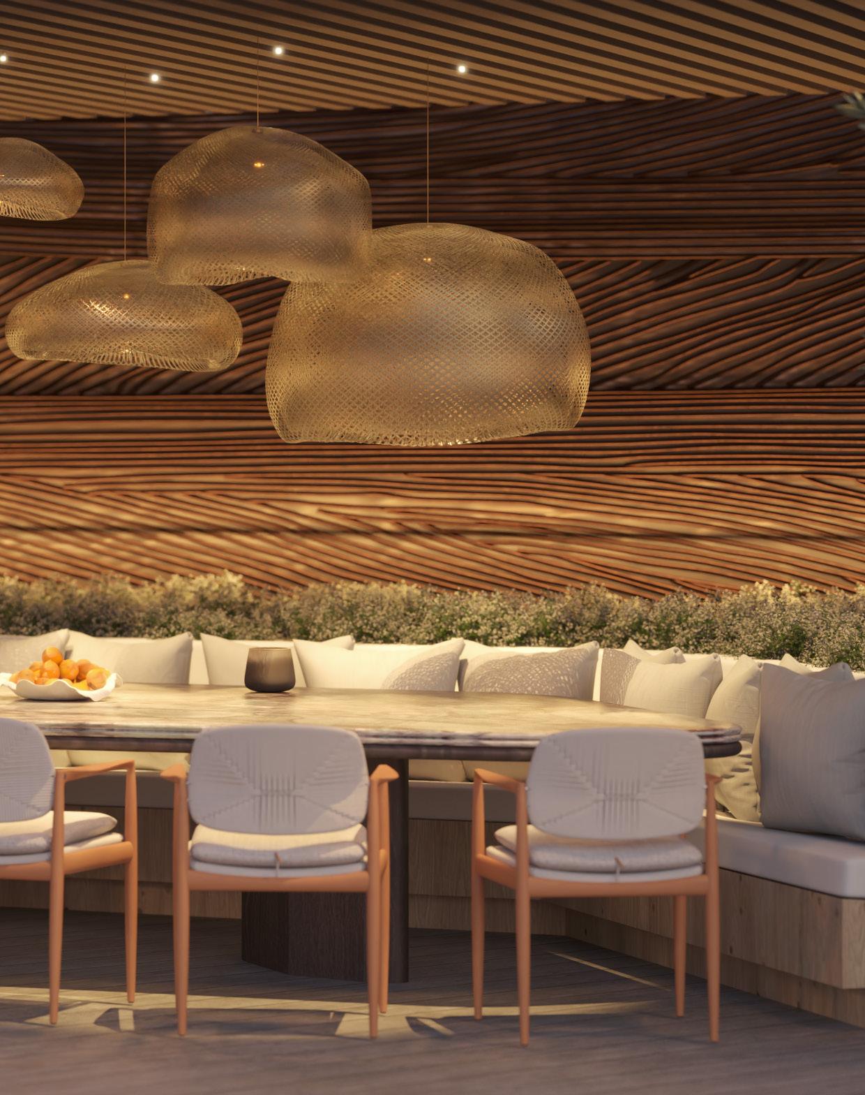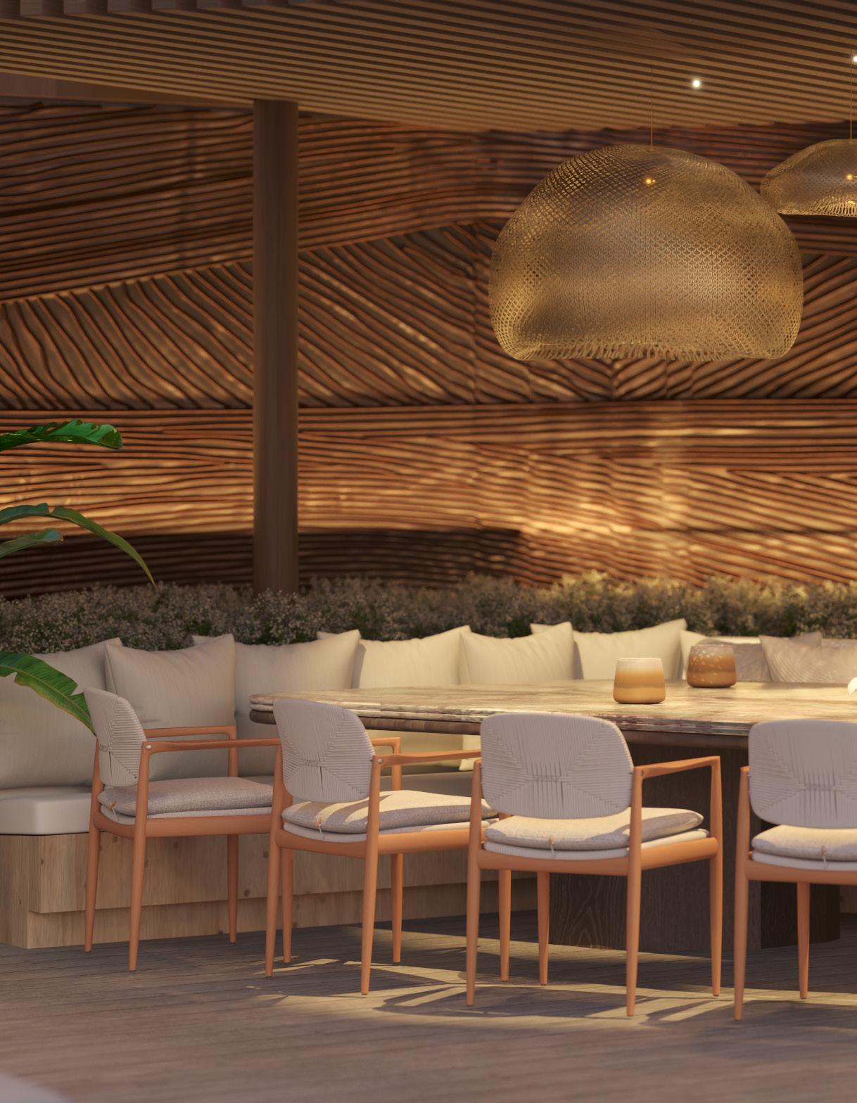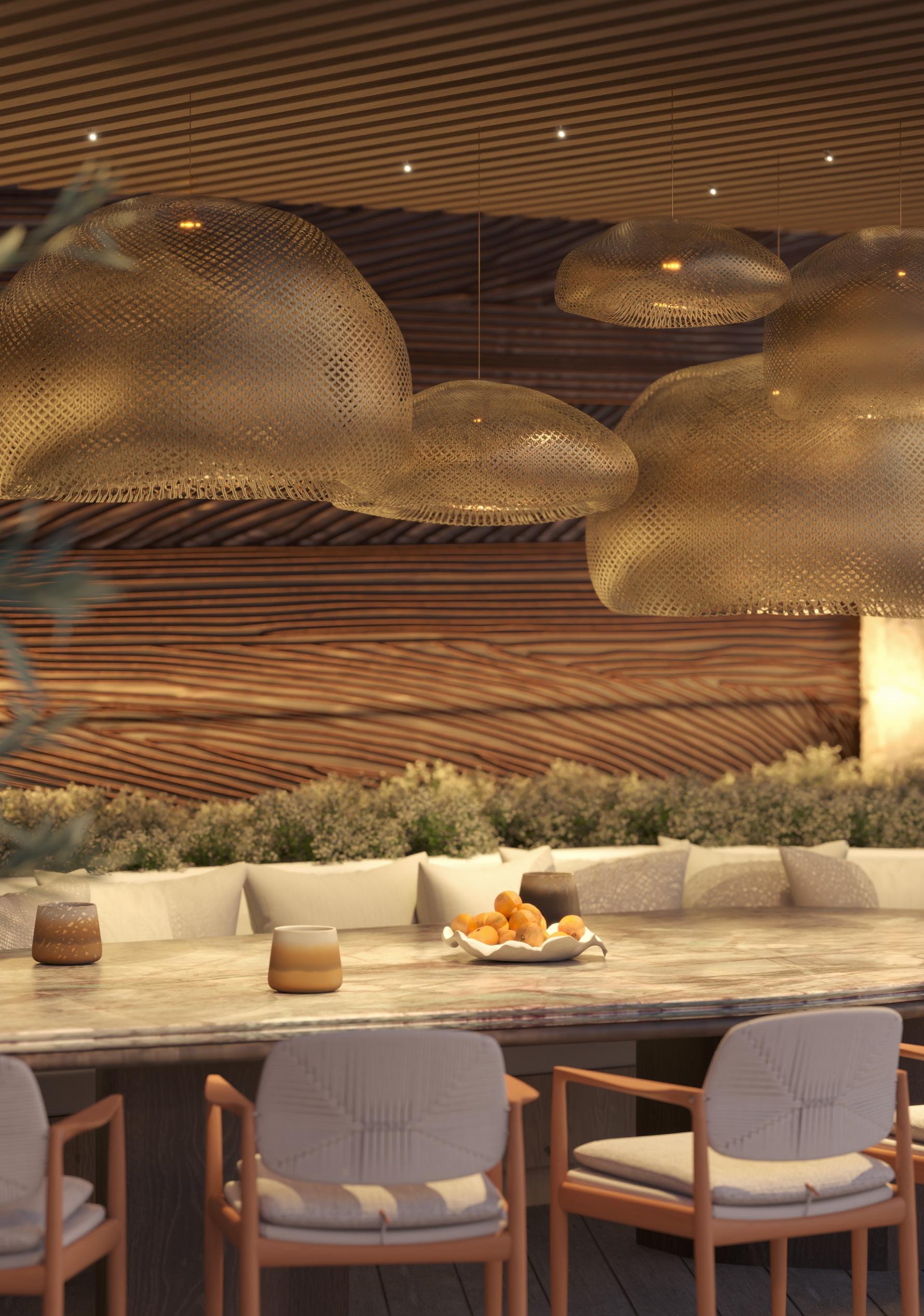 Ici, chaque détail a été pensé comme une note dans une partition. La lumière devient un murmure, le marbre une respiration, le bois sculpté une mémoire vivante. Lorsque la nuit tombe et que les suspensions s’illuminent, l’espace se transforme en un théâtre d’ombres et de reflets, où les voix se mêlent au cliquetis des verres et au parfum salin venu de l’océan. Plus qu’un lieu, c’est une scène de vie, façonnée pour que les instants partagés deviennent inoubliables.
