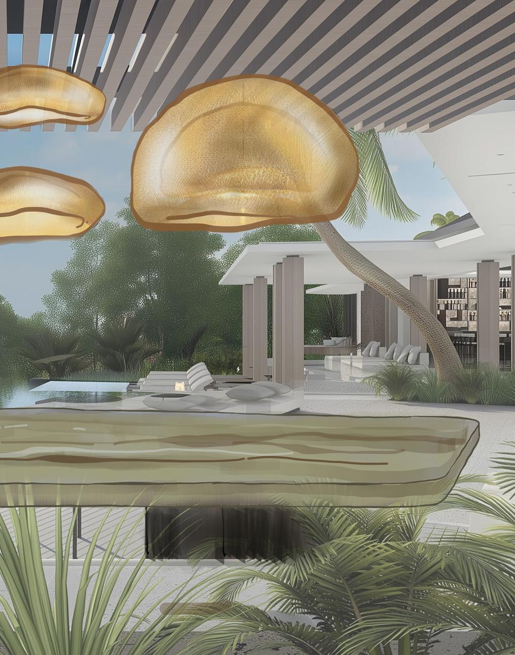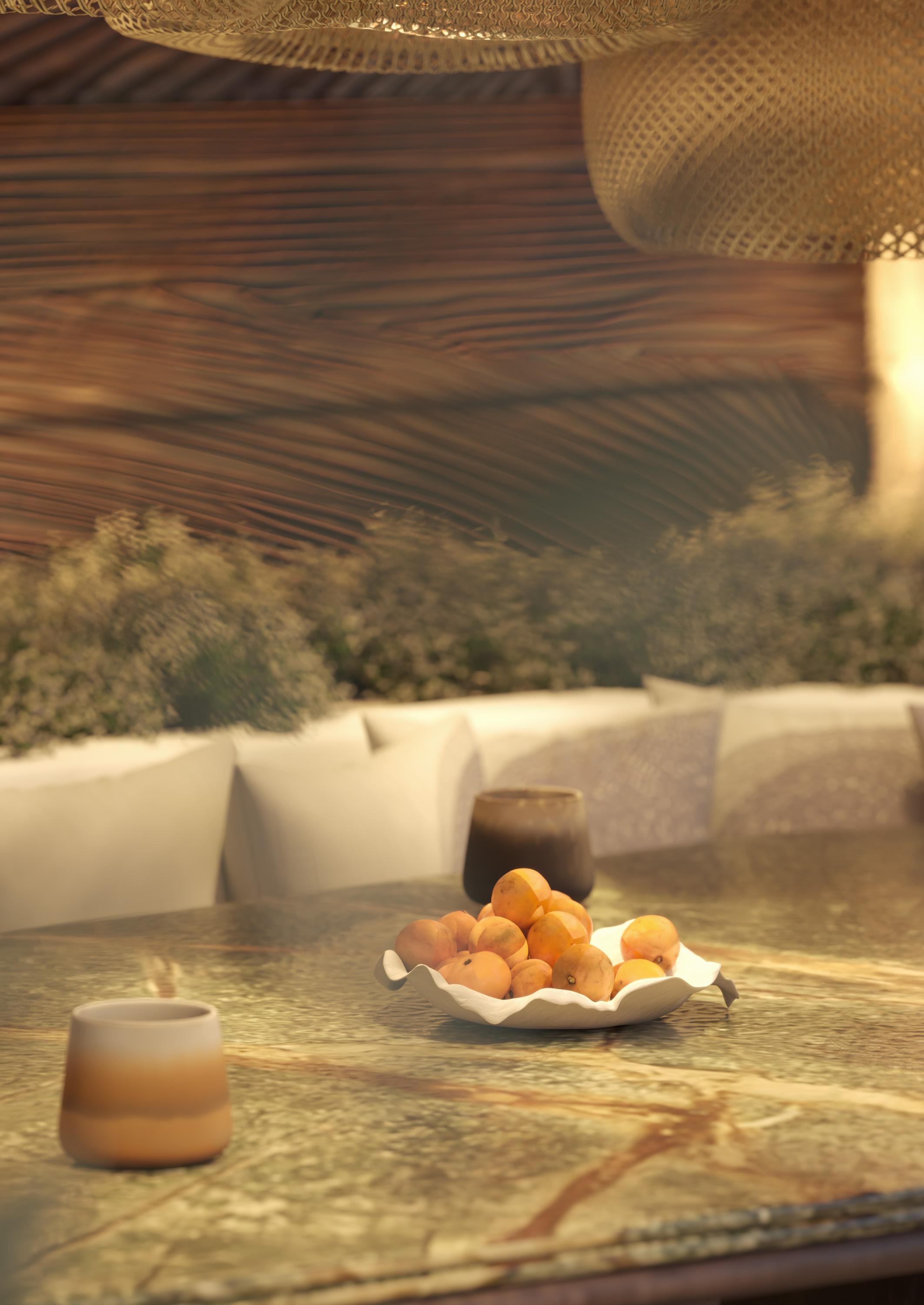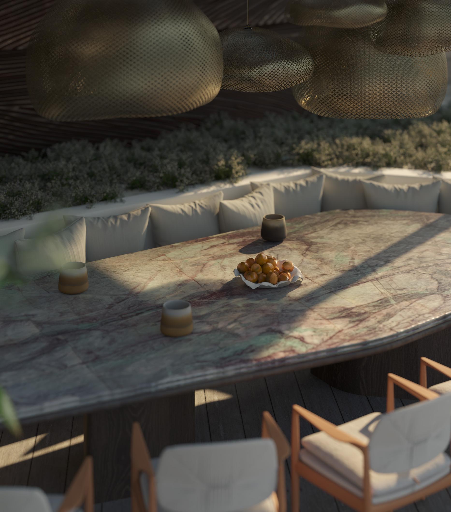 Ici, chaque détail a été pensé comme une note dans une partition. La lumière devient un murmure, le marbre une respiration, le bois sculpté une mémoire vivante. Lorsque la nuit tombe et que les suspensions s’illuminent, l’espace se transforme en un théâtre d’ombres et de reflets, où les voix se mêlent au cliquetis des verres et au parfum salin venu de l’océan. Plus qu’un lieu, c’est une scène de vie, façonnée pour que les instants partagés deviennent inoubliables.