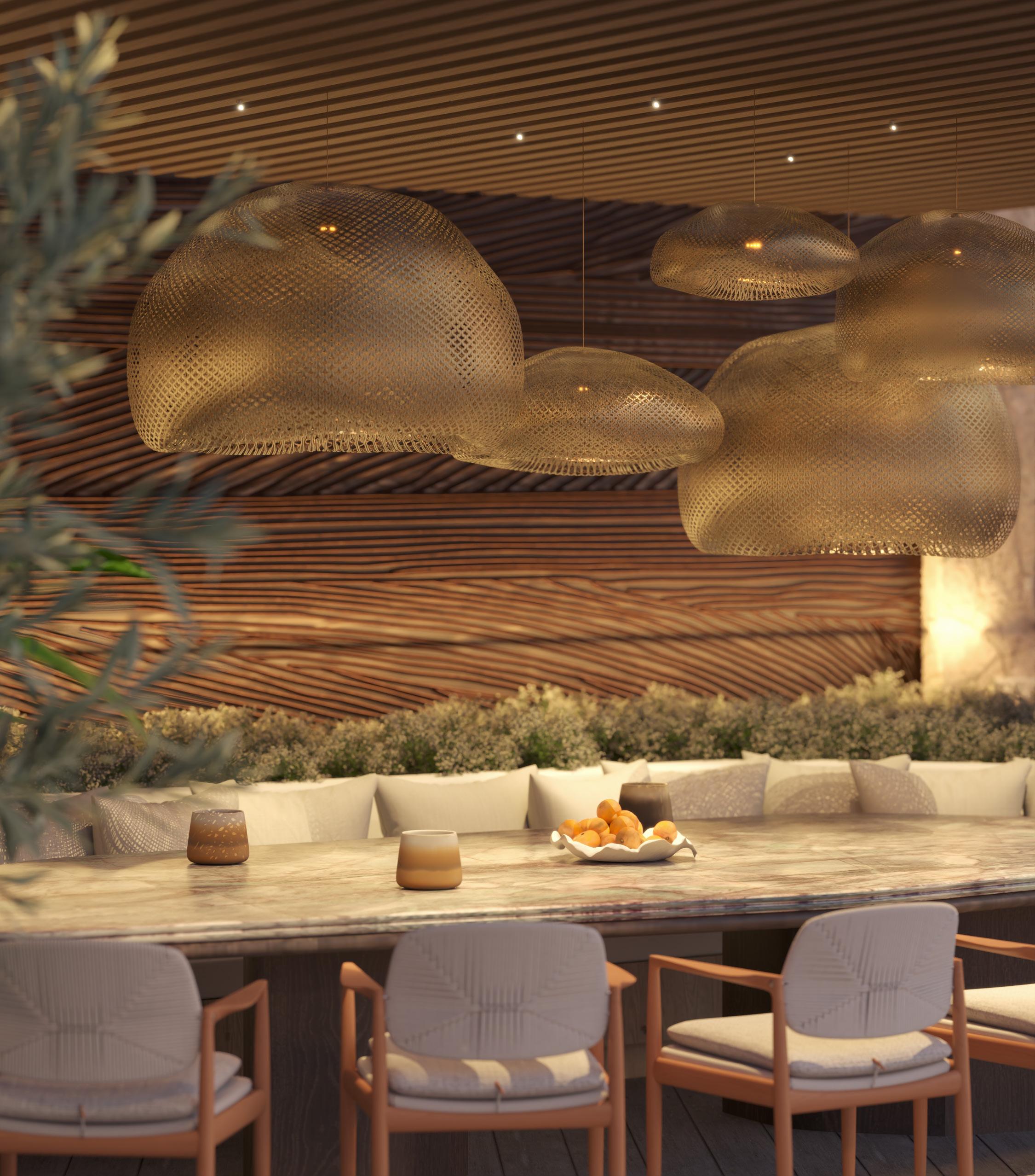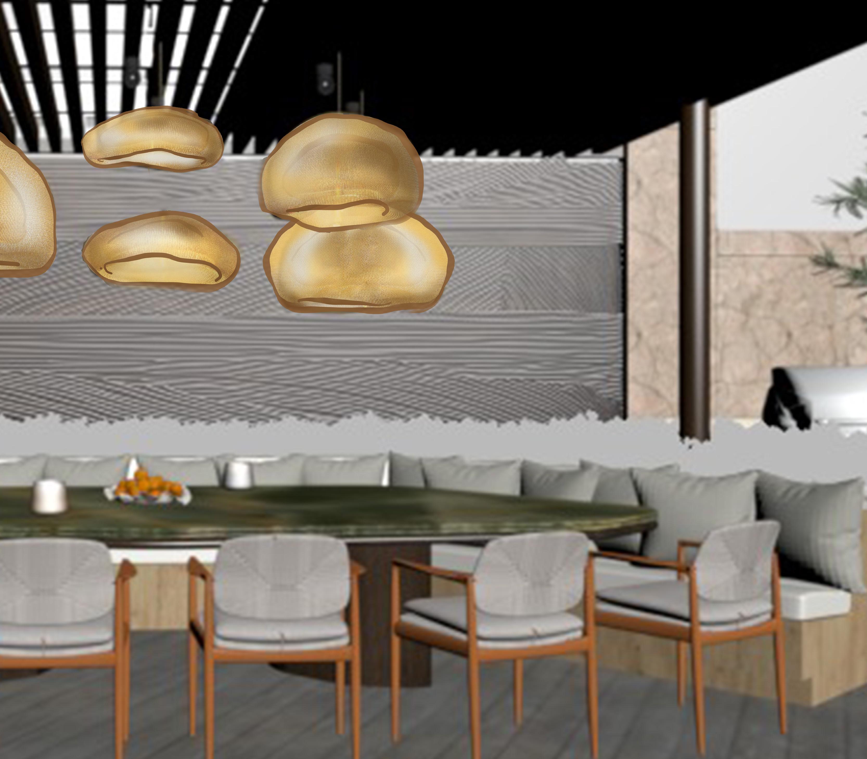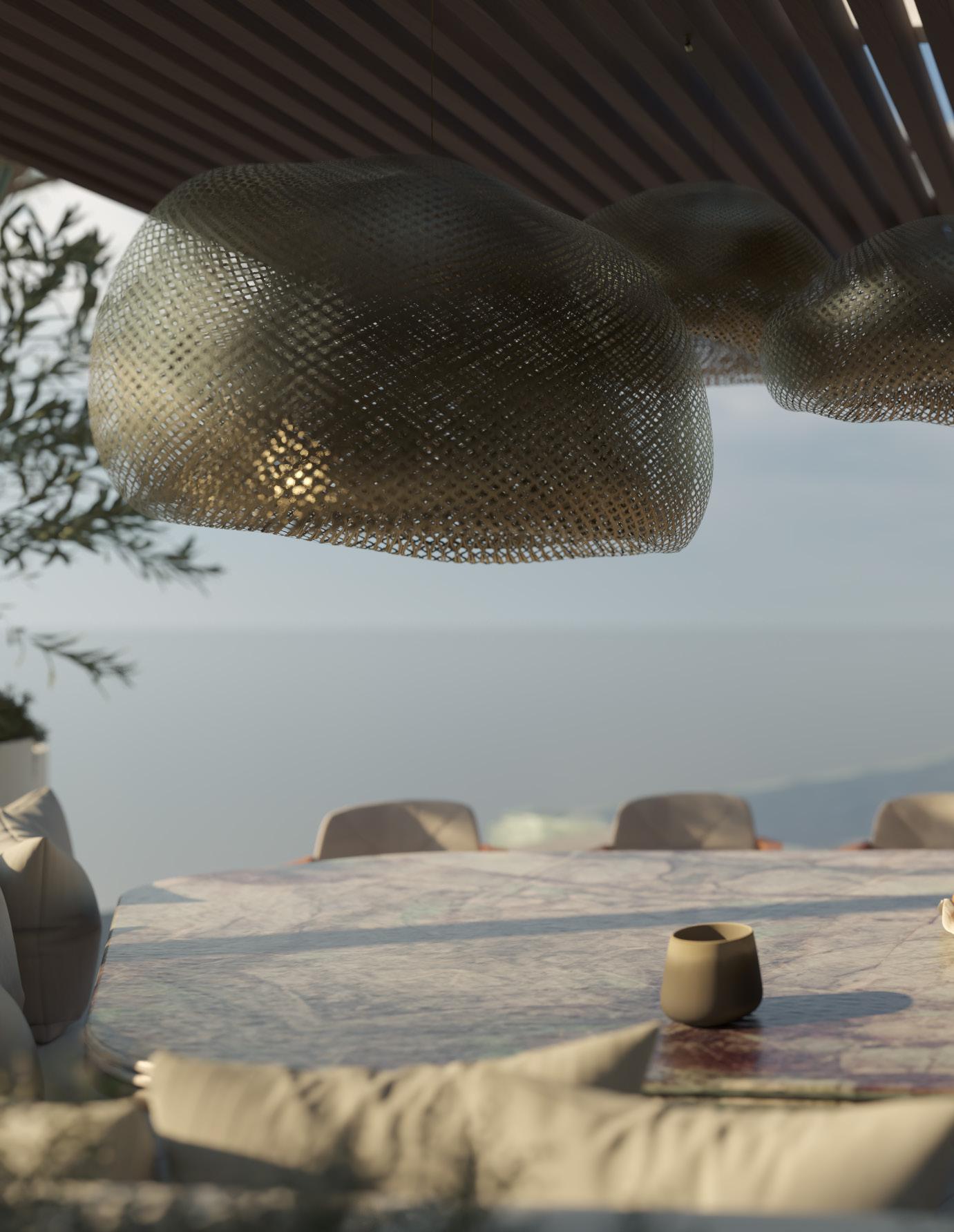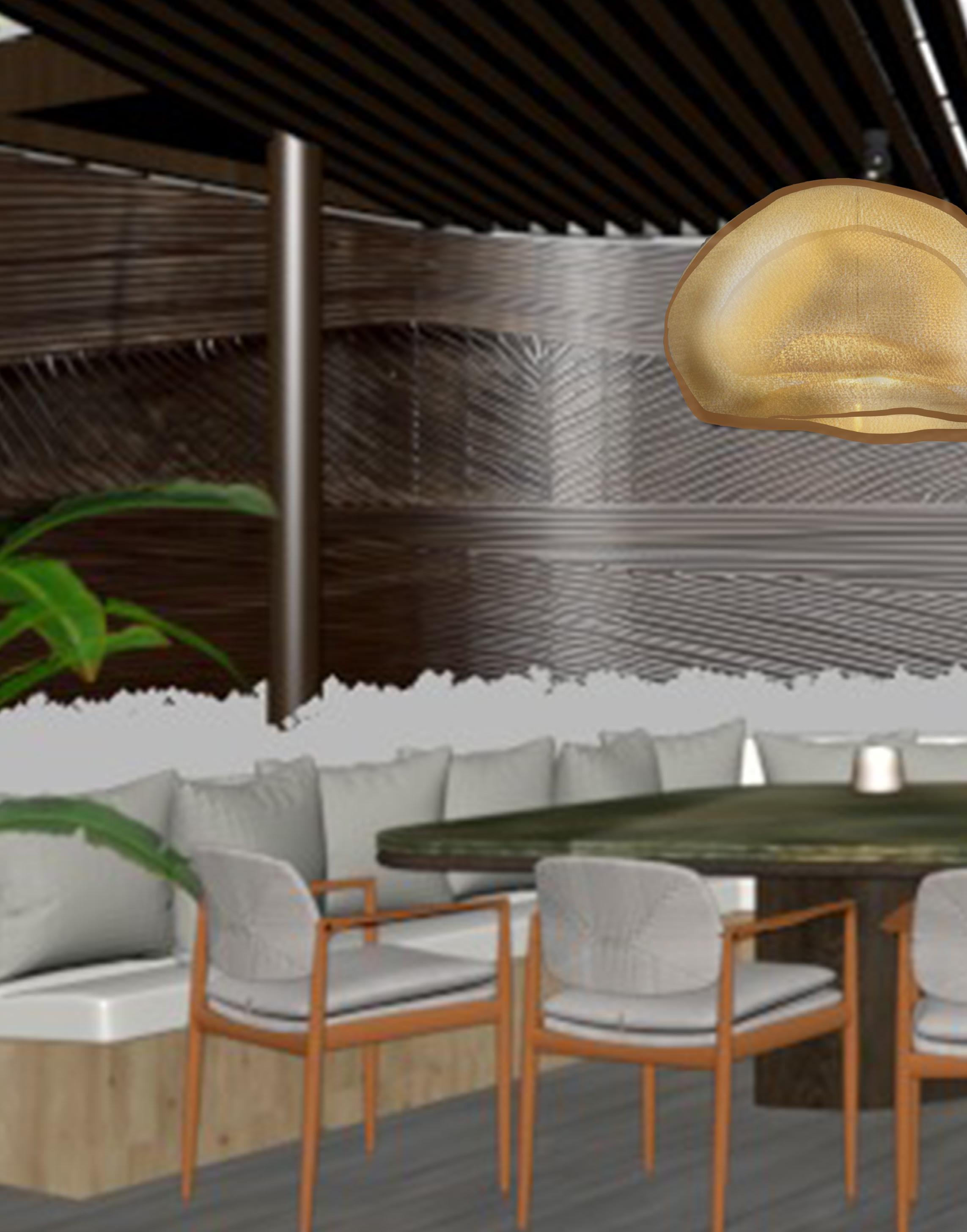 Pour cela, nous avons imaginé cinq suspensions en laiton naturel, dessinées en fil pour offrir légèreté et transparence. Avec le temps, leur patine viendra se fondre dans l’environnement, dialoguant subtilement avec les textures du bois sculpté et de la pergola. La lumière, pensée comme une matière vivante, se diffuse depuis l’intérieur des lampes et se prolonge grâce à des spots intégrés à la structure, projetant sur la table un jeu d’ombres et de lumière comme une dentelle mouvante.