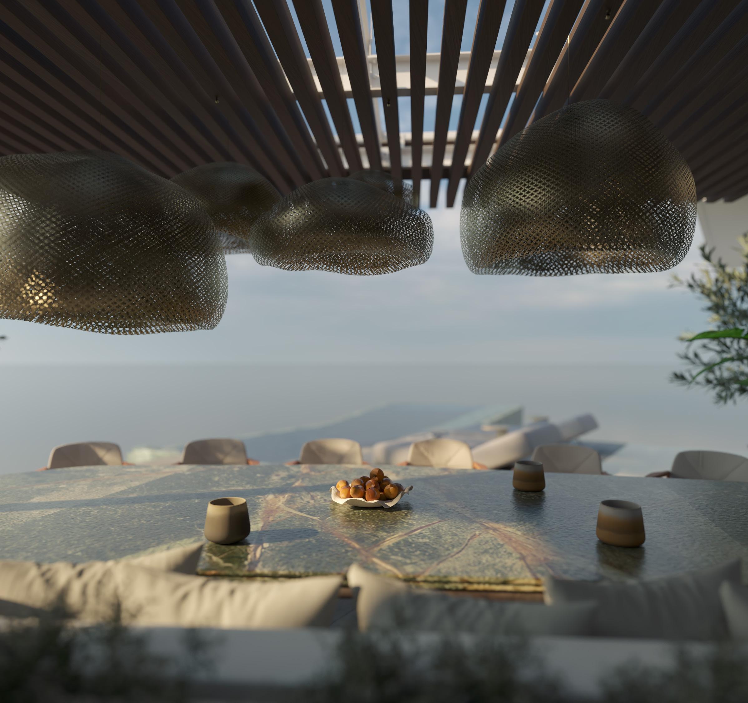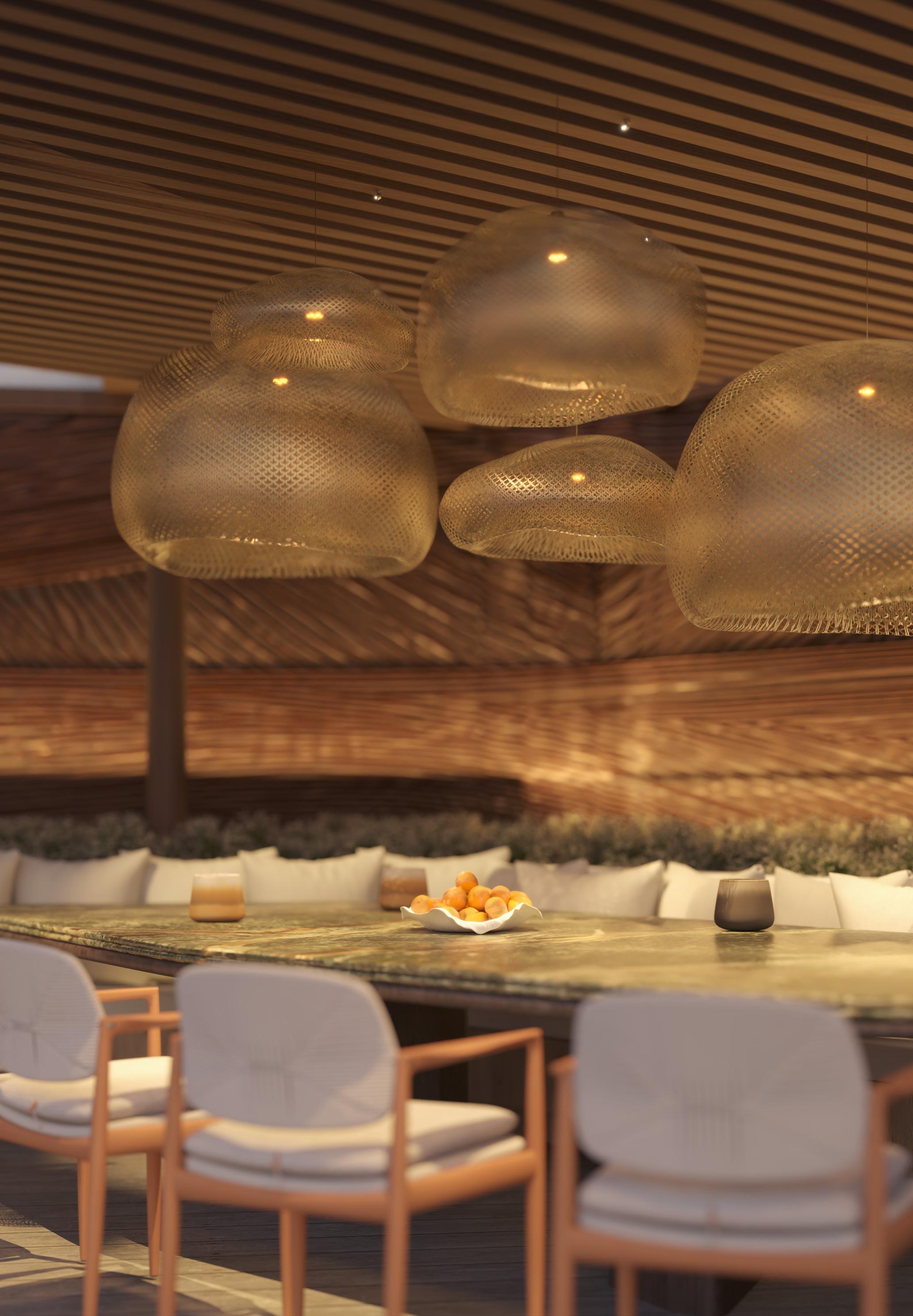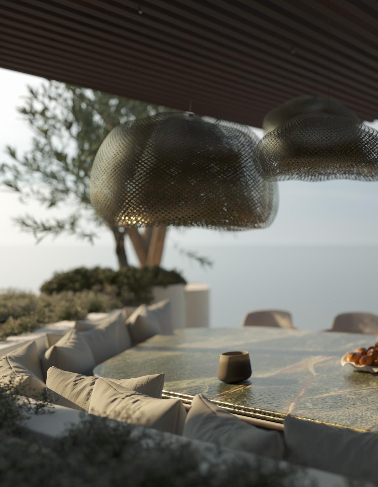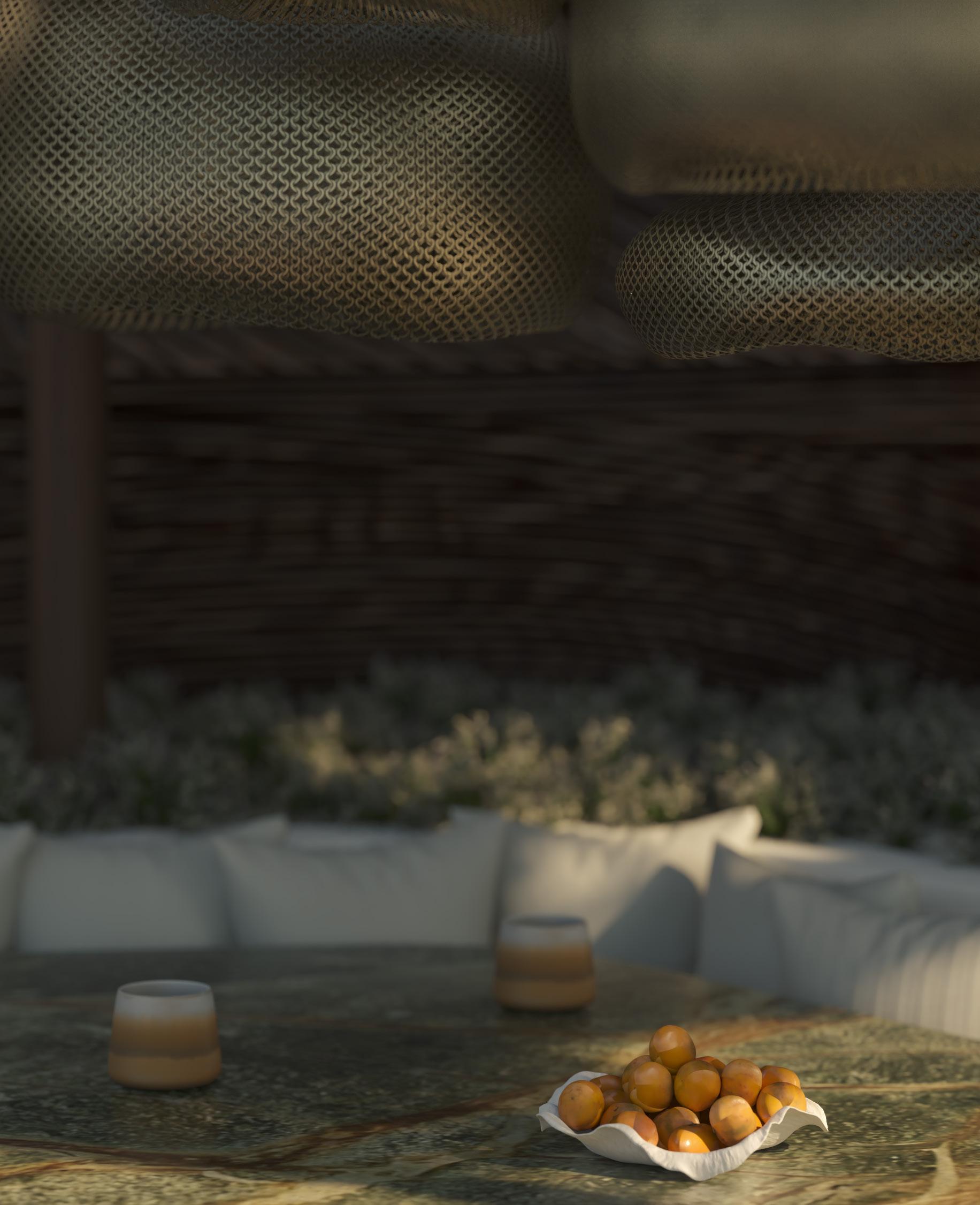 Pour cela, nous avons imaginé cinq suspensions en laiton naturel, dessinées en fil pour offrir légèreté et transparence. Avec le temps, leur patine viendra se fondre dans l’environnement, dialoguant subtilement avec les textures du bois sculpté et de la pergola. La lumière, pensée comme une matière vivante, se diffuse depuis l’intérieur des lampes et se prolonge grâce à des spots intégrés à la structure, projetant sur la table un jeu d’ombres et de lumière comme une dentelle mouvante.