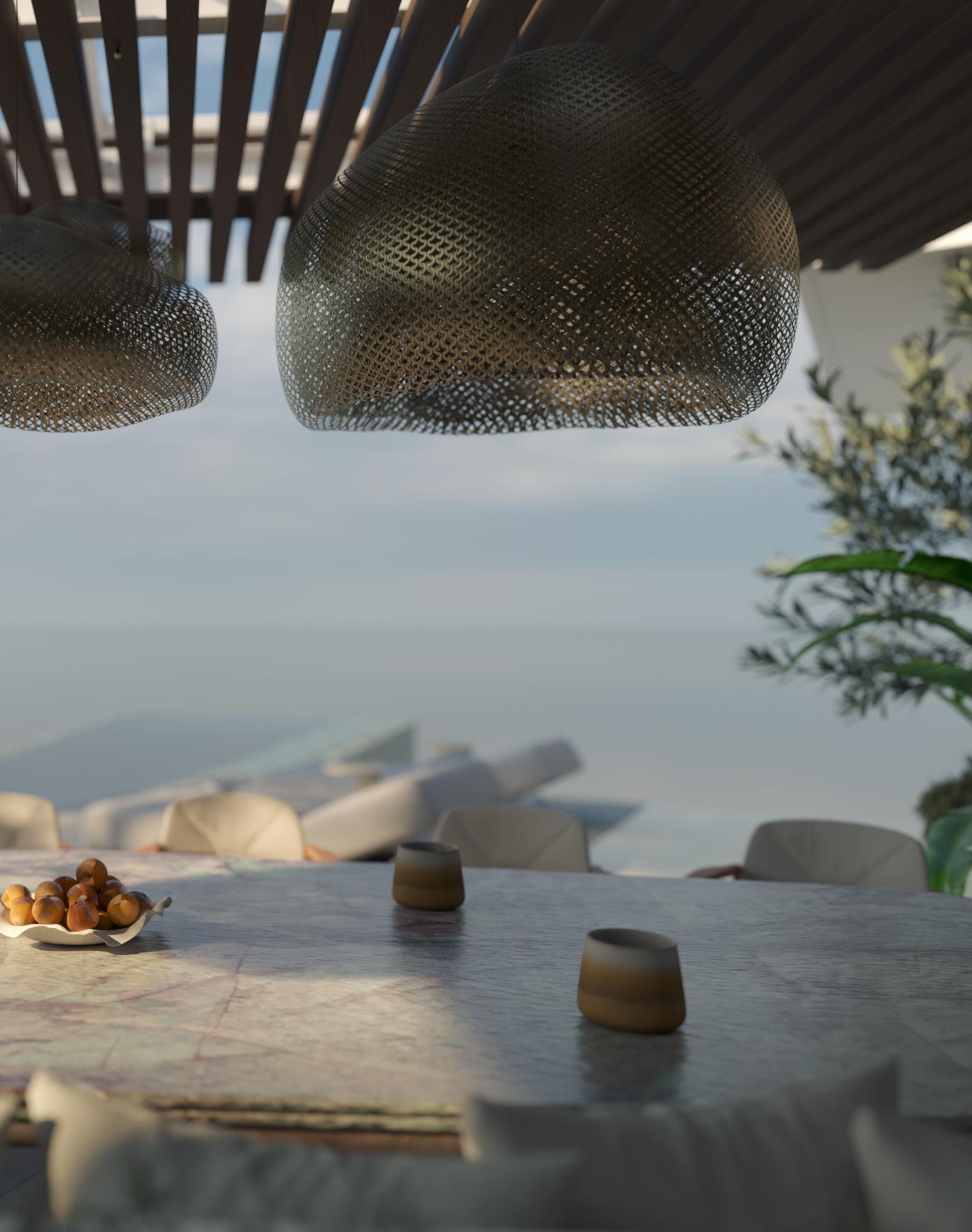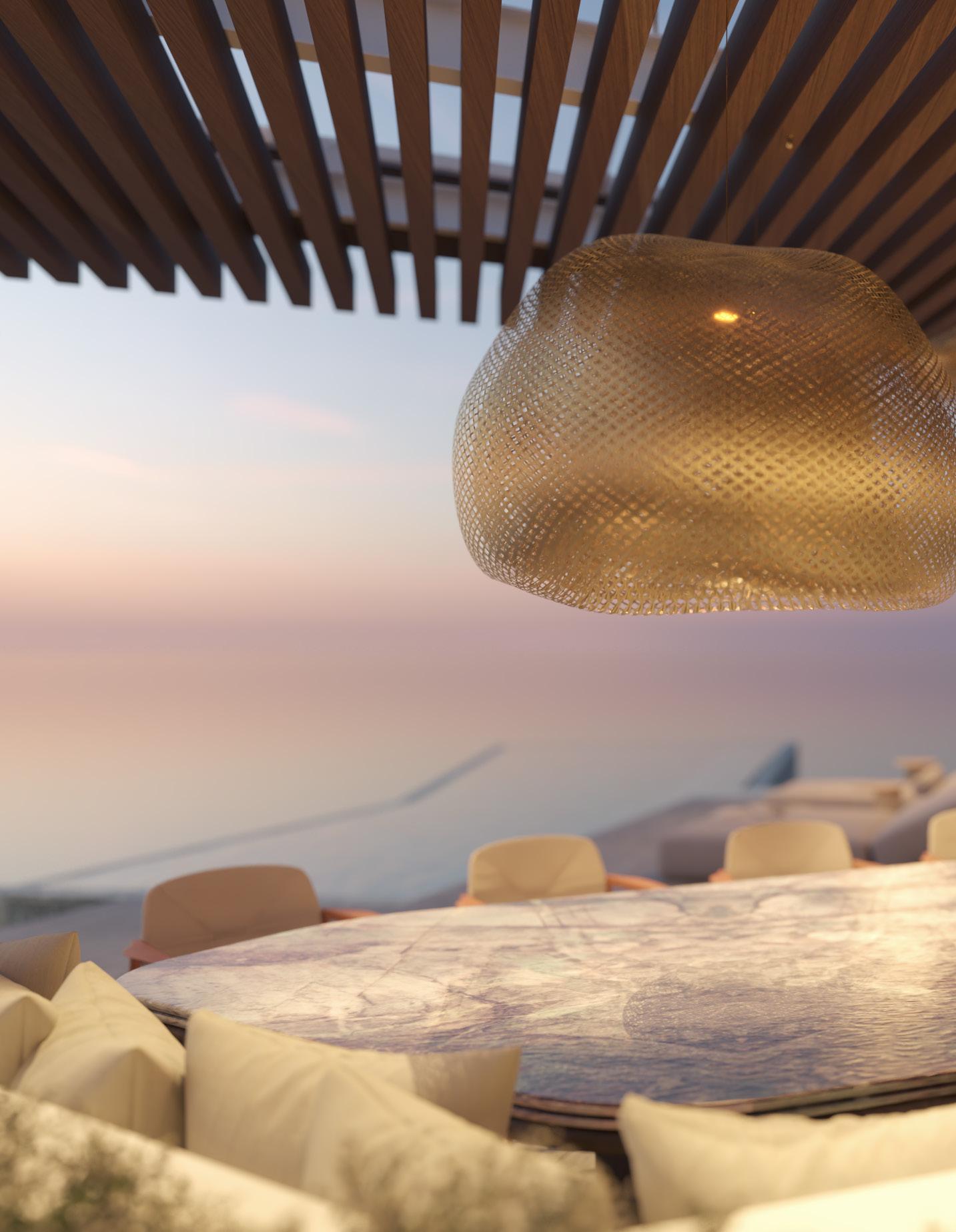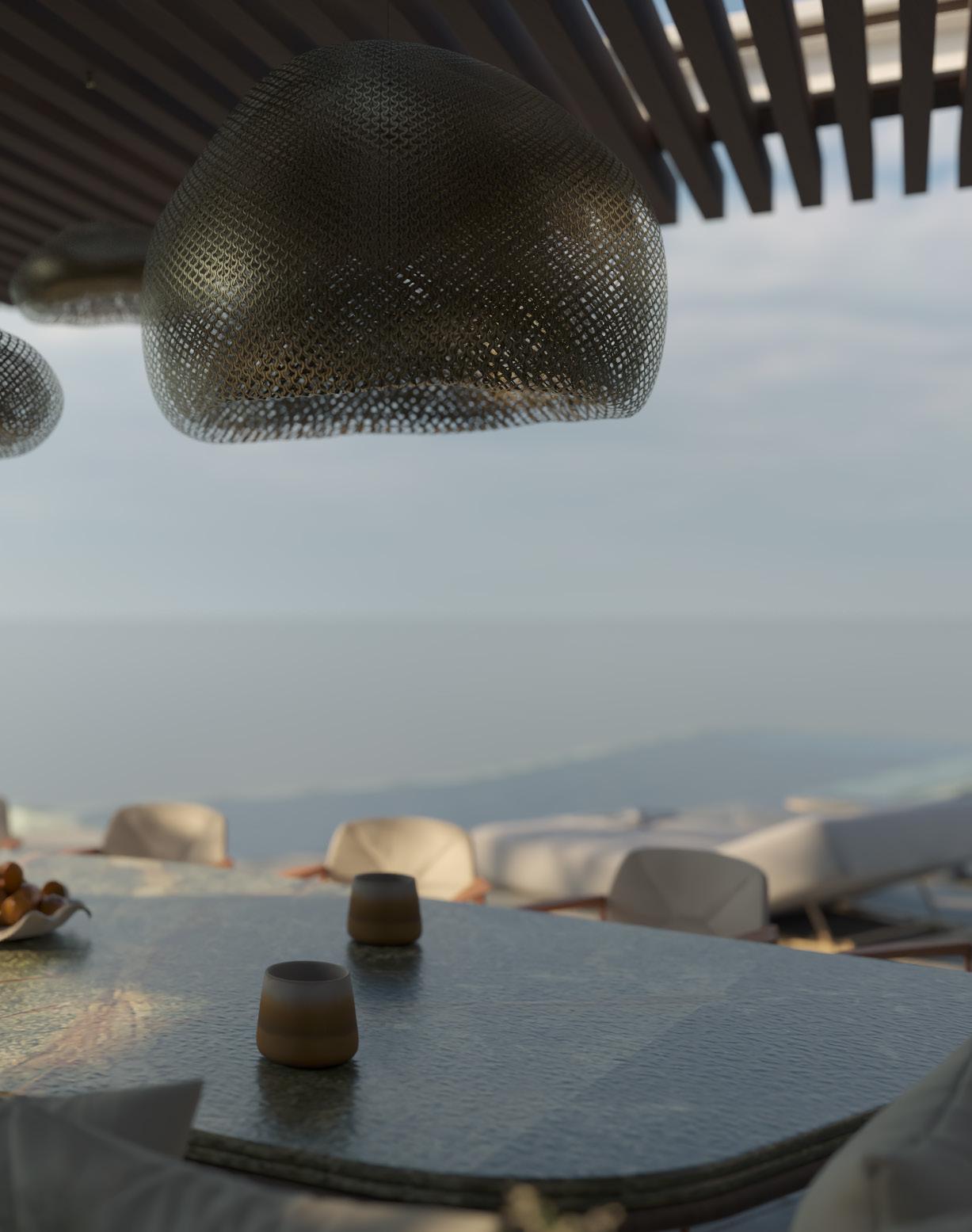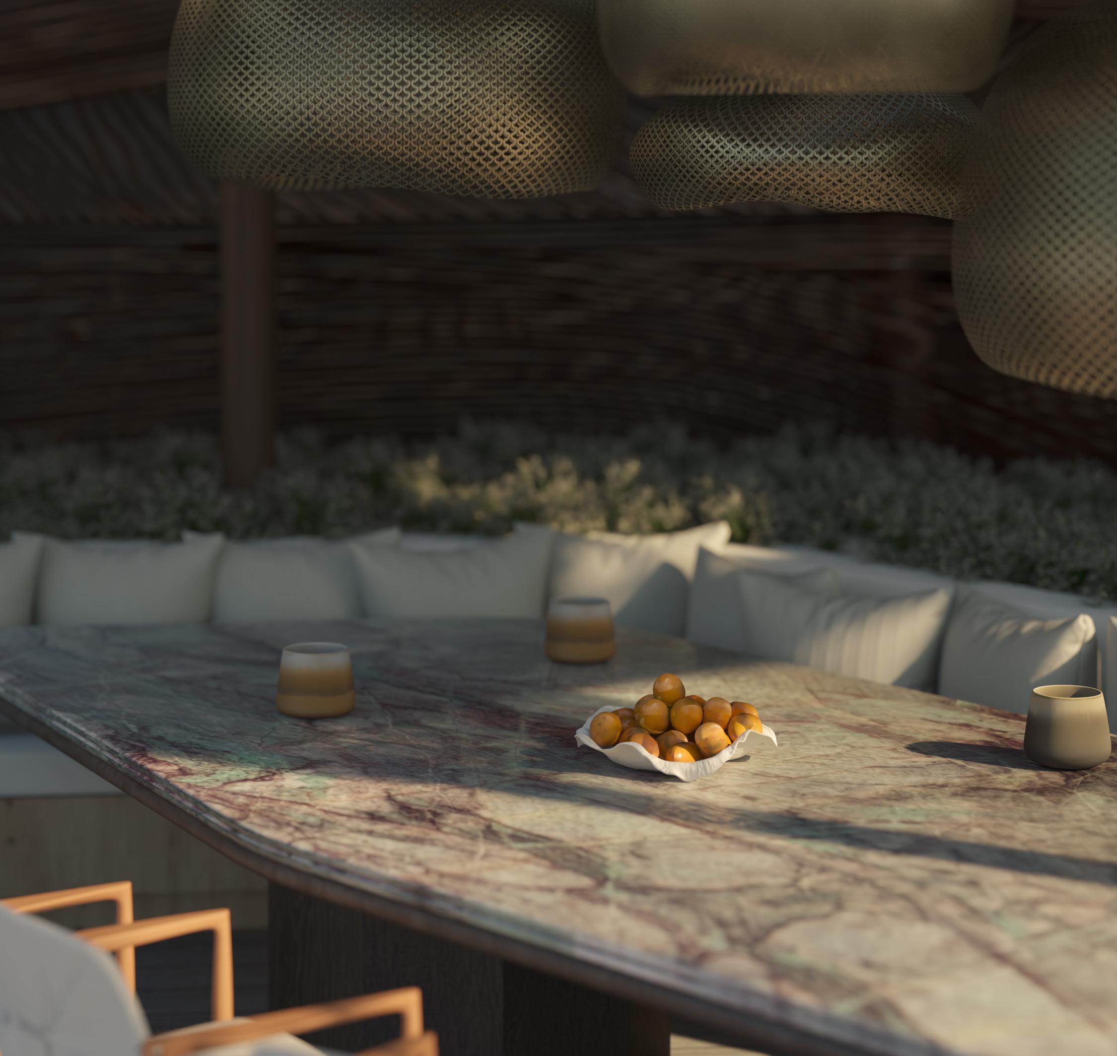 Pour cela, nous avons imaginé cinq suspensions en laiton naturel, dessinées en fil pour offrir légèreté et transparence. Avec le temps, leur patine viendra se fondre dans l’environnement, dialoguant subtilement avec les textures du bois sculpté et de la pergola. La lumière, pensée comme une matière vivante, se diffuse depuis l’intérieur des lampes et se prolonge grâce à des spots intégrés à la structure, projetant sur la table un jeu d’ombres et de lumière comme une dentelle mouvante.