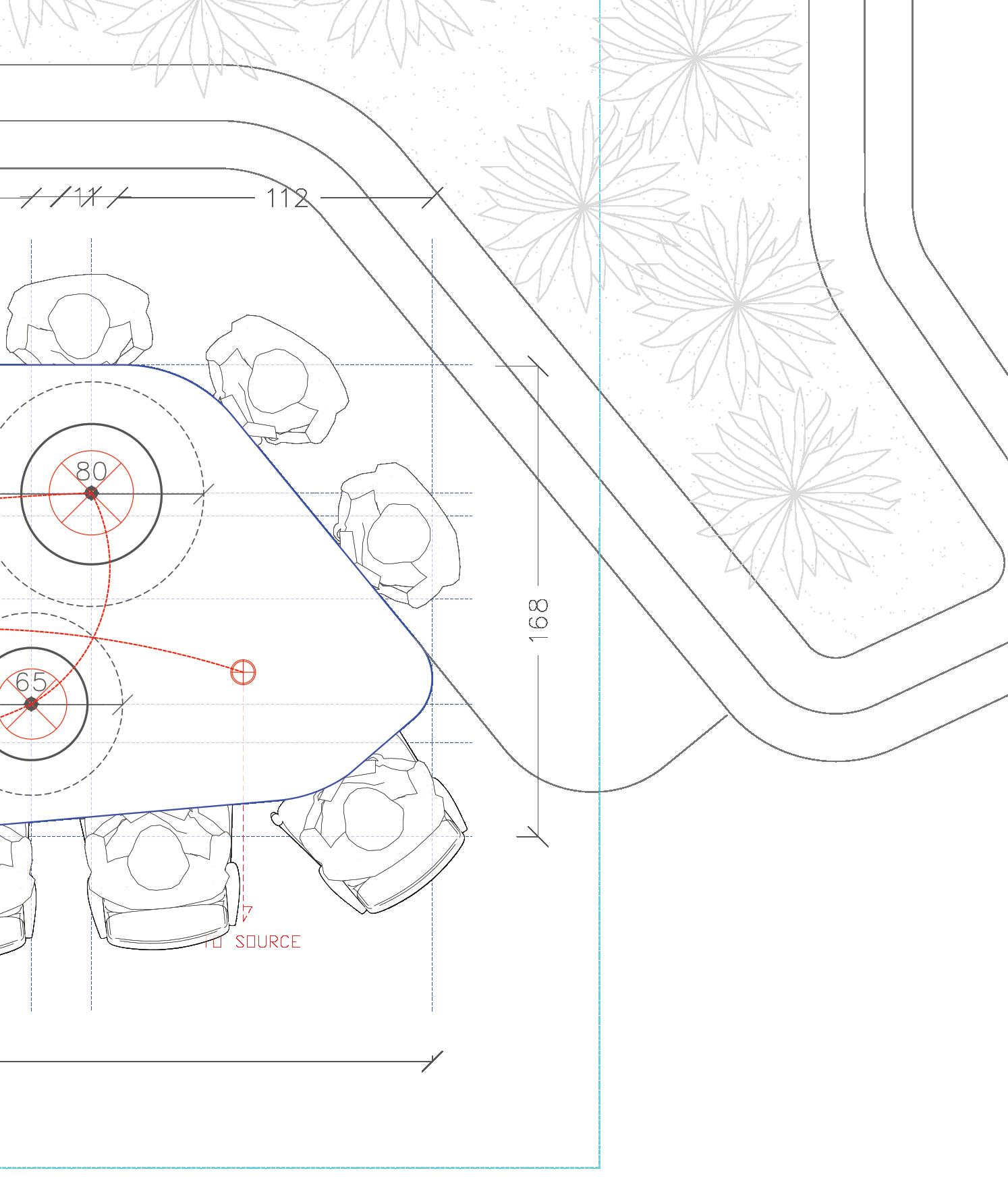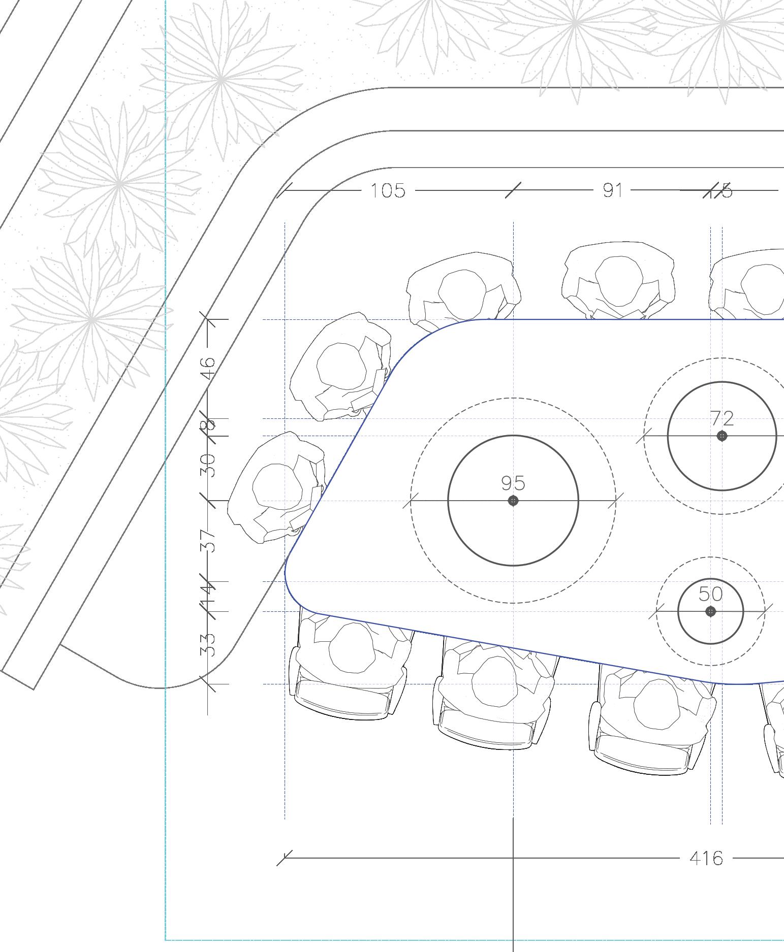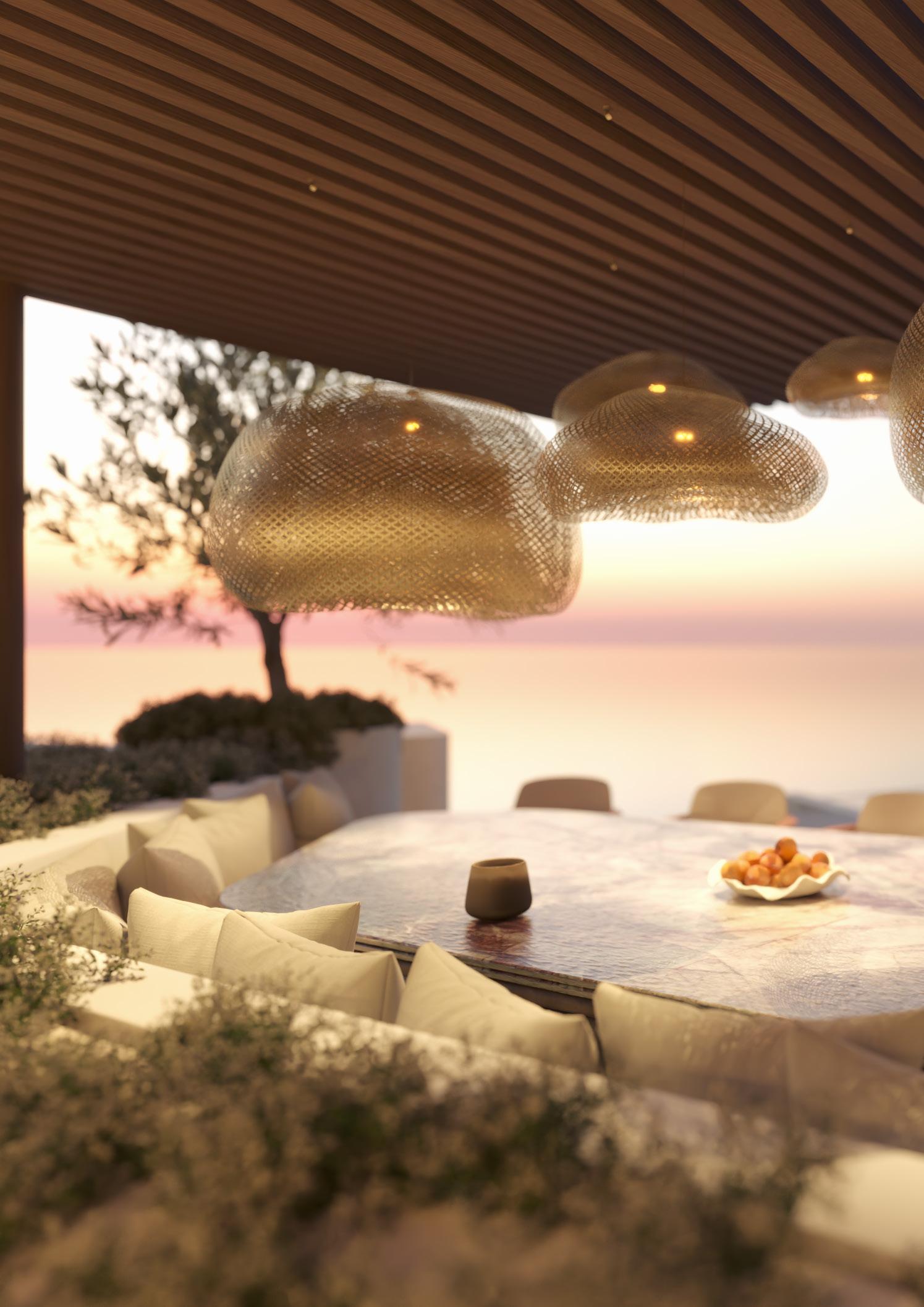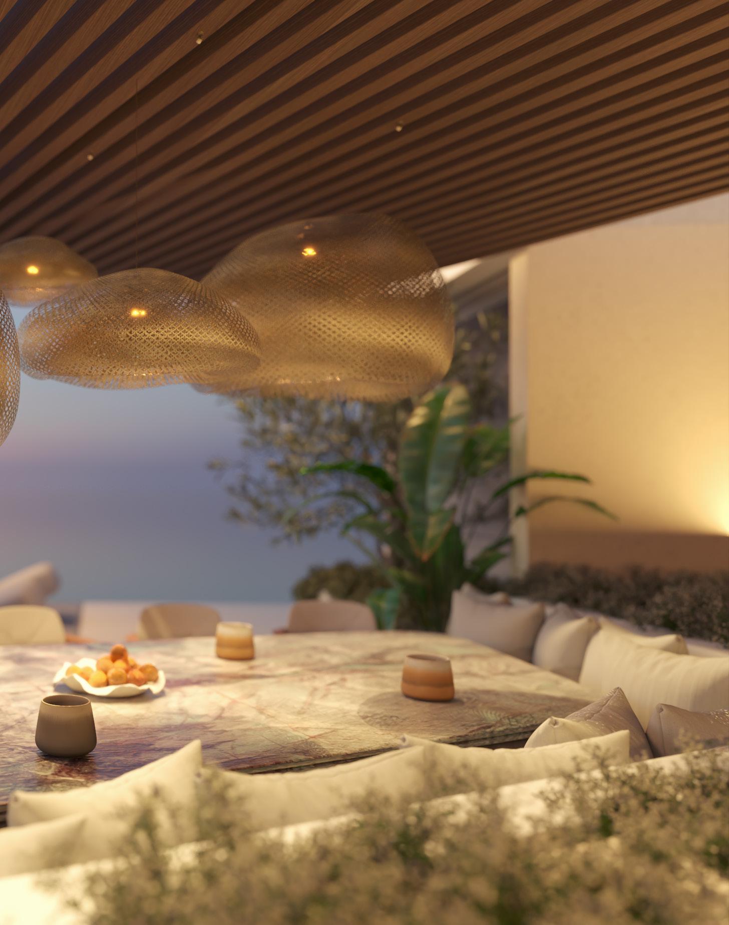 Pour cela, nous avons imaginé cinq suspensions en laiton naturel, dessinées en fil pour offrir légèreté et transparence. Avec le temps, leur patine viendra se fondre dans l’environnement, dialoguant subtilement avec les textures du bois sculpté et de la pergola. La lumière, pensée comme une matière vivante, se diffuse depuis l’intérieur des lampes et se prolonge grâce à des spots intégrés à la structure, projetant sur la table un jeu d’ombres et de lumière comme une dentelle mouvante.