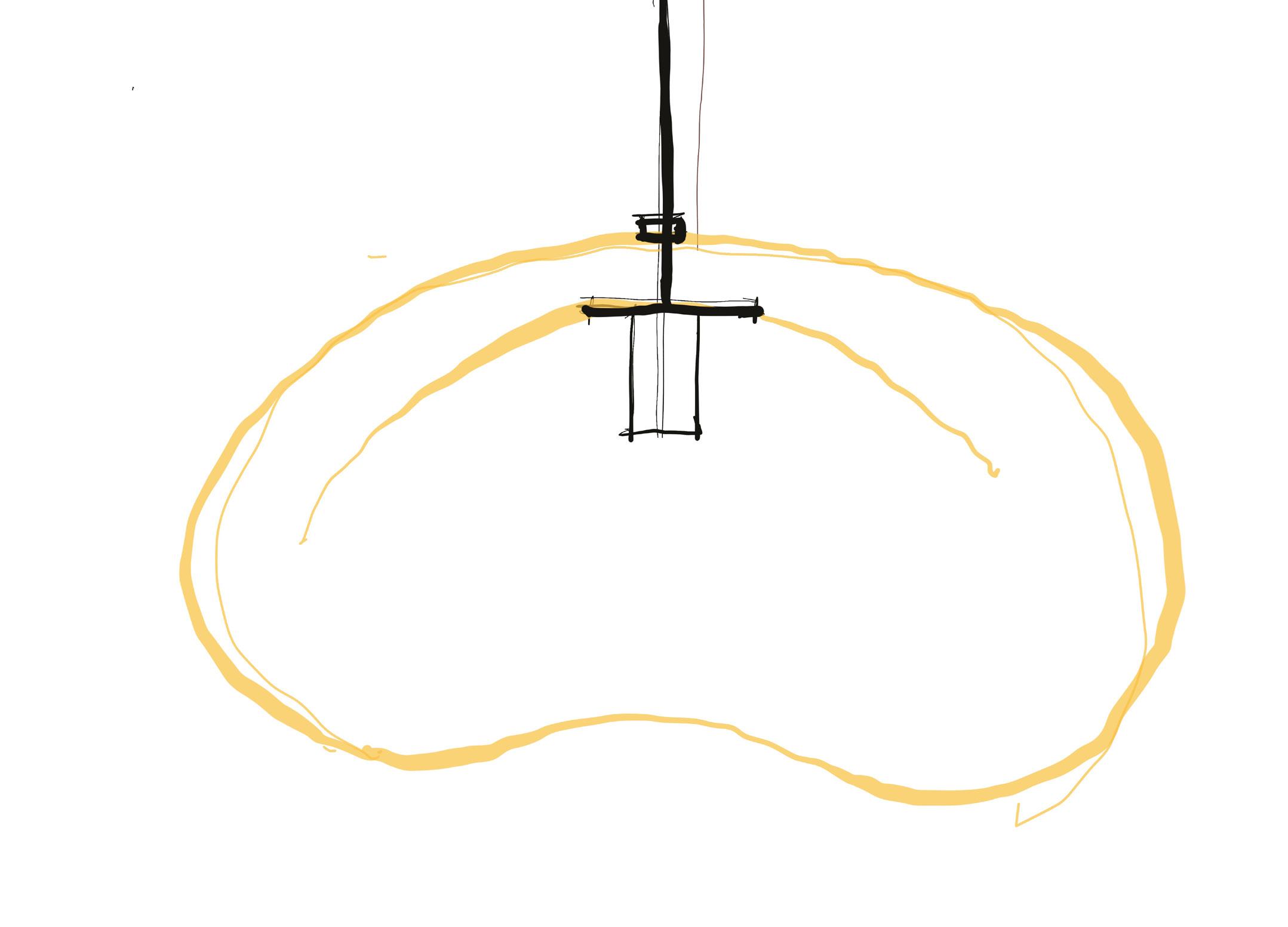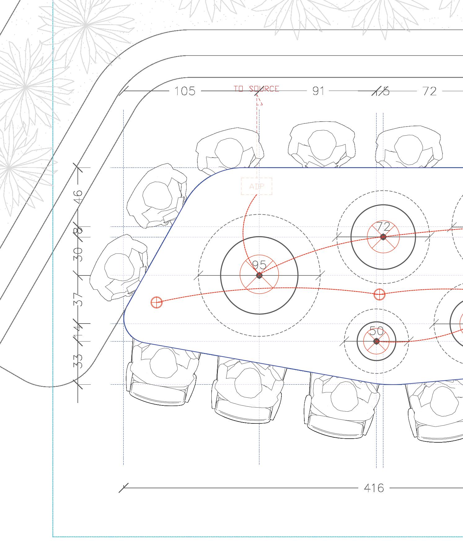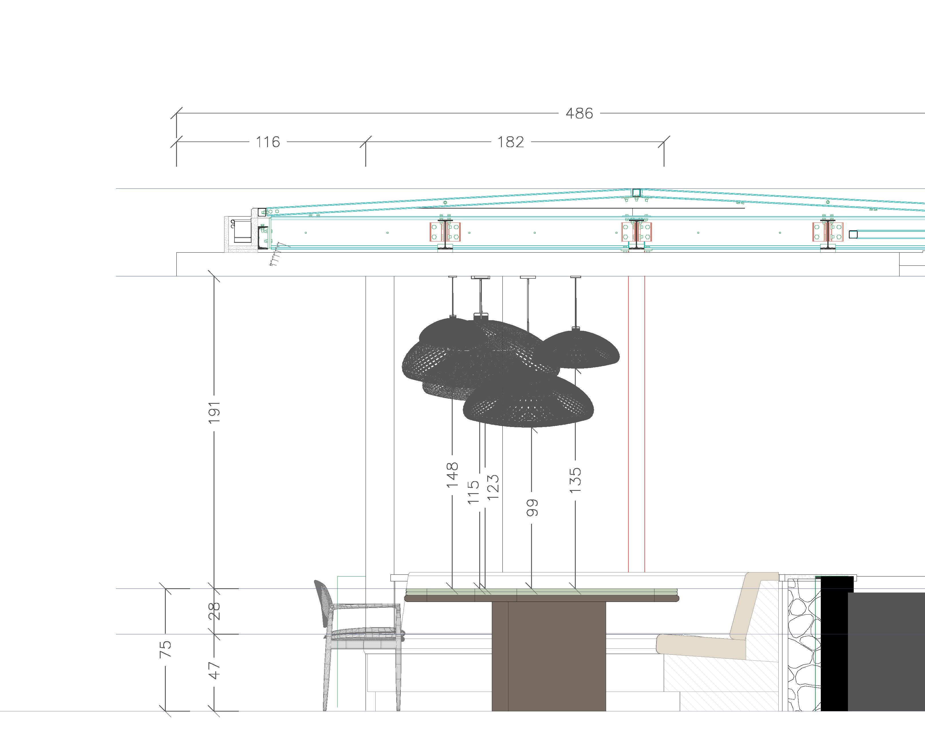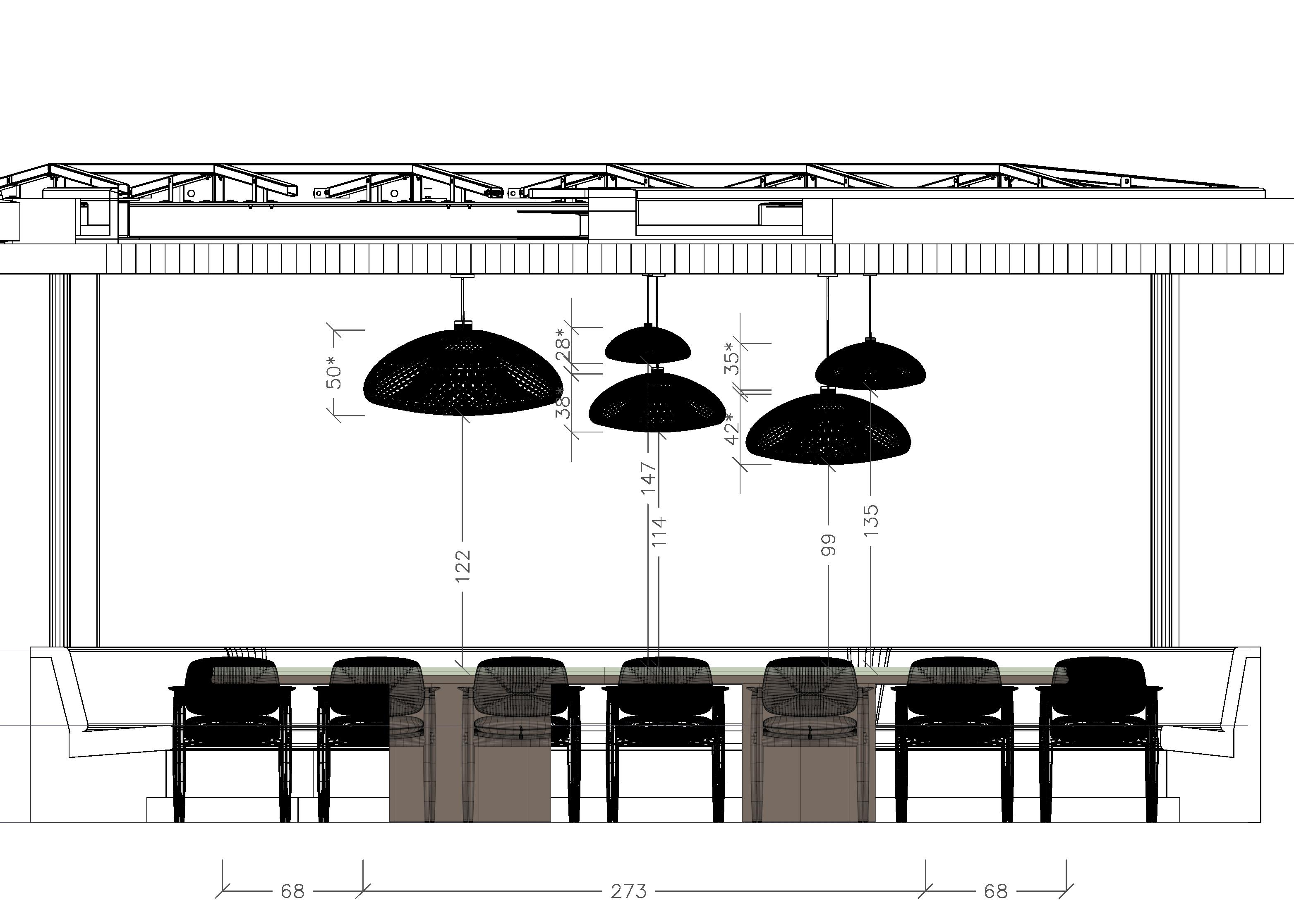 To maintain clean lines, the lamps can be connected to a custom or multi-outlet ceiling canopy, with adjustable cords to fine-tune each drop. Using warm white bulbs (2700–3000K) enhances the soft, diffused glow through the woven wire, while the natural irregularity of each handwoven lamp adds depth and individuality to the overall arrangement. ELEVATION