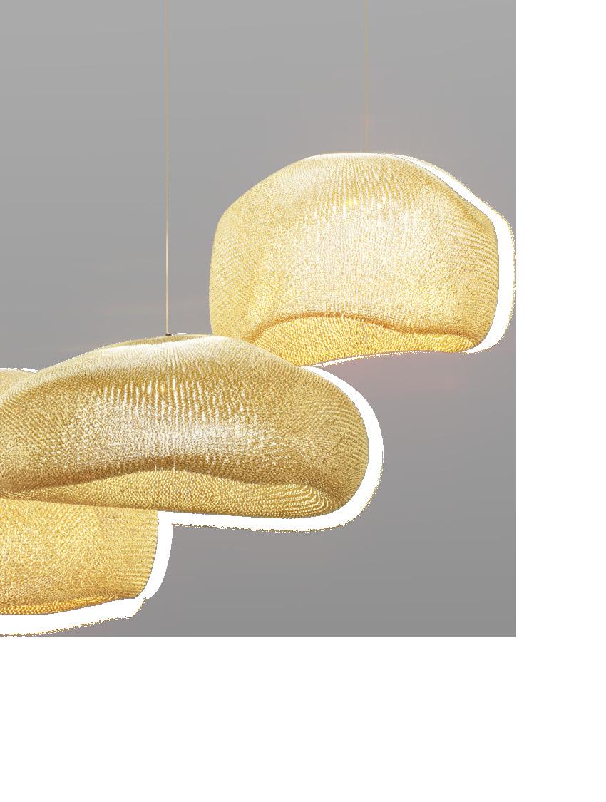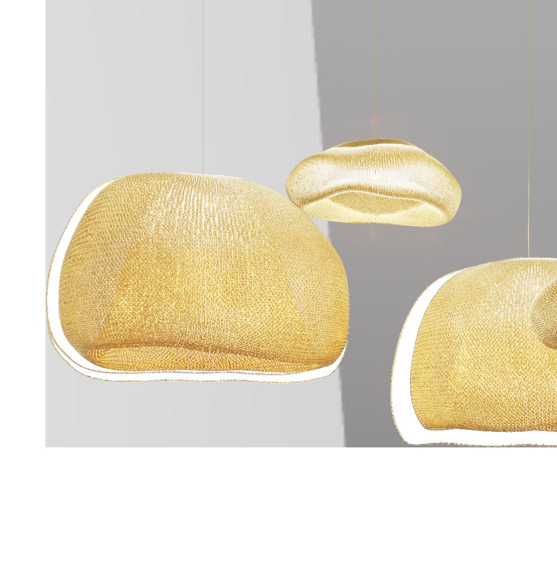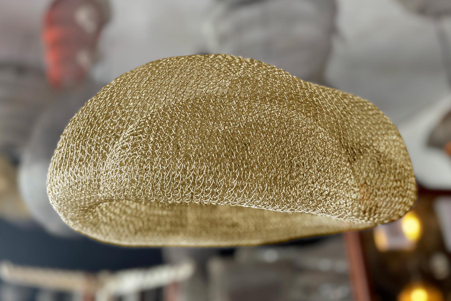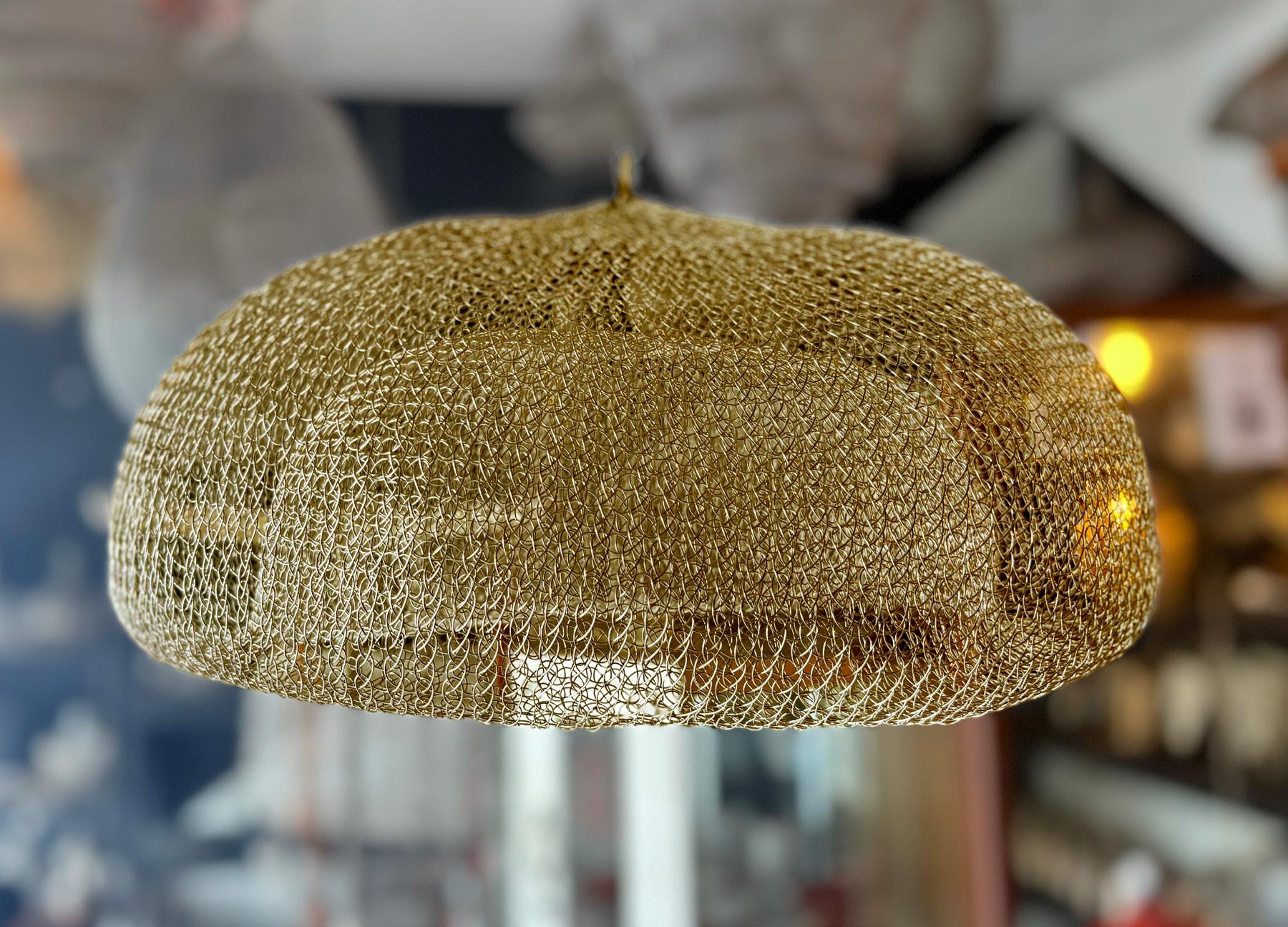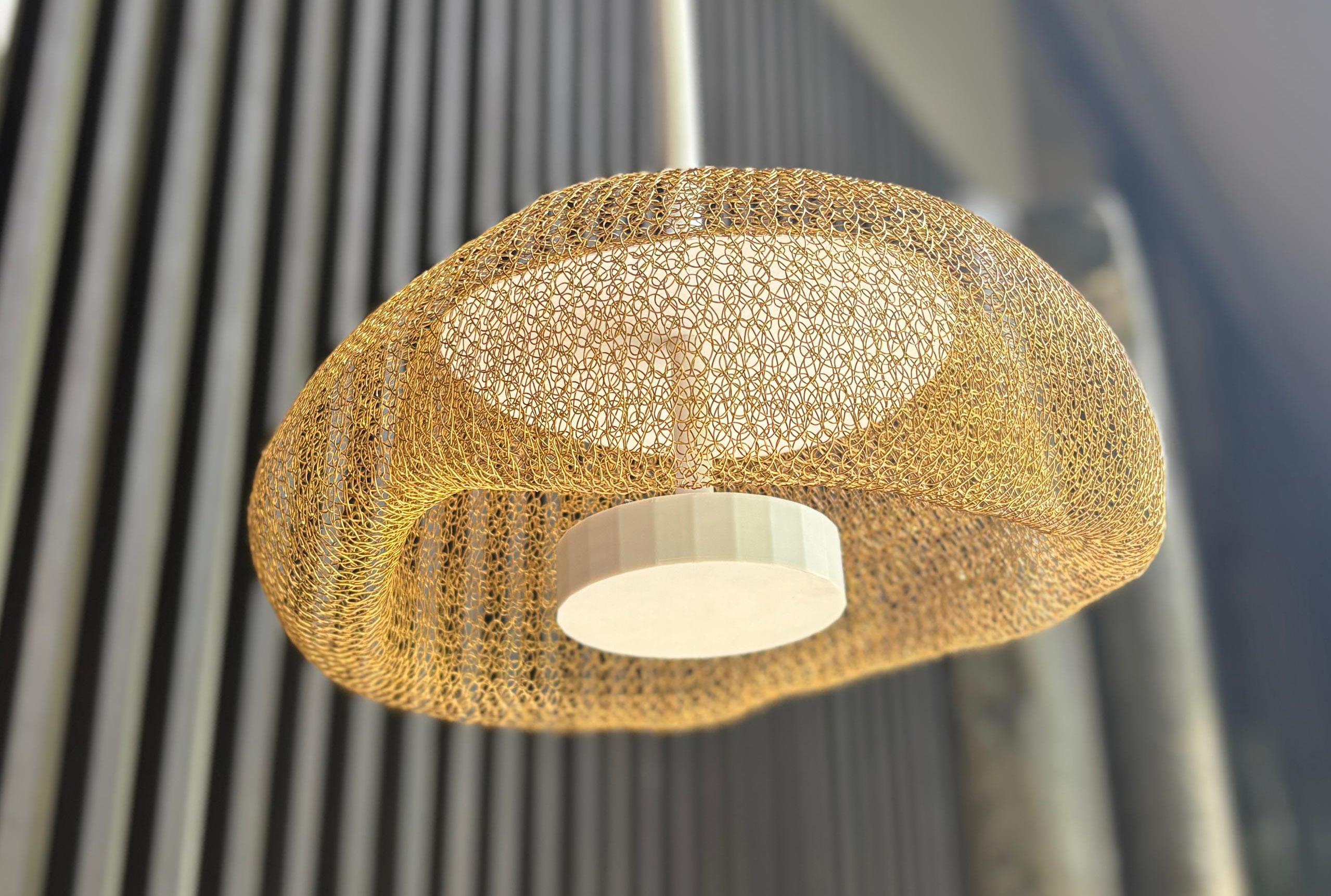 In this pendant lamp design, the lamp fitting is intentionally hidden from the underside view to preserve the aesthetic purity of the woven wire material and to enhance the overall visual experience. The goal is to show only the light, not the source. The material used for the fitting is matched with the pendant : BRASS.