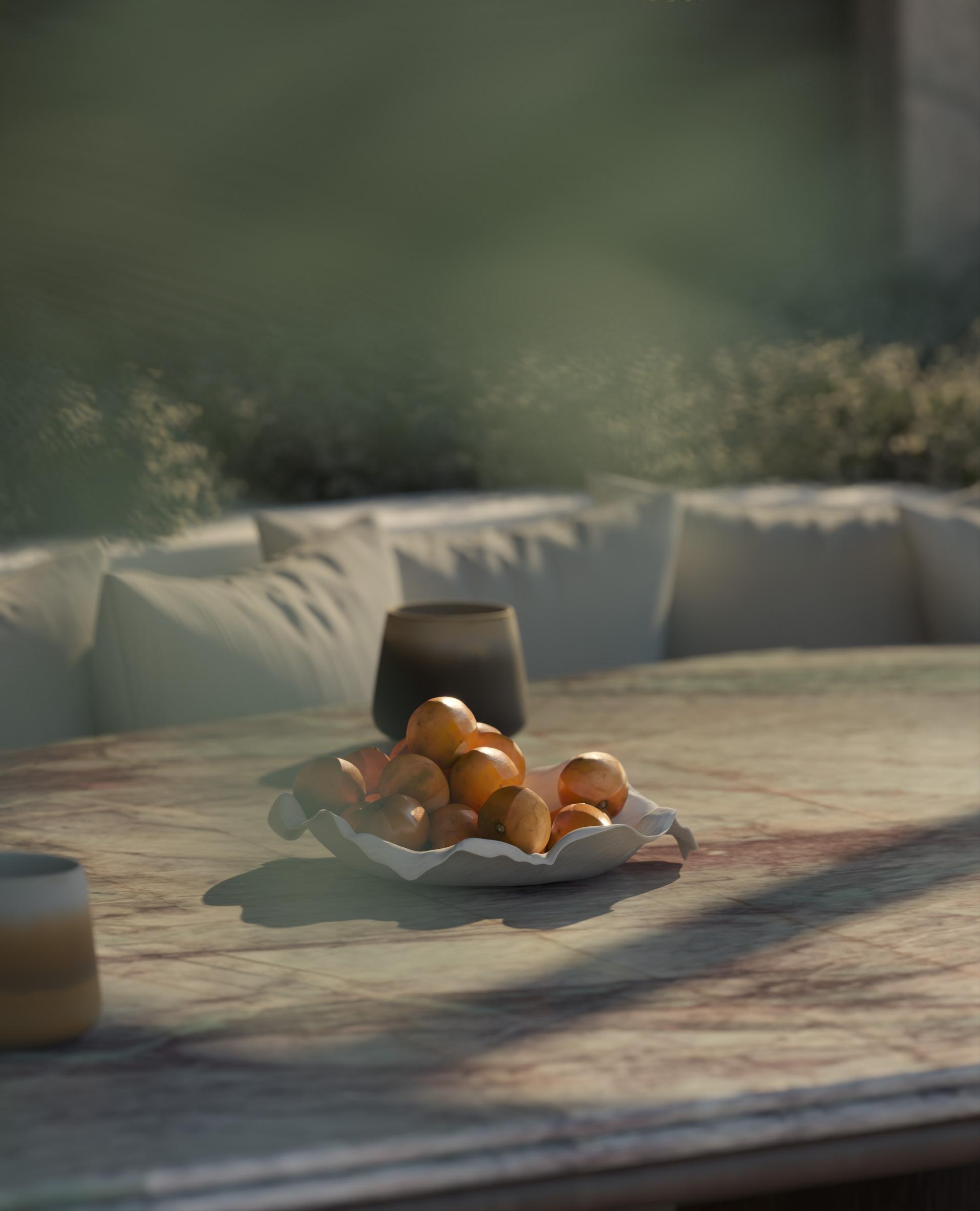 Dans les deux cas, le travail des tranches et des pieds adopte un dessin organique, assurant que la table s’intègre naturellement dans l’ensemble, en harmonie avec l’art, la lumière et l’architecture.