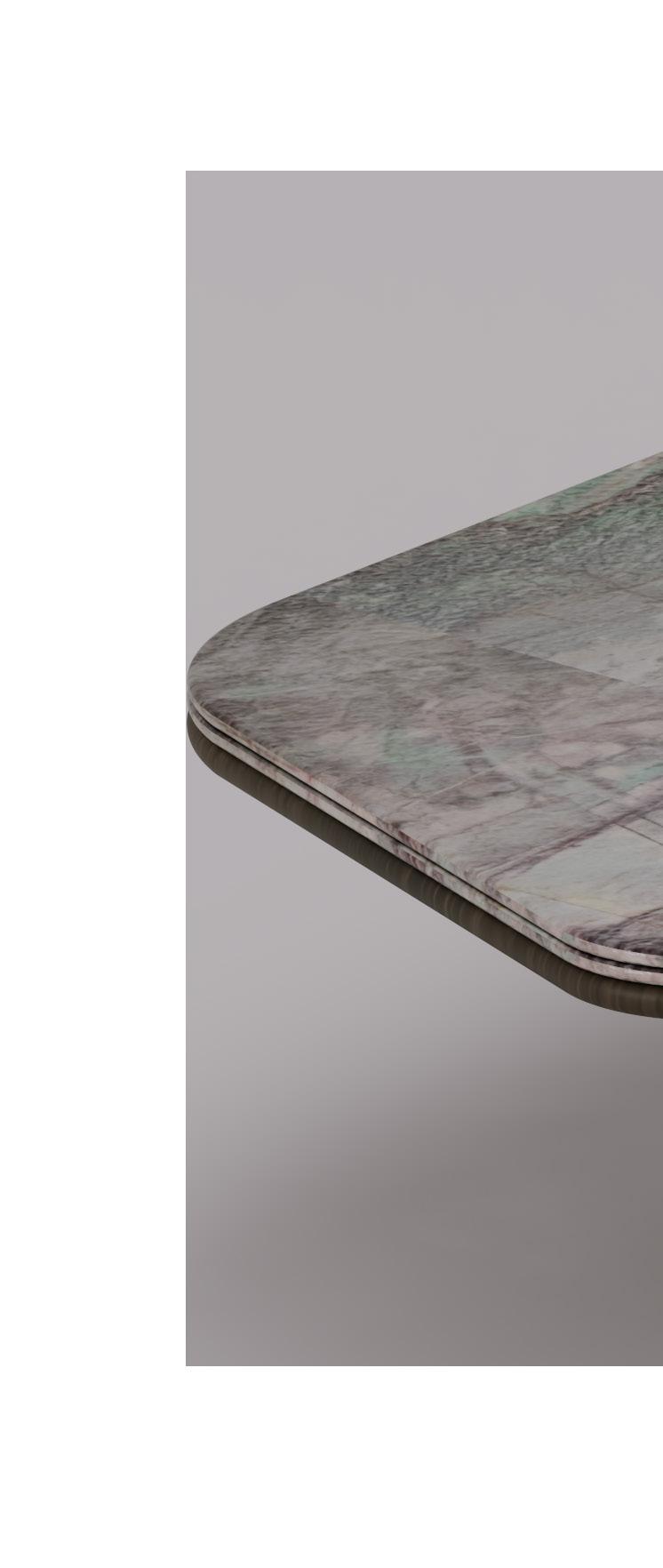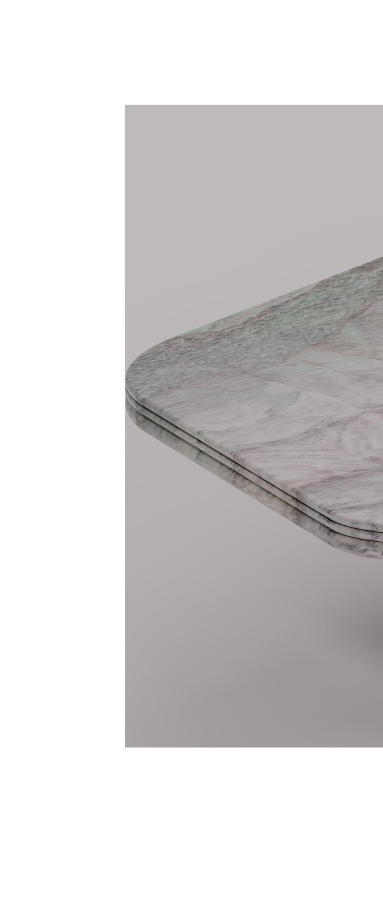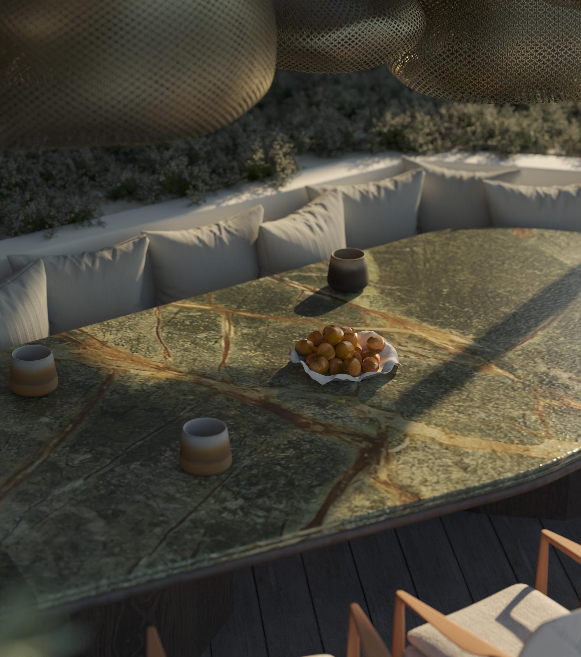 At the heart of this collaboration lies the striking Botanical Green marble tabletop, chosen for its cool tones and natural elegance. Its deep green surface, veined with organic patterns, brings a touch of the outdoors into the space while maintaining a refined, sophisticated presence. the table