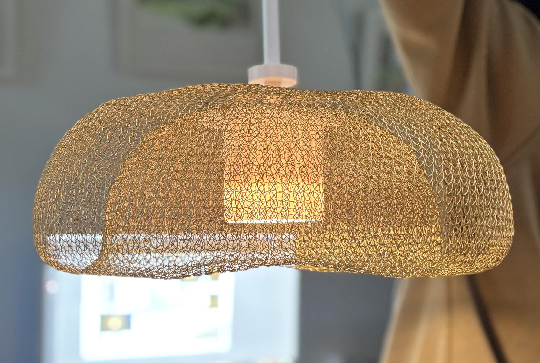 The light ambience from a woven wire pendant lamp is soft, atmospheric, and layered with texture. As light filters through the intricate mesh of fine wire, it creates a gentle, diffused glow rather than a harsh beam, making the space feel warm and inviting. The open weave design allows subtle shadows to dance across nearby surfaces, adding depth and visual interest to walls and ceilings.