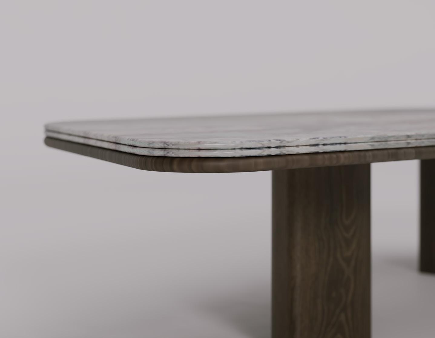 The table features selected marble top with a leather finish, supported by solid wood legs. Precision joinery ensures structural stability, while the contrast between materials offers a refined and timeless design.