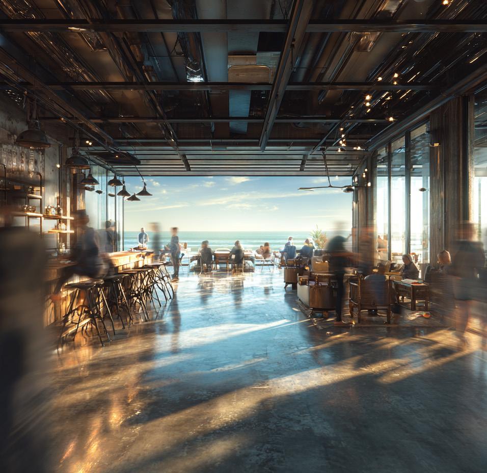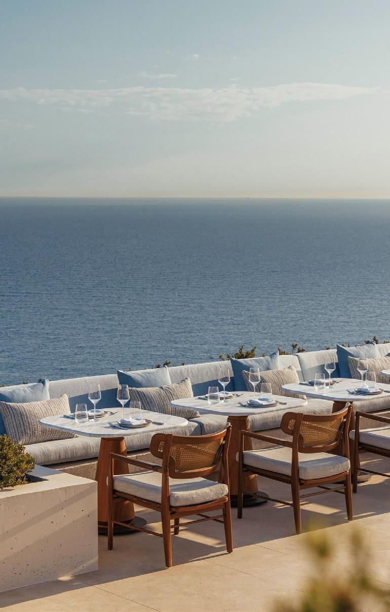 Aerial perspective of restaurant and floating pool revealing the project’s serene connection to the beach.