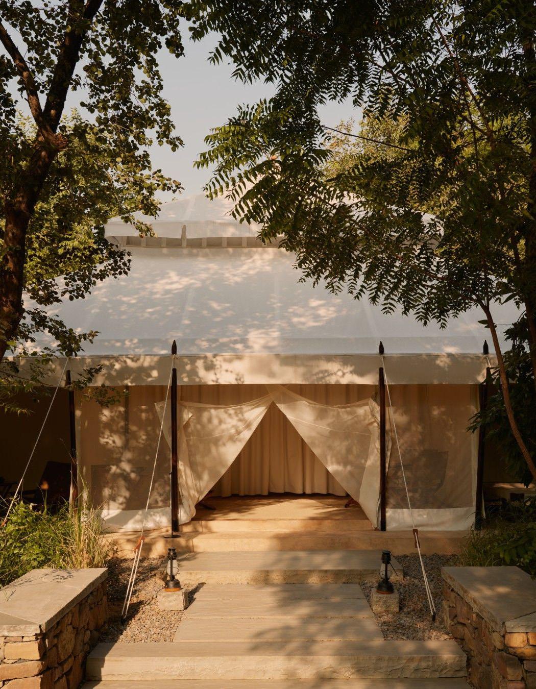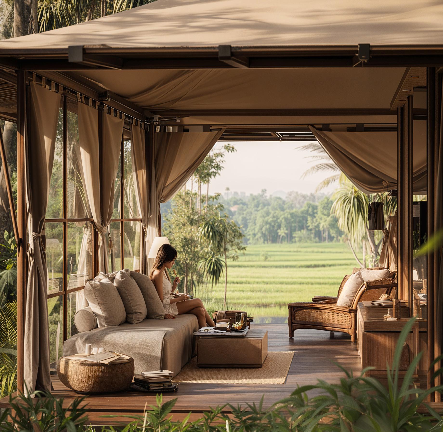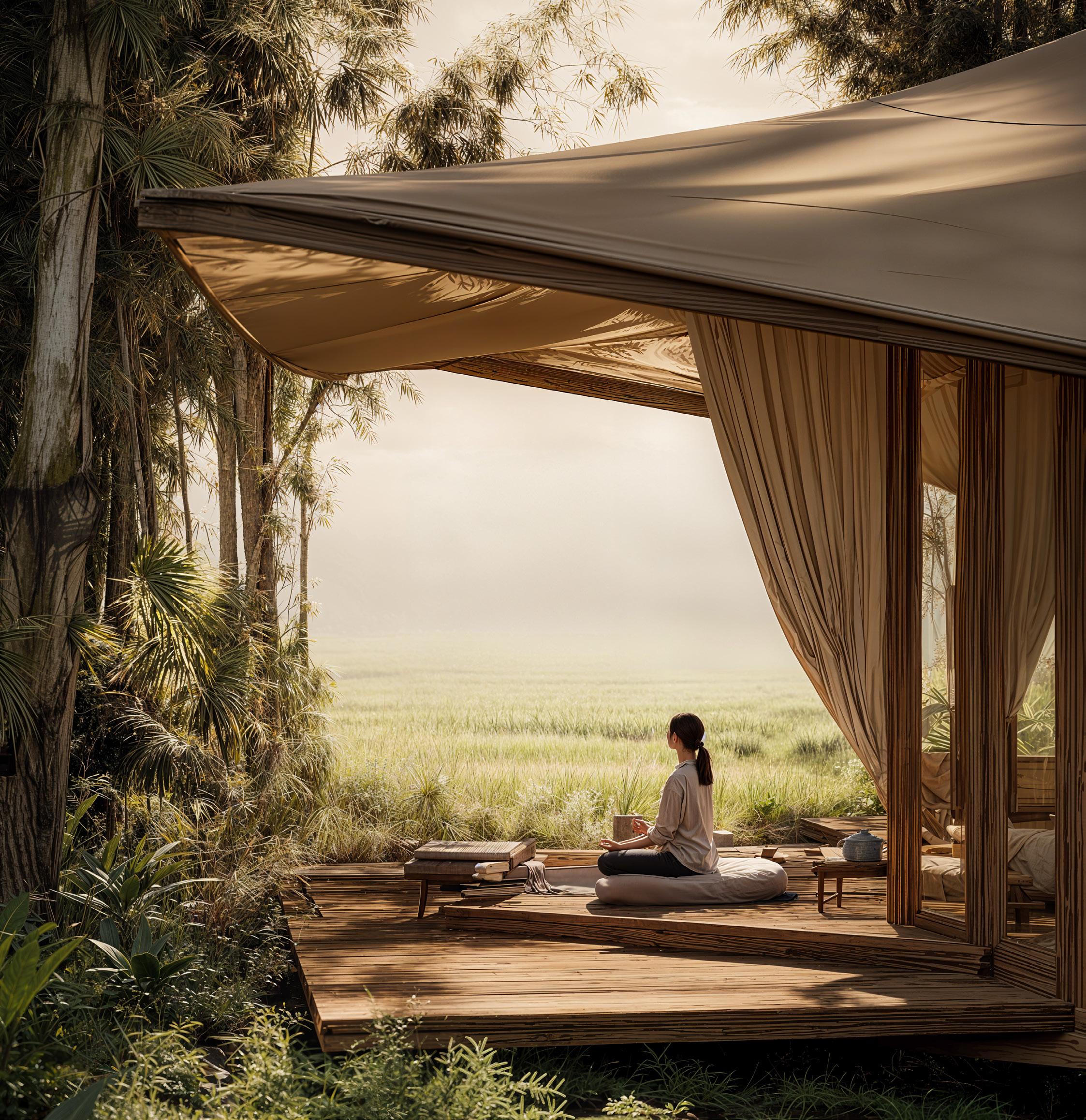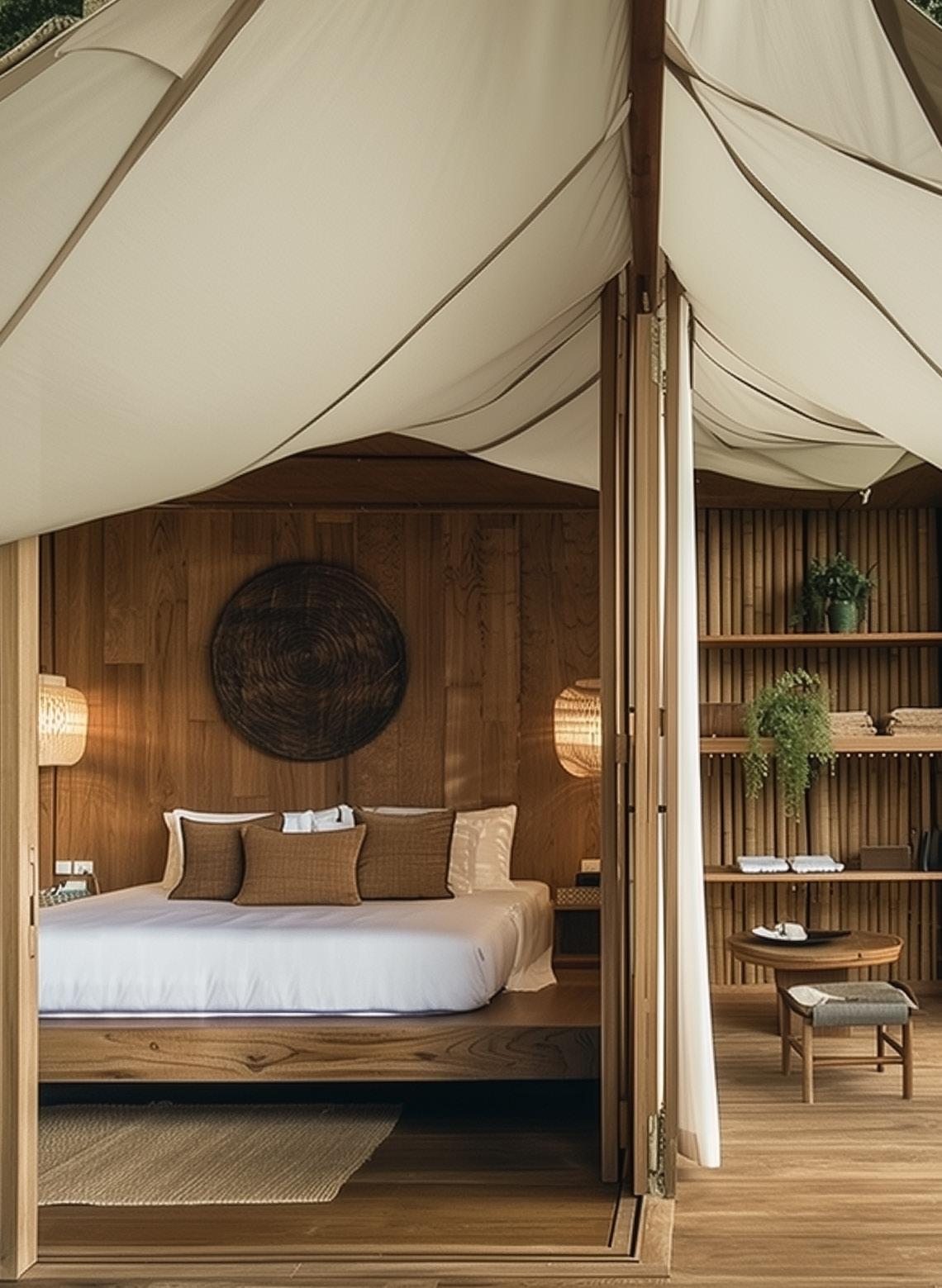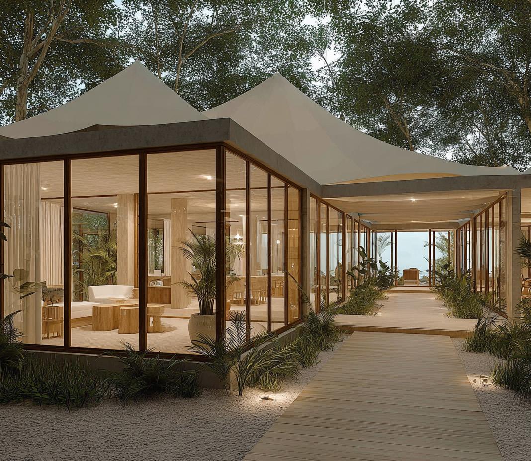 The design language celebrates simplicity and material honesty. uxury tent-style architecture with modular forms, neutral color palette in beige, sand, and taupe tones. Elegant canvas roofs, light structural frames, and open airy interiors blending seamlessly with the landscape.