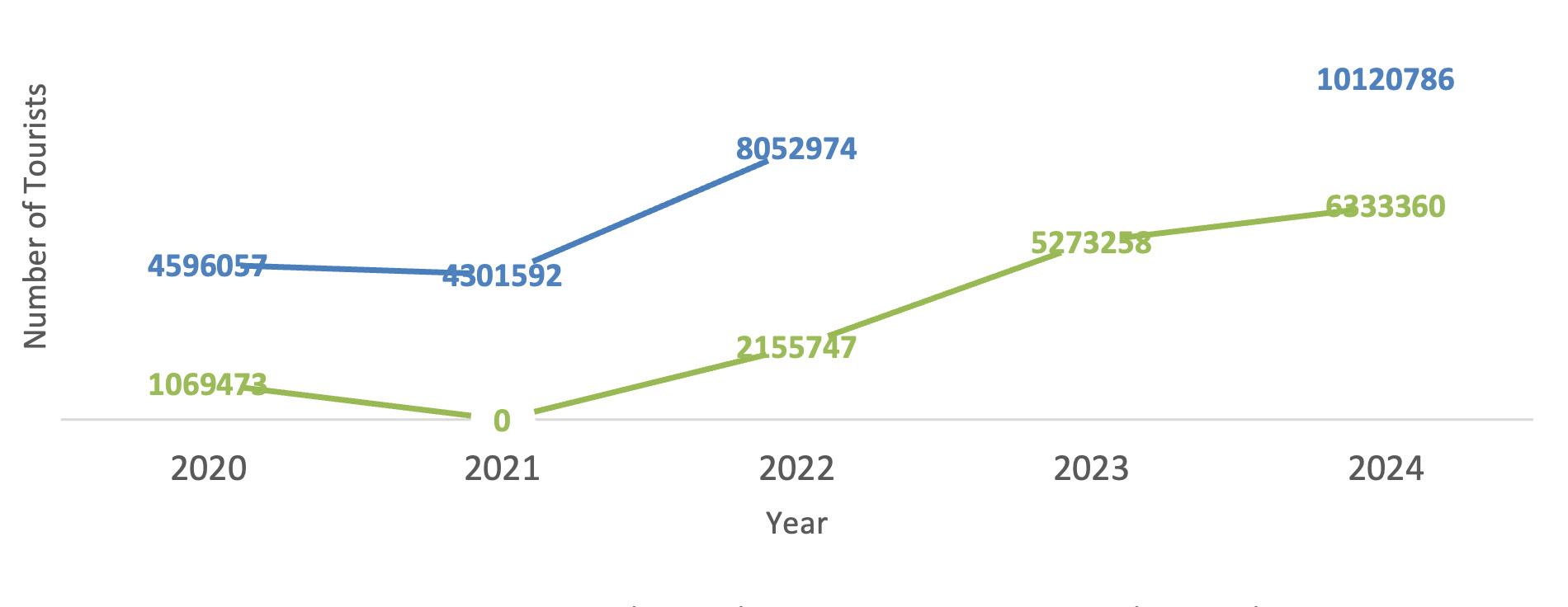 The graphic shows Bali’s tourist recovery from 2020–2024. After a sharp pandemic decline, both domestic and international visitors rose steadily, reaching and surpassing pre-COVID levels by 2024.