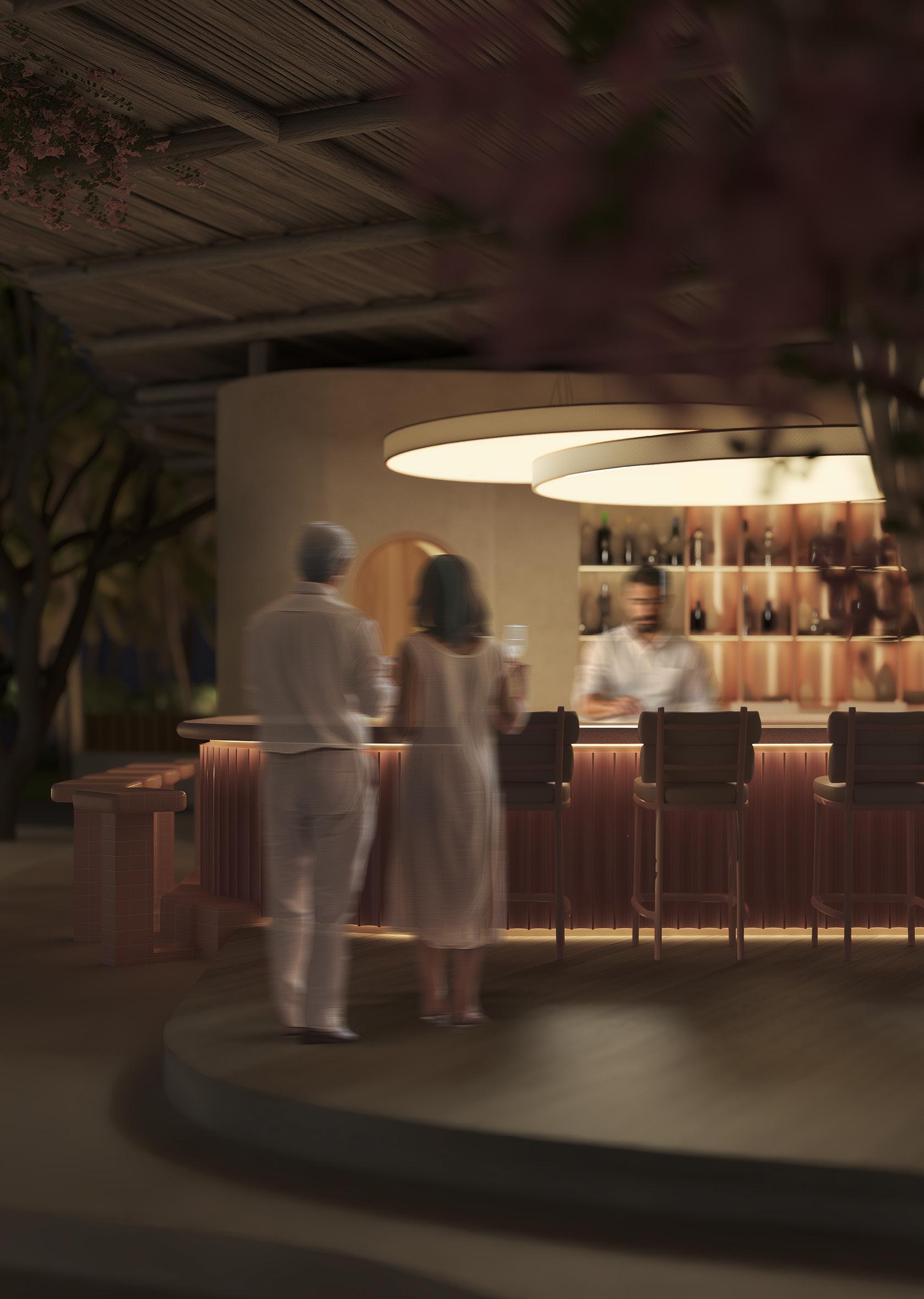 Tucked beneath the soft shadows of tropical foliage and kissed by the last light of day, The Pink Bar glows like a secret waiting to be told. With curves that echo the rhythm of conversation and a blush tone that feels both bold and tender, it is not just a bar. It is an experience wrapped in color, mood, and memory.