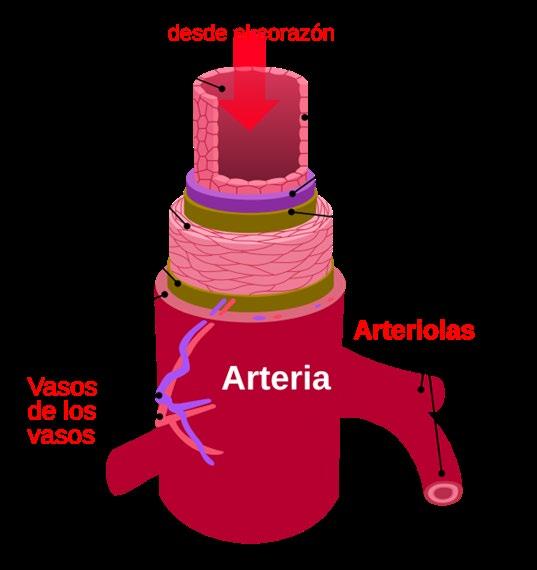 Túnica media: la capa media, formada por músculo liso y fibras elásticas, que permite a las arterias expandirse y contraerse.