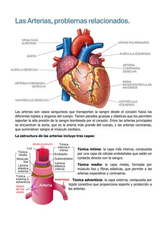 Las arterias son vasos sanguíneos que transportan la sangre desde el corazón hacia los diferentes tejidos y órganos del cuerpo. Tienen paredes gruesas y elásticas que les permiten soportar la alta presión de la sangre bombeada por el corazón. Entre las arterias principales se encuentran la aorta, que es la arteria más grande del cuerpo, y las arterias coronarias, que suministran sangre al músculo cardíaco.