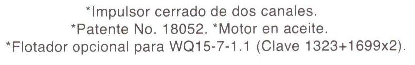CLAVE MODELO POTENCIA MOTOR H MÁX RANGO OPERACIÓN DESC FLOTADOR HP W H (m) Q (l/m) 2574 WQY370 ½ 443 127V 60Hz 6 7 6 7 0 66 268 NPT 2" SI 2575 WQY550 ¾ 804 127V 60Hz 7 6 7 6 0 66 291 NPT 2" SI