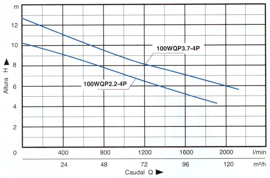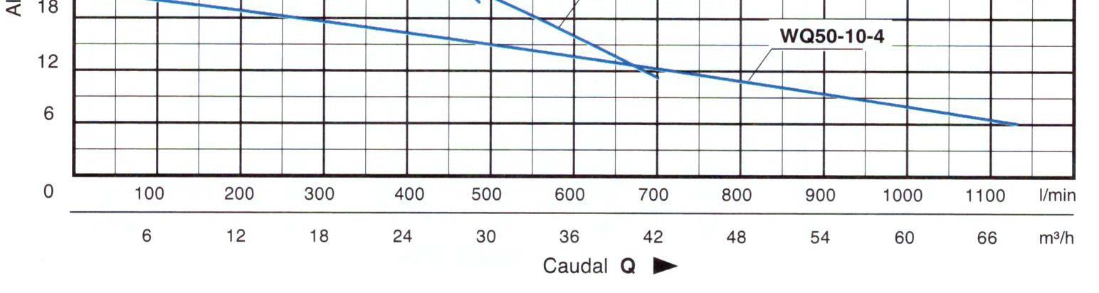 Bomba Sumergible Línea Americana para Agua Sucia CLAVE MODELO POTENCIA MOTOR H MÁX RANGO OPERACIÓN DESC PASO SÓLIDOS Dimensiones Peso HP KW H (m) Q (l/m) 1127 100WQ100 22 15 20 15 3F 220V 28 24 14 1400 3750 4" 1 5" 540x410x1210 280Kg 1128 150WQ200 12 15 20 15 3F 220V 18 16 5 1500 5800 6" 2" 560x500x1210 350Kg 1129 150WQ100 28 18 5 25 18 5 3F 220V 31 30 10 800 4500 6" 2" 580x450x1030 380Kg 1130 200WQ300 12 18 5 25 18 5 3F 220V 18 16 3 2000 9000 8" 2" 670x570x1510 480Kg 1131 100WQ150 22 22 30 22 3F 440V 37 30 16 830 3590 4" 2" 580x450x1030 380Kg 1132 150WQ150 22 22 30 22 3F 440V 28 24 9 1500 6300 6" 2" 580x450x1030 380Kg 1133 200WQ250 17 22 30 22 3F 440V 23 21 3 1700 9300 8" 2" 670x570x1510 520Kg 1334 150WQ150 36 30 40 30 3F 440V 45 37 10 1700 9200 6" 2" 730x560x1740 800Kg 1135 200WQ360 16 30 40 30 3F 440V 22 18 6 3300 12600 8" 2" 850x650x1850 800Kg 1136 200WQ250 25 37 50 37 3F 440V 35 26 8 1800 14160 8" 2 5" 850x650x1850 900Kg 1137 250WQ600 12 37 50 37 3F 440V 18 17 6 4000 16300 10" 2 5" 970x710x1850 1000Kg 1138 200WQ400 24 45 60 45 3F 440V 34 28 10 3300 14200 8" 2" 850x650x1950 1250Kg 1139 250WQ600 20 55 75 55 3F 440V 31 24 8 4700 20000 10" 2 5" 970x710x1950 1400Kg 1140 250WQ600 25 75 100 75 3F 440V 36 28 8 7500 21600 10" 2 5" 102x830x2250 1600Kg
