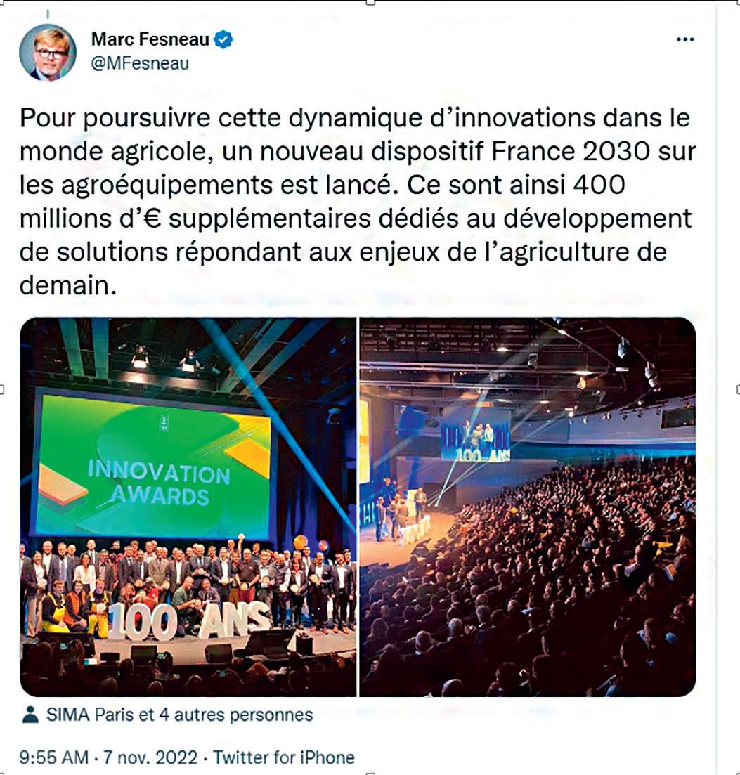 Un fonds de 400 M€ pour l’innovation Afin d’accompagner le secteur dans cette dynamique, Marc Fesneau a annoncé un fonds de 400 M€, dans le cadre de France 2030, sous forme d’un guichet FranceAgriMer. Il s’agit, dans un premier temps, d’aider les industries du machinisme à produire de l’innovation et, dans un second temps, de faciliter l’accès des exploitants à ces innovations.